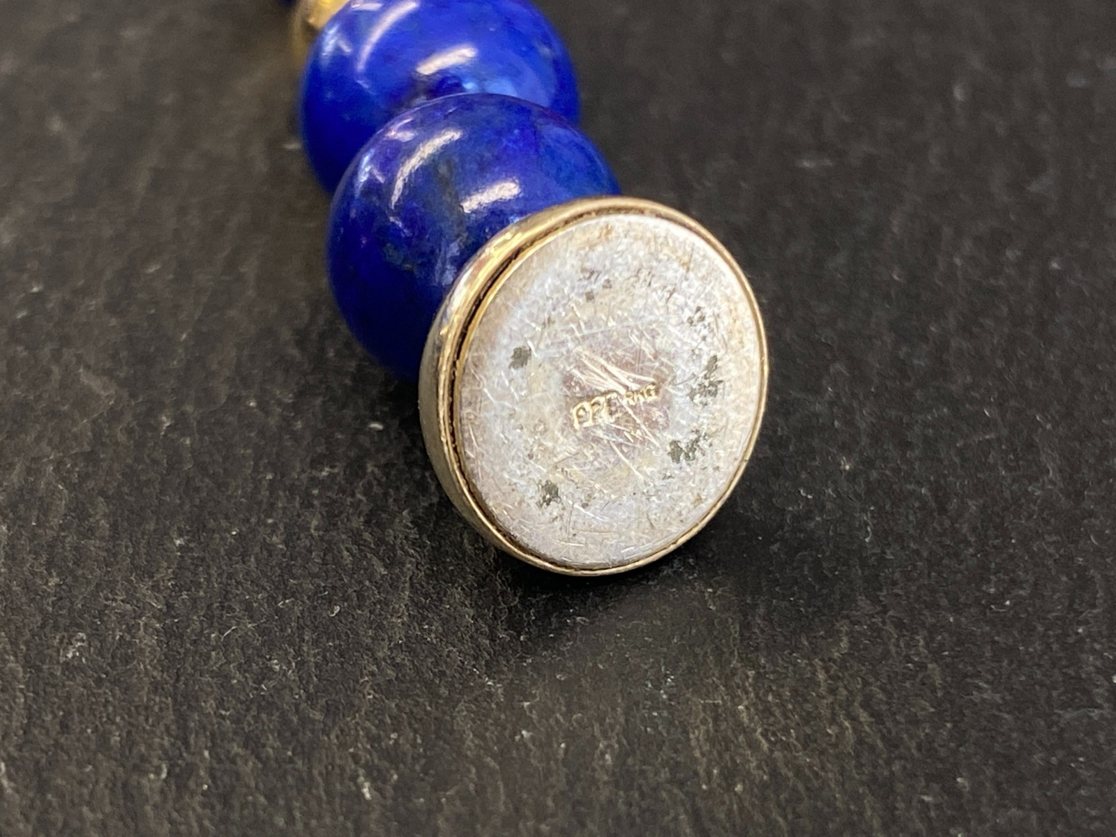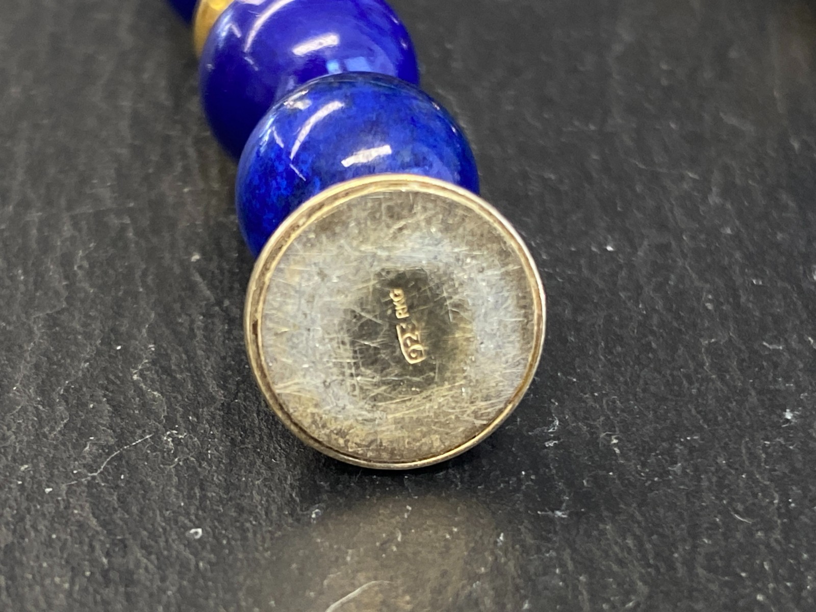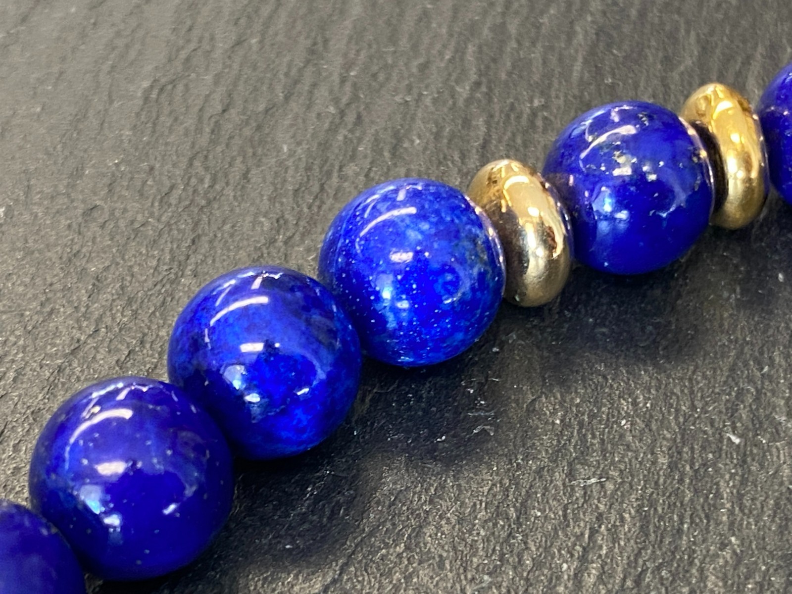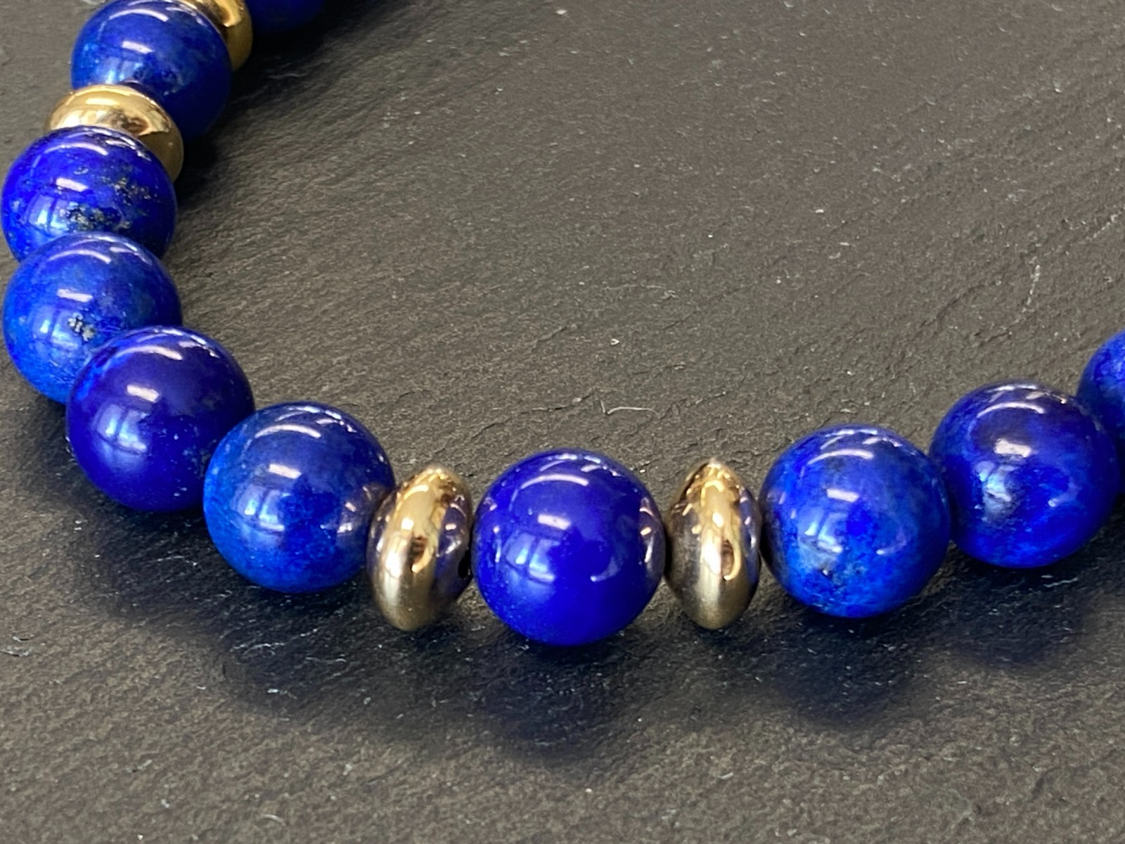 Massive Halskette mit großen Perlen aus Lapis Lazuli, diese haben je einen Durchmesser von ca. 1,2cm. Am Verschluss mit 925 gestempelt, die Dekoelemente zwischen den Perlen sind ebenfalls aus vergoldetem Metall, mit Niton DXL getestet – diese haben zum Teil kleine Dellen. Die Perlen weisen vereinzelt kleinere Strukturrisse auf, an keiner ist etwas abgebrochen. Das Metall ist oxydiert und leicht berieben. Gesamtlänge ca. 44cm, Gesamtgewicht ca. 88,61g. Die Begutachtung der Stücke wird vorgenommen von einem Fachmitglied der deutschen gemmologischen Gesellschaft E.V.