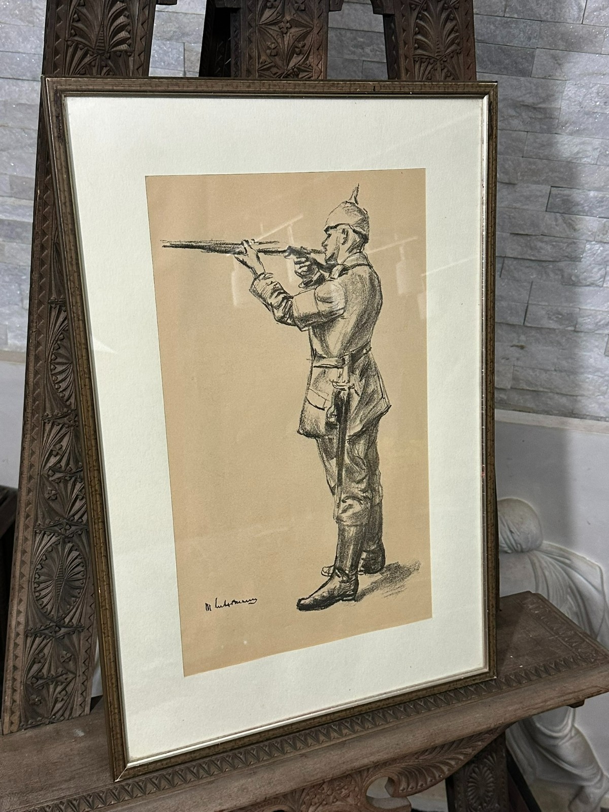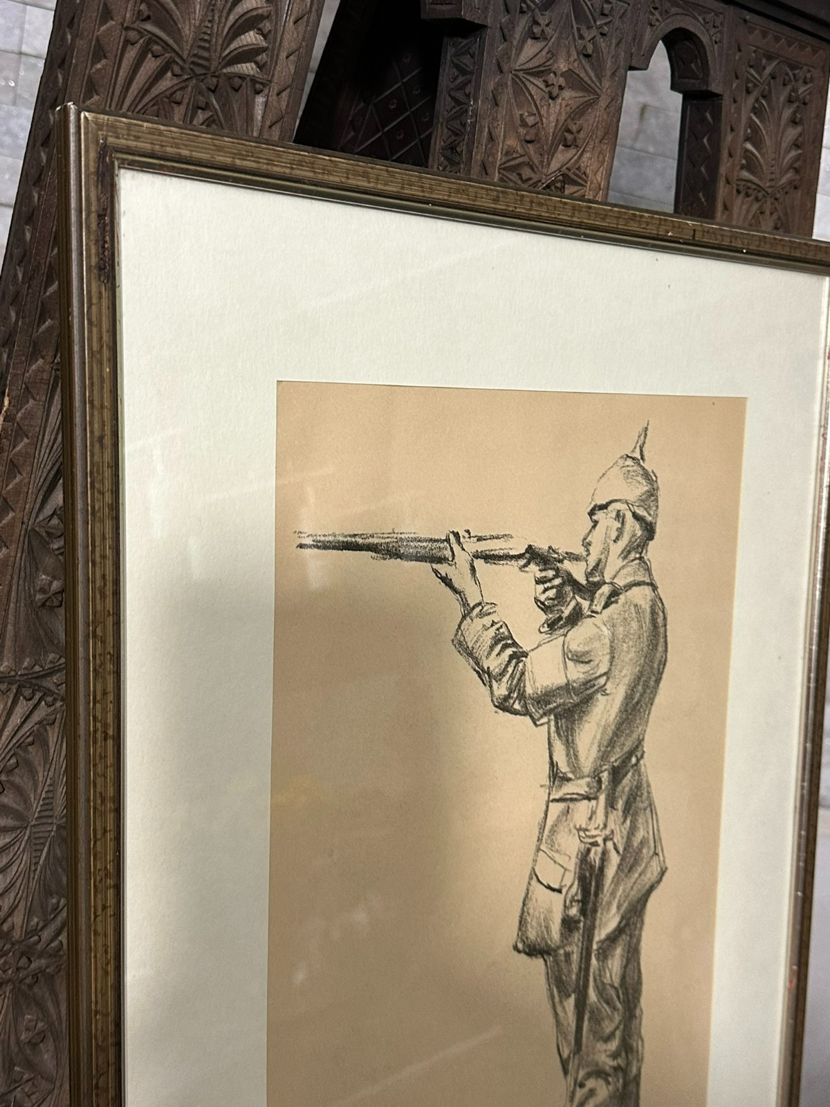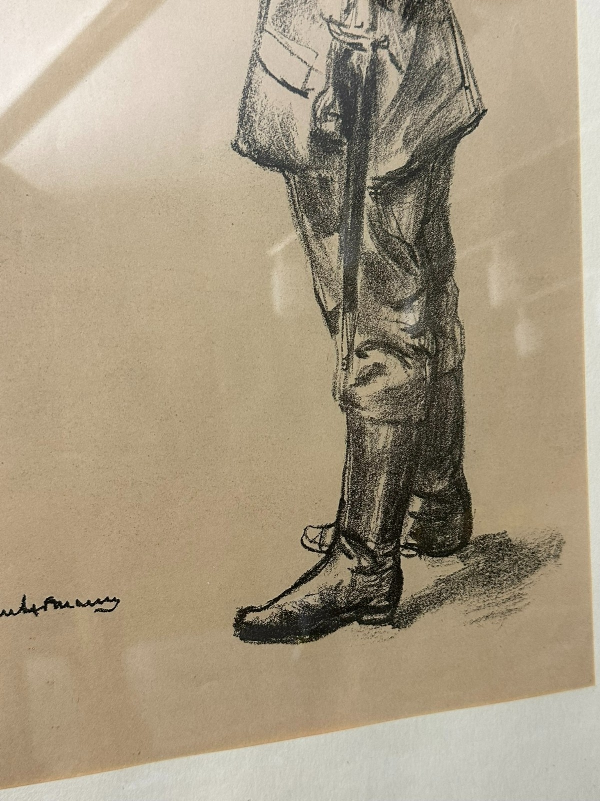 Sehr schöne Lithographie auf Papier, Portrait eines Soldaten, unten links signiert. Das Glas ist hinter Glas gerahmt und befindet sich in sehr schönem Zustand. Abmessungen sichtbar 27x46cm, mit Rahmen 42x62cm. Am Rahmen minimalster Abrieb.