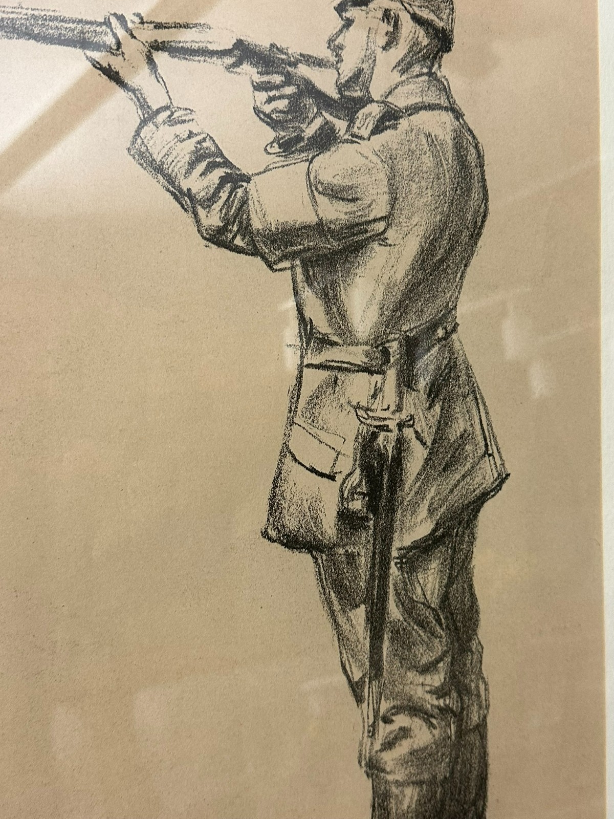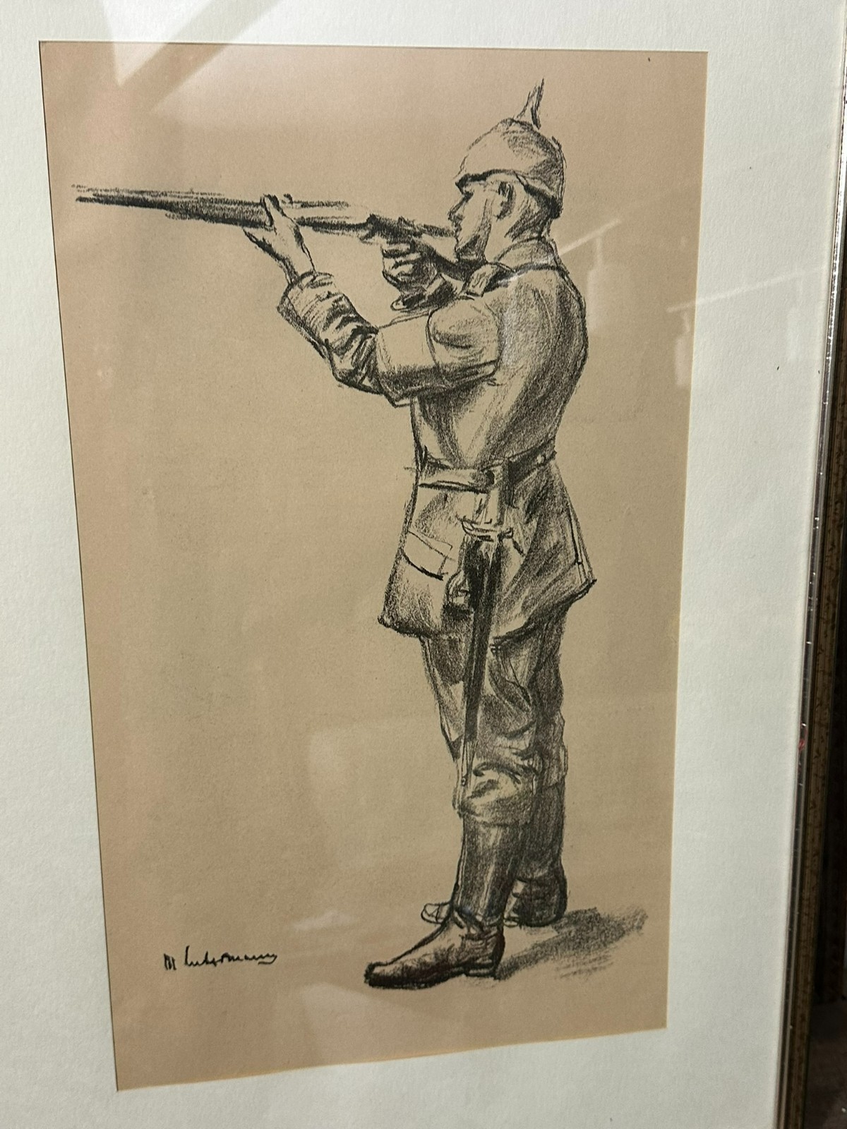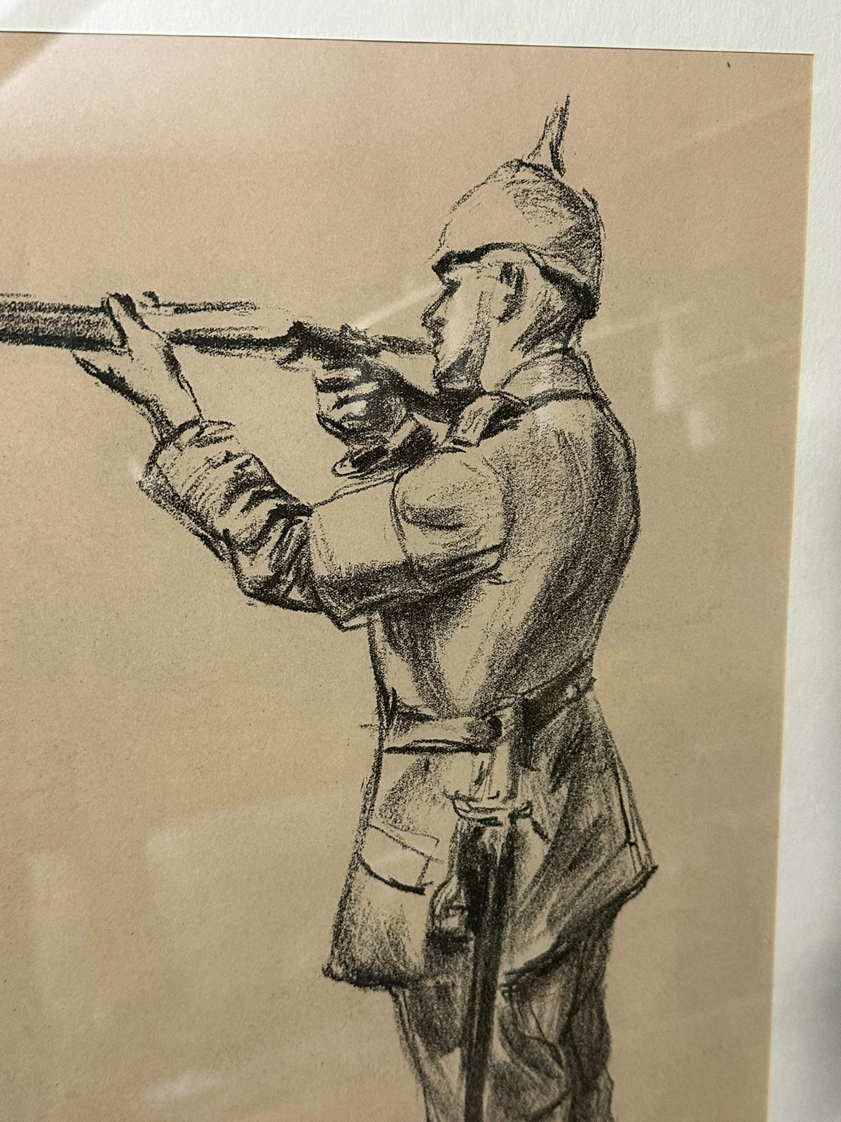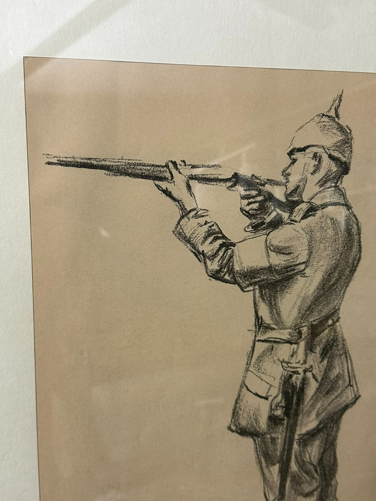 Sehr schöne Lithographie auf Papier, Portrait eines Soldaten, unten links signiert. Das Glas ist hinter Glas gerahmt und befindet sich in sehr schönem Zustand. Abmessungen sichtbar 27x46cm, mit Rahmen 42x62cm. Am Rahmen minimalster Abrieb.