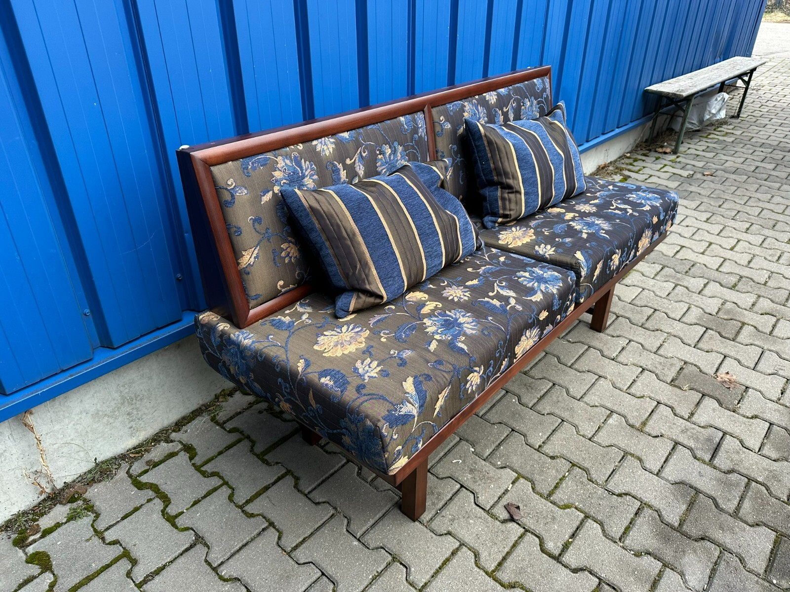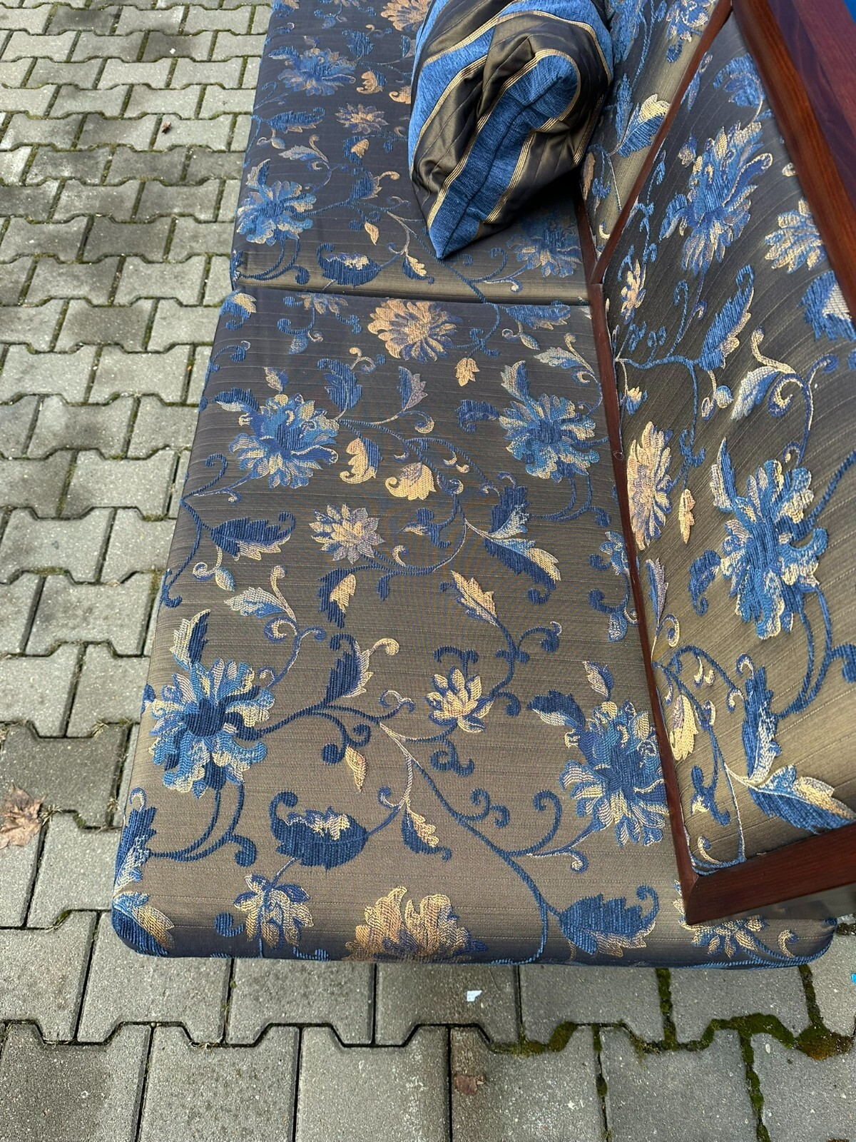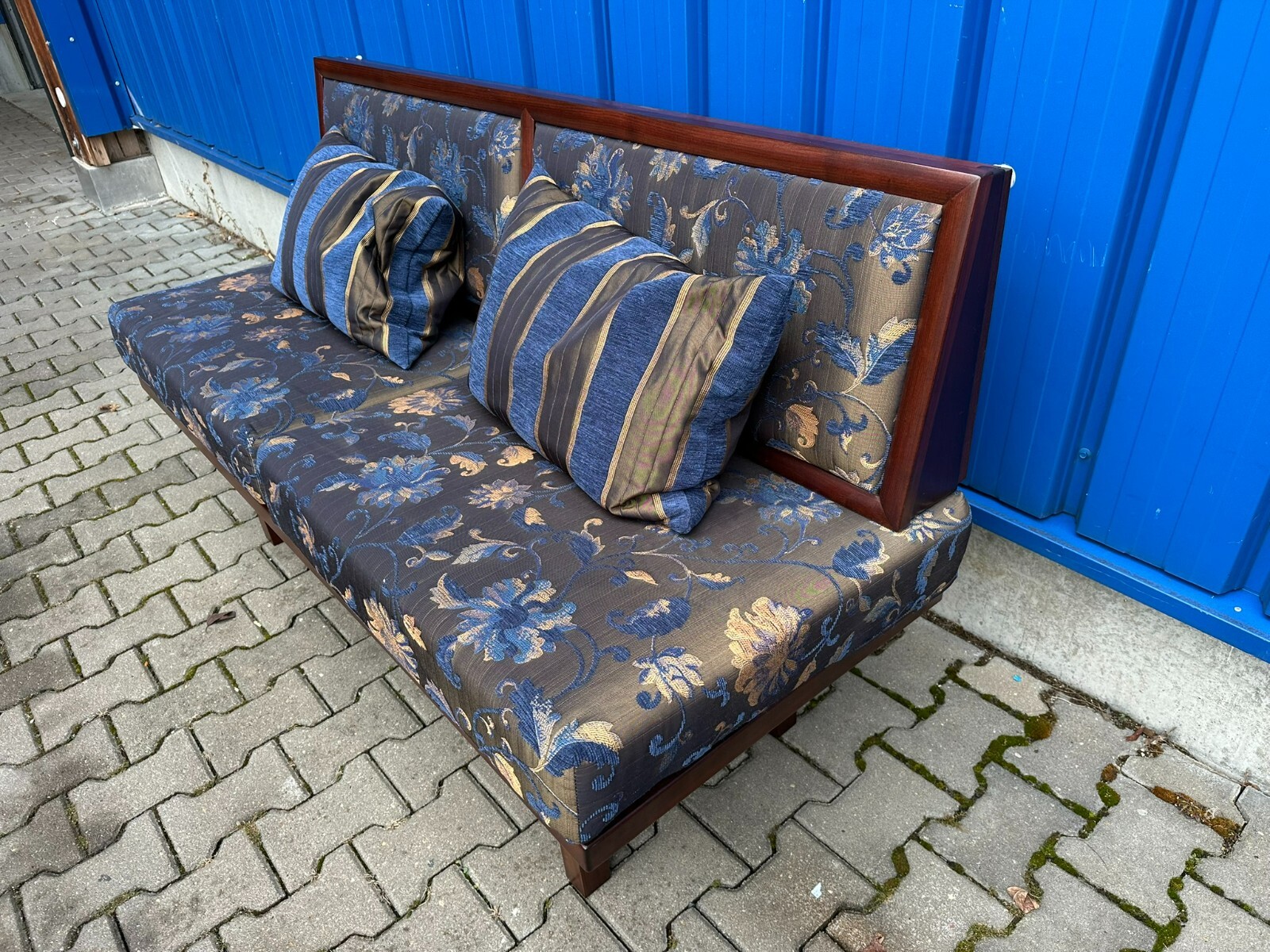Sehr schöne, moderne Couch, Gestell aus massivem Holz, mit Seidestoffbezug. Sehr schwere ausführung, Gestell minimalst berieben. Der Stoff ist fleckenfrei und befindet sich in sehr gutem Zustand. Die Couch ist nicht aufklappbar. Abmessungen BTH: 160x63x90cm. Sitzhöhe: 54cm, Sitztiefe: 48cm.