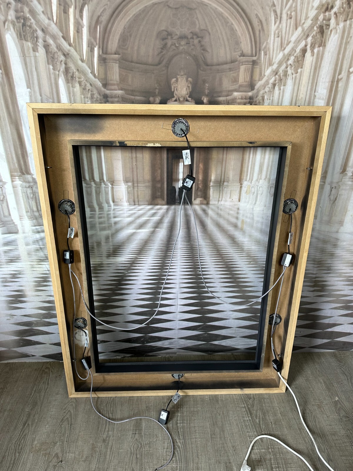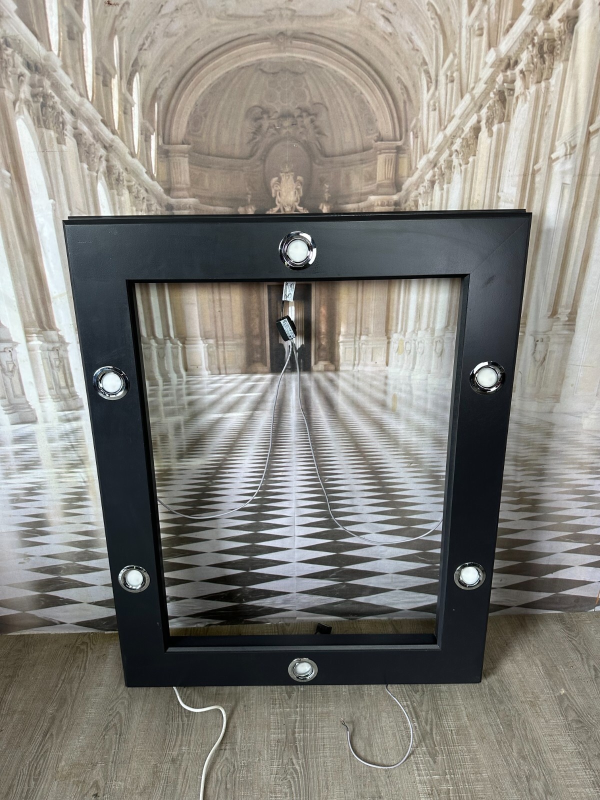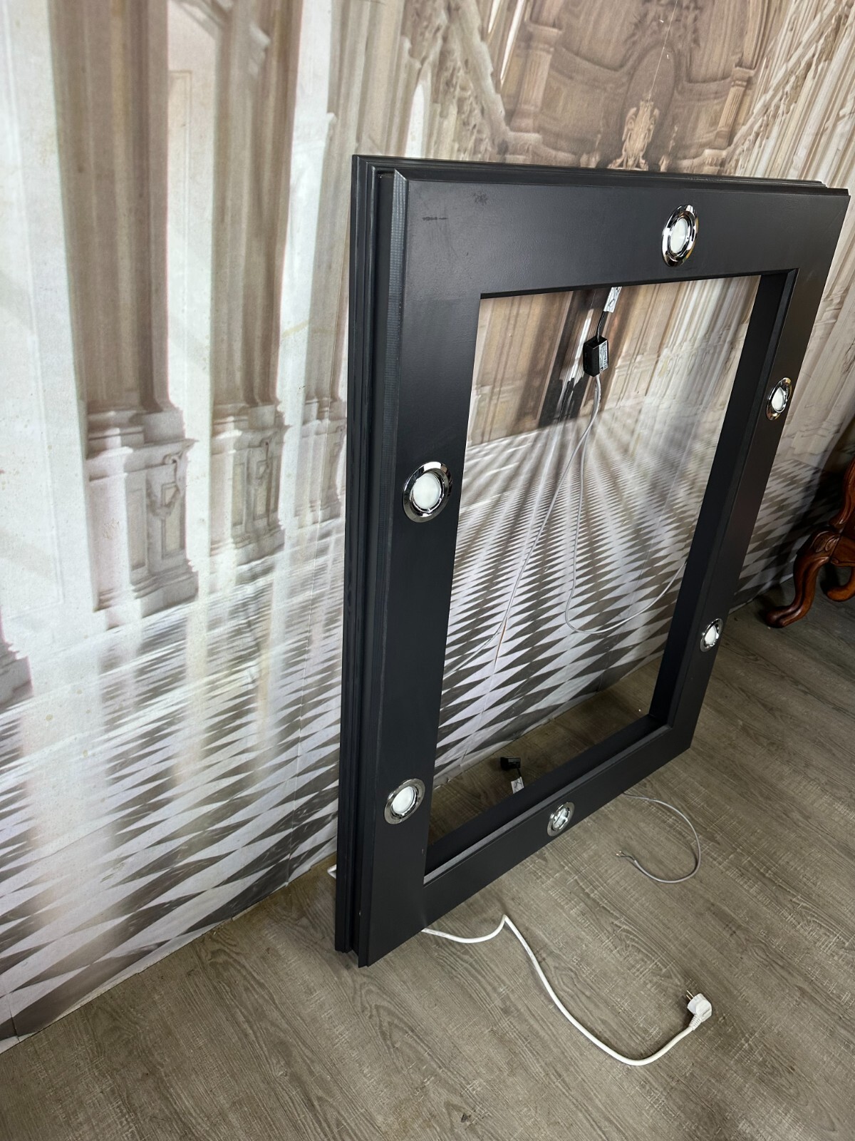 Modernes, breites Wandpaneel / Rahmen aus Holz, mit eingebauten Lichtspots, diese seitlich beweglich. An den Ecken leichte Bestoßungen, an der Oberfläche insgesamt diverse Stellen mit leichtem Abrieb, die zum Teil übermalt wurden. Der Kasten hat einen normalen Steckdosenstecker, die Funktion ist gegeben, die Leuchtmittel sind ungetestet und werden kostenlos dazugegeben. Abmessungen BTH: 104x8x131cm, Licht des Innenmaß: 75x100cm.