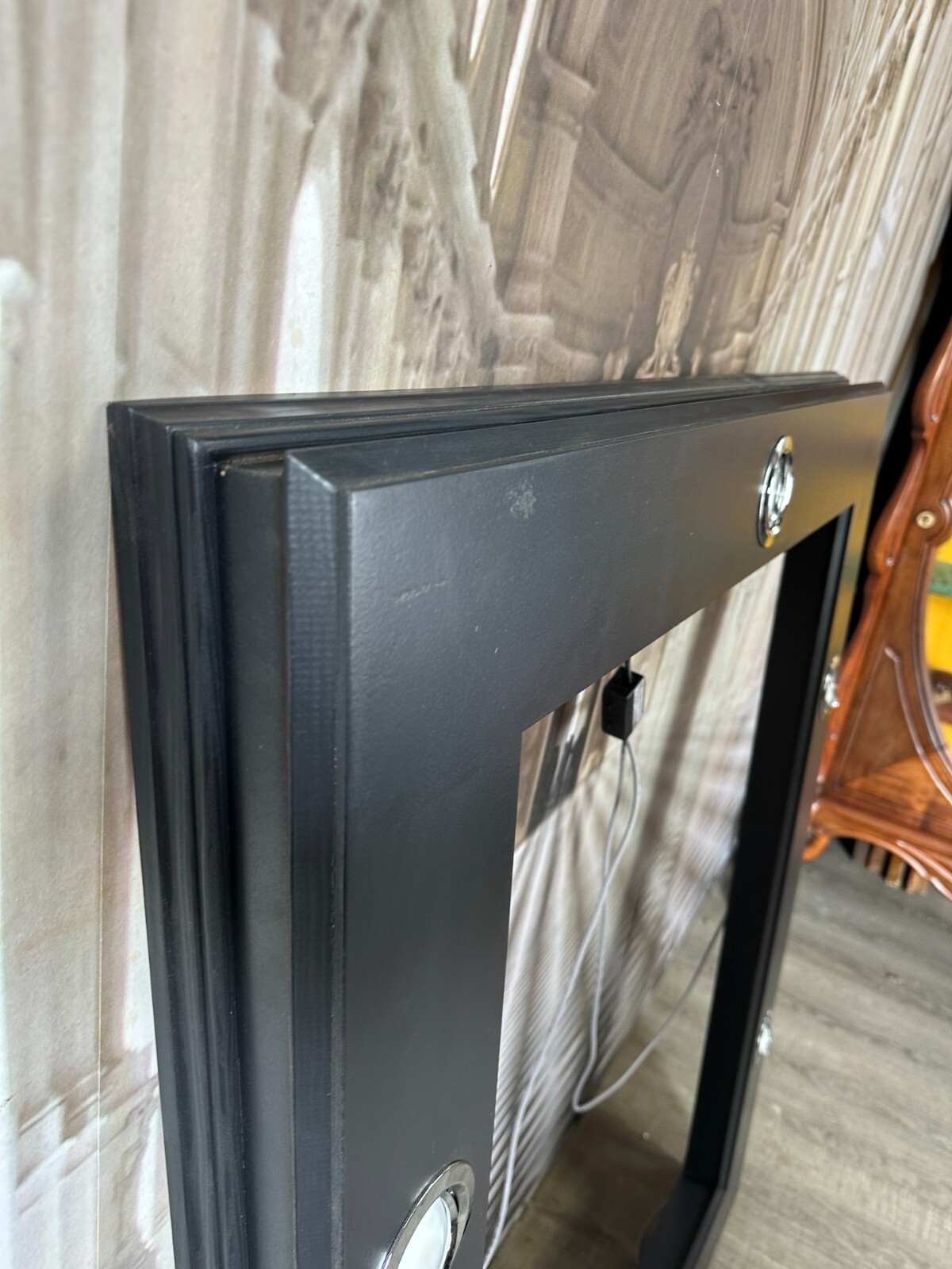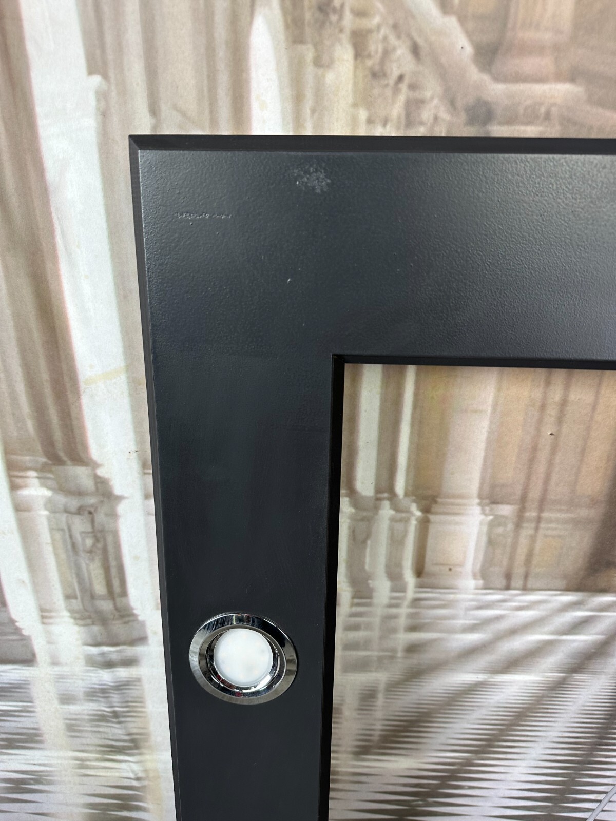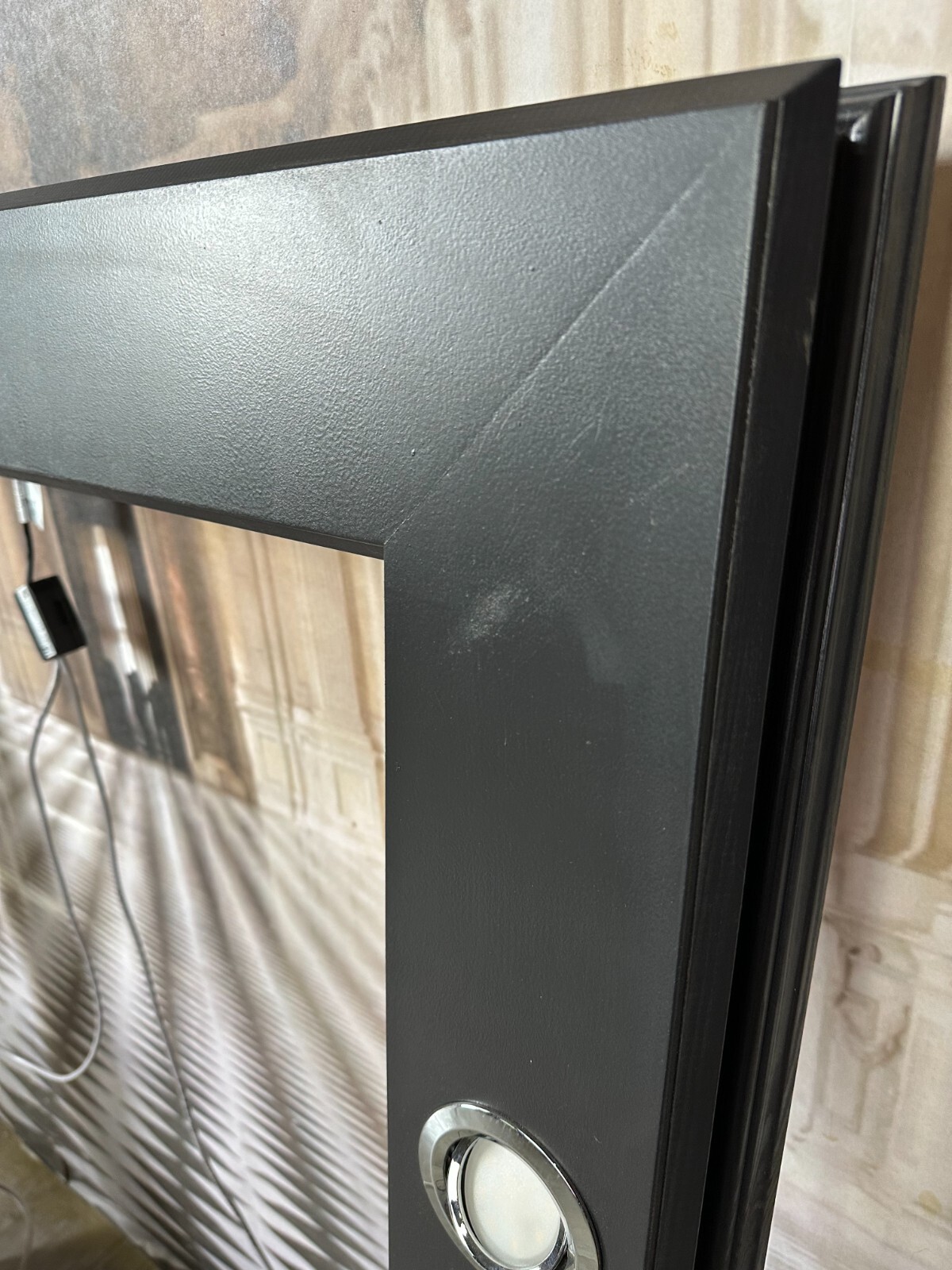 Modernes, breites Wandpaneel / Rahmen aus Holz, mit eingebauten Lichtspots, diese seitlich beweglich. An den Ecken leichte Bestoßungen, an der Oberfläche insgesamt diverse Stellen mit leichtem Abrieb, die zum Teil übermalt wurden. Der Kasten hat einen normalen Steckdosenstecker, die Funktion ist gegeben, die Leuchtmittel sind ungetestet und werden kostenlos dazugegeben. Abmessungen BTH: 104x8x131cm, Licht des Innenmaß: 75x100cm.