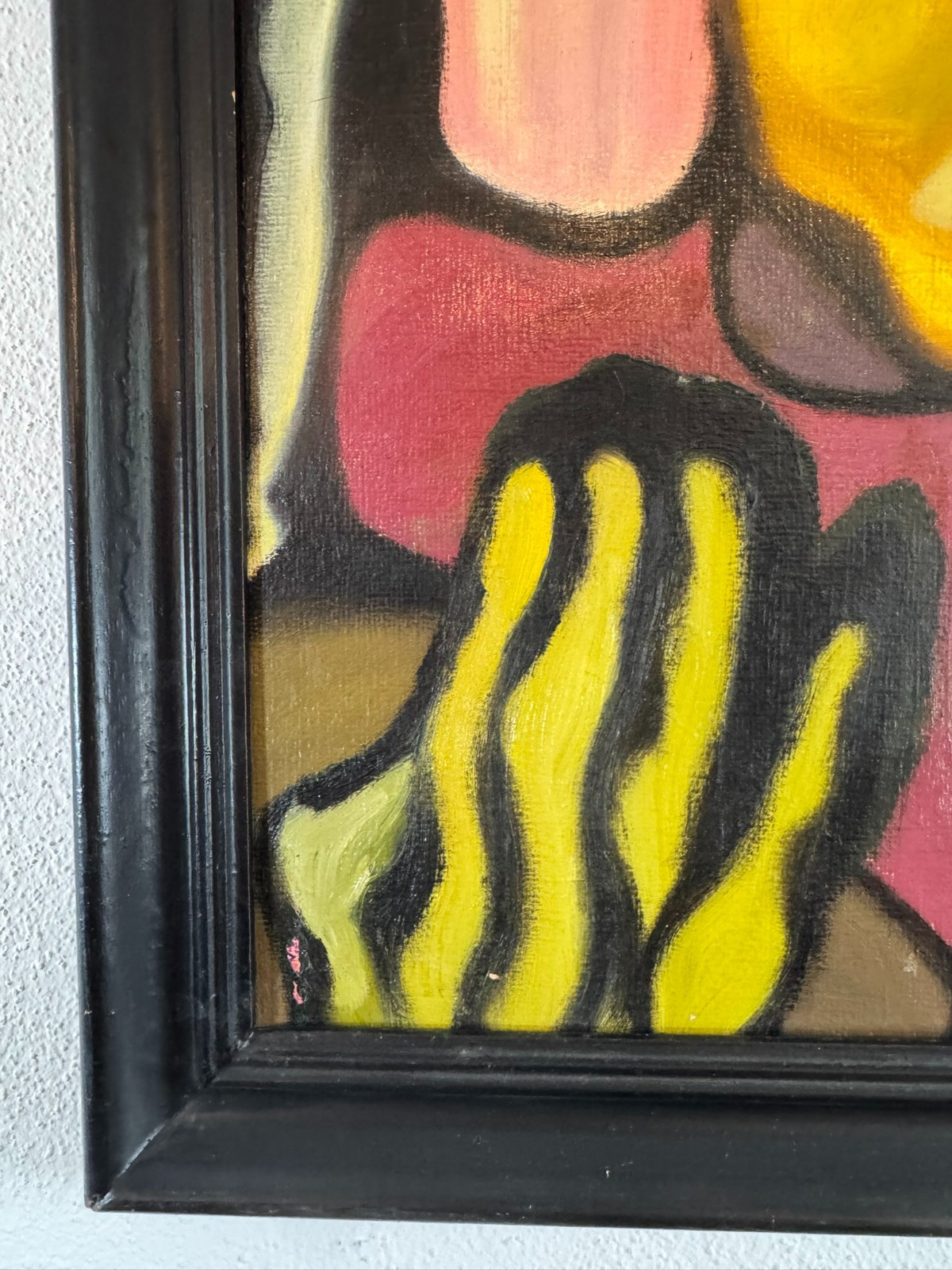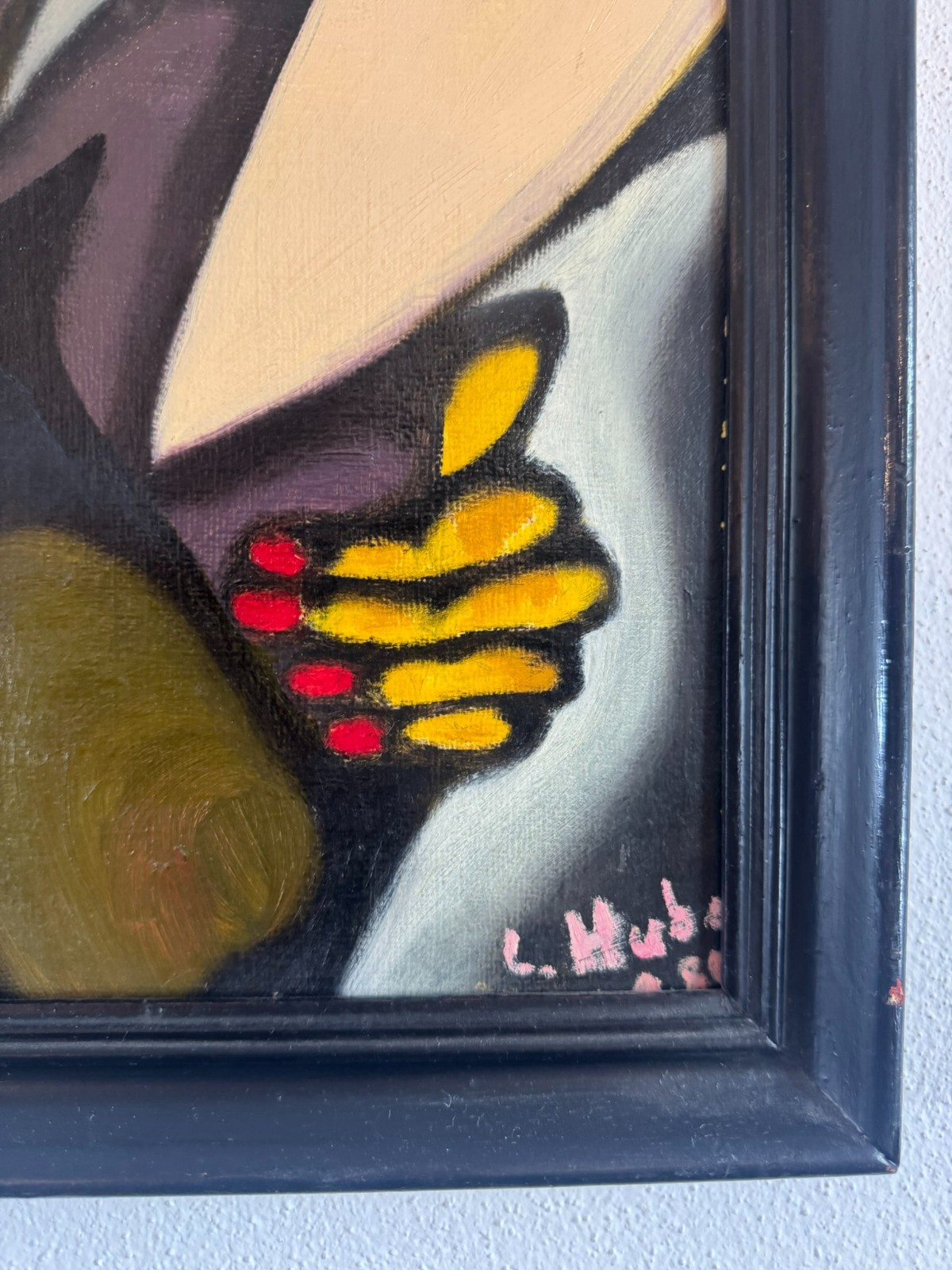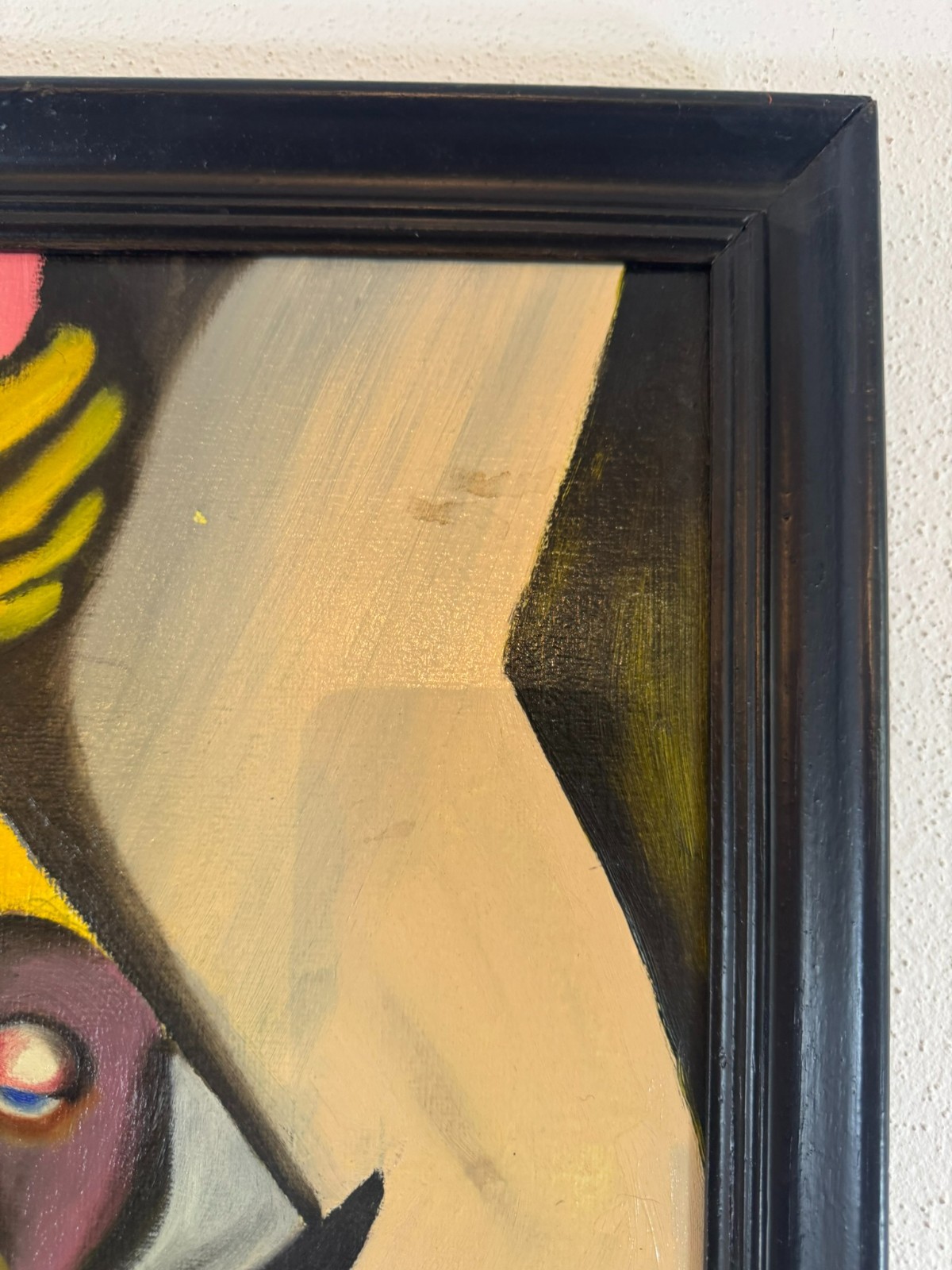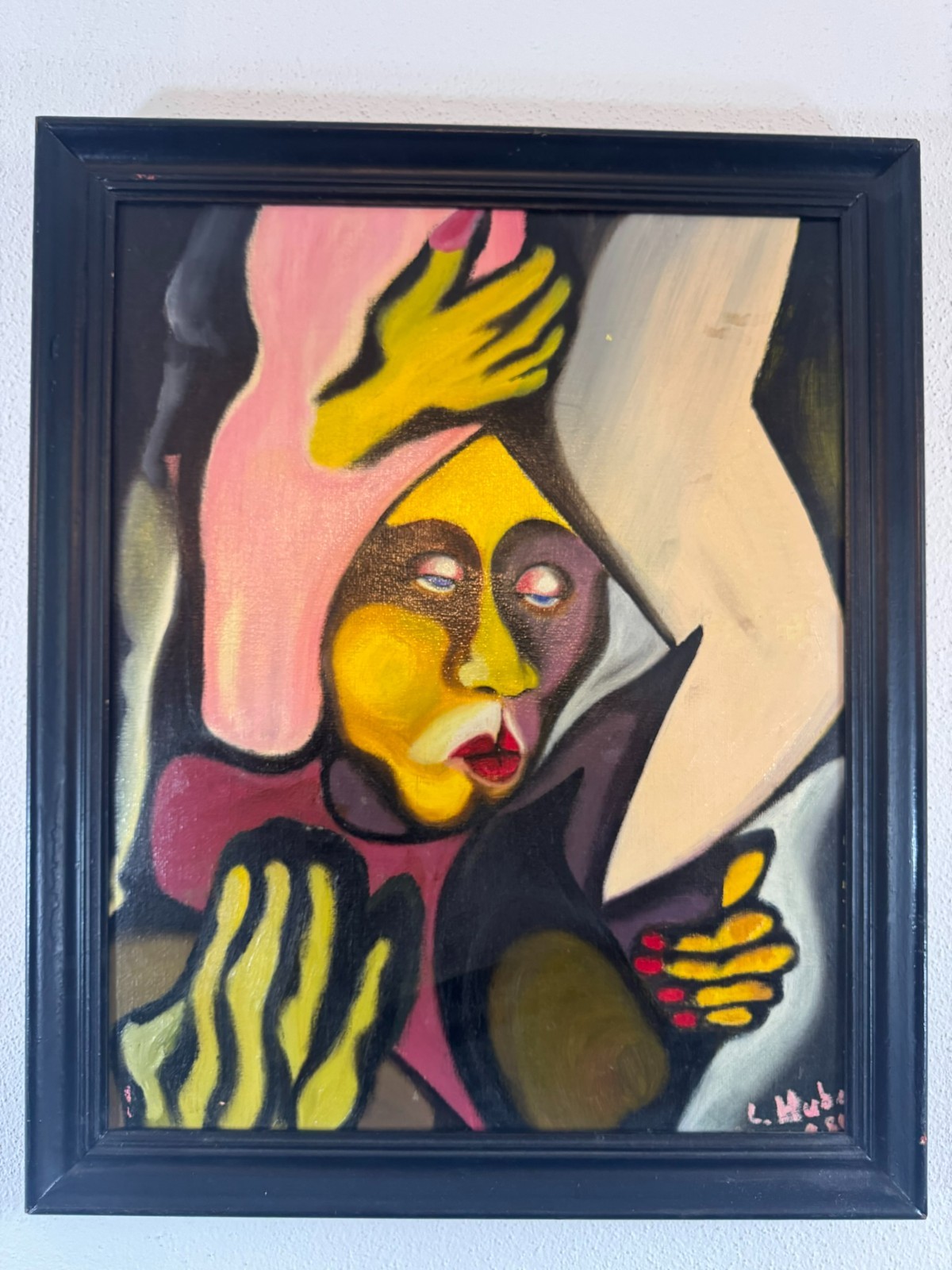 Schönes Gemälde, Acrylfarben auf Leinwand, geklebt auf eine Platte. Das Gemälde hat zwei Flecken im oberen rechten Bereich, es ist in der unteren rechten Ecke signiert “ Huber“ und datiert „1.80“. Der Rahmen ist leicht berieben, Abmessungen gesamt: 45x55cm, ohne Rahmen: 40x50cm.