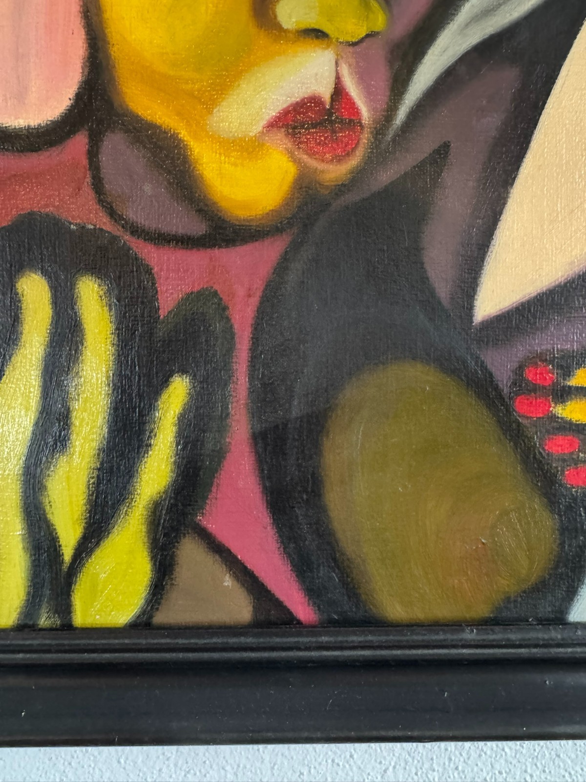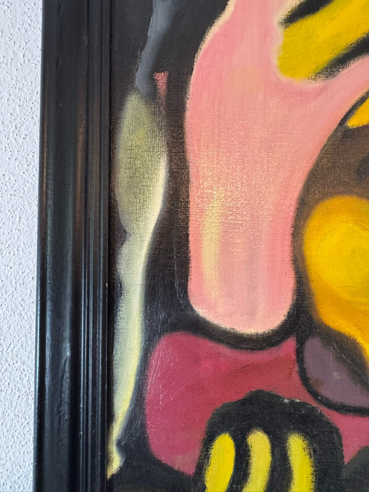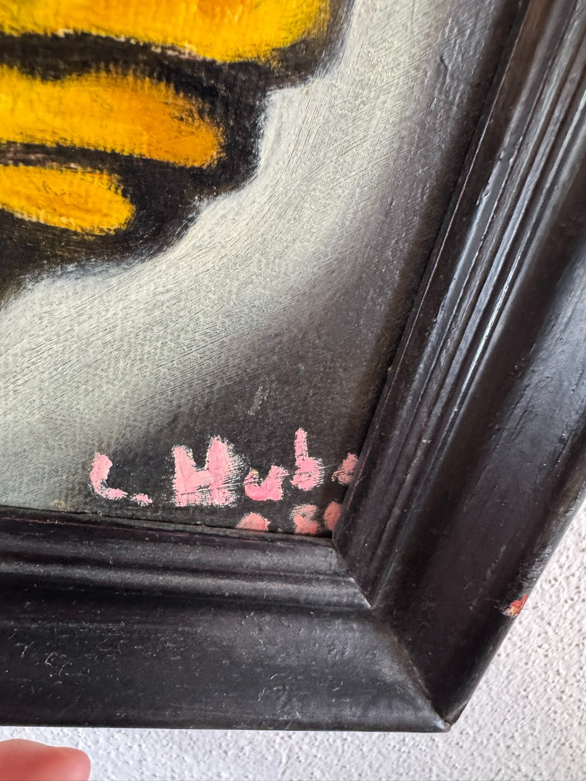 Schönes Gemälde, Acrylfarben auf Leinwand, geklebt auf eine Platte. Das Gemälde hat zwei Flecken im oberen rechten Bereich, es ist in der unteren rechten Ecke signiert “ Huber“ und datiert „1.80“. Der Rahmen ist leicht berieben, Abmessungen gesamt: 45x55cm, ohne Rahmen: 40x50cm.