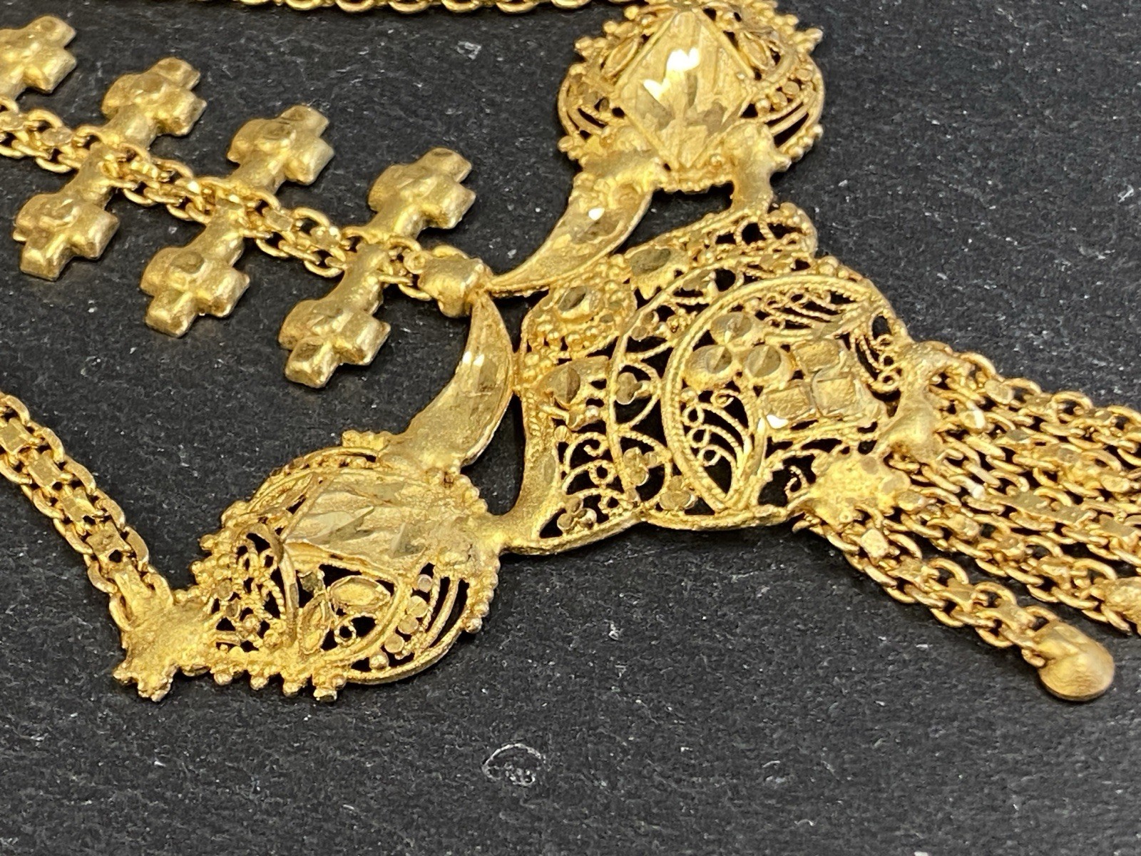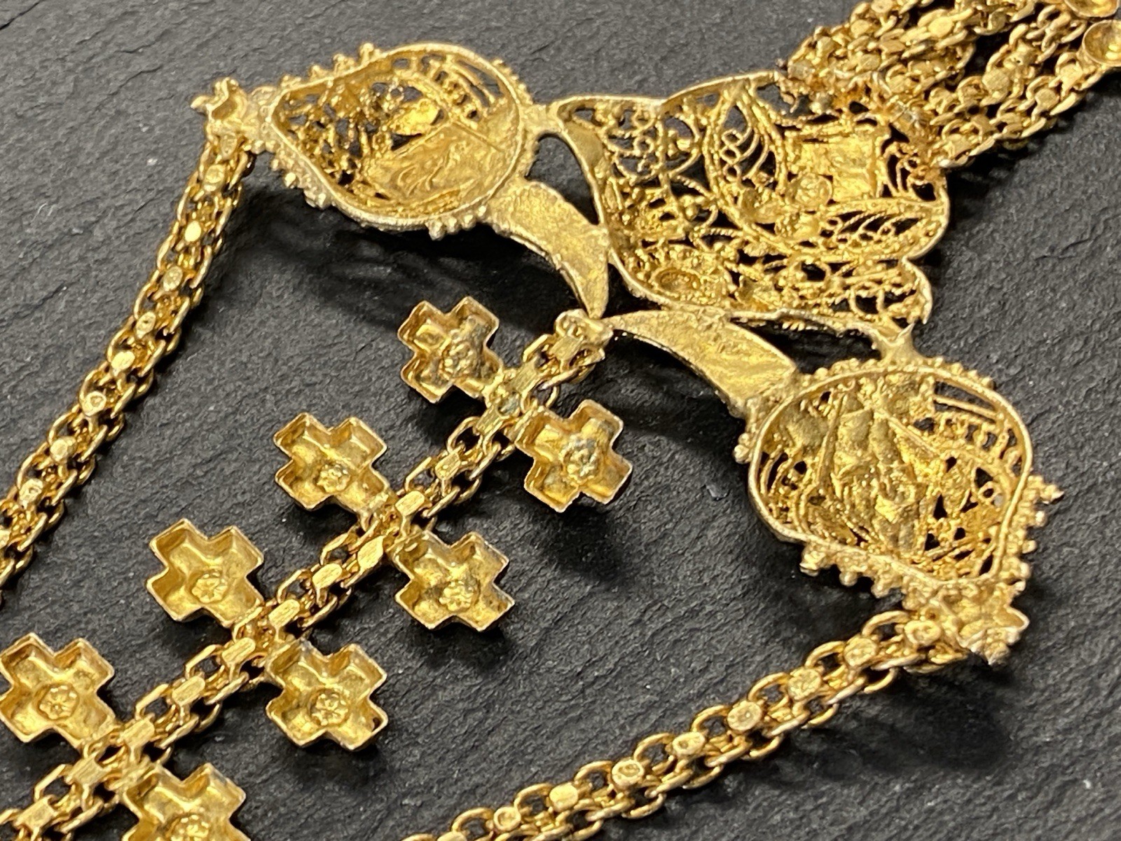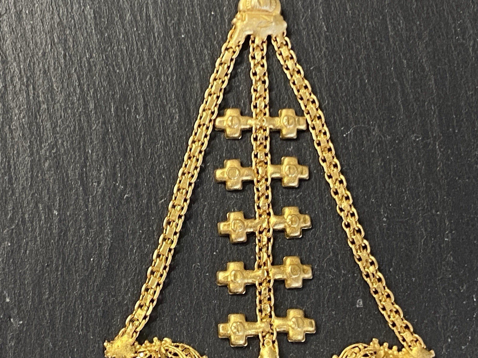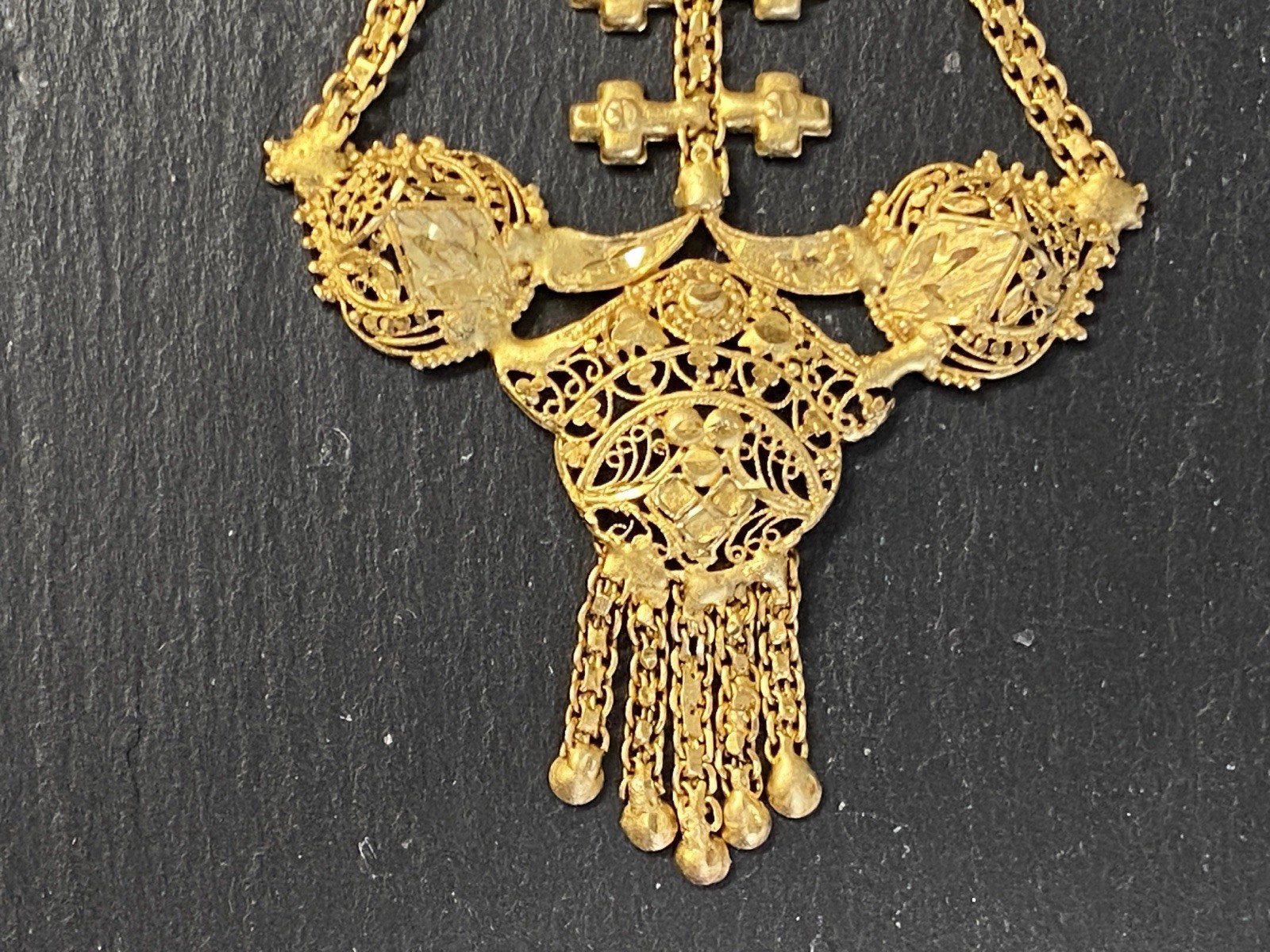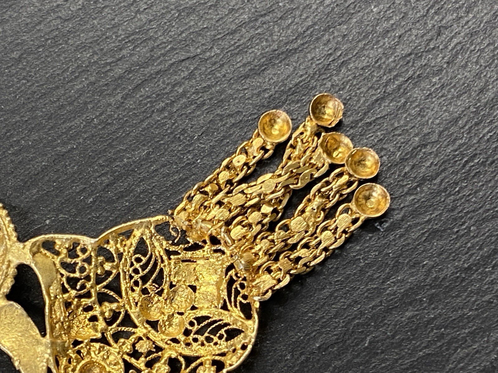 Modeschmuck Anhänger aus vergoldetem Metall, ungestempelt, in dekorativer Gestaltung. Die Vergoldung ist teils berieben und angelaufen. BTH 6,7/0,5/16cm, Gesamtgewicht ca. 16,66g.
