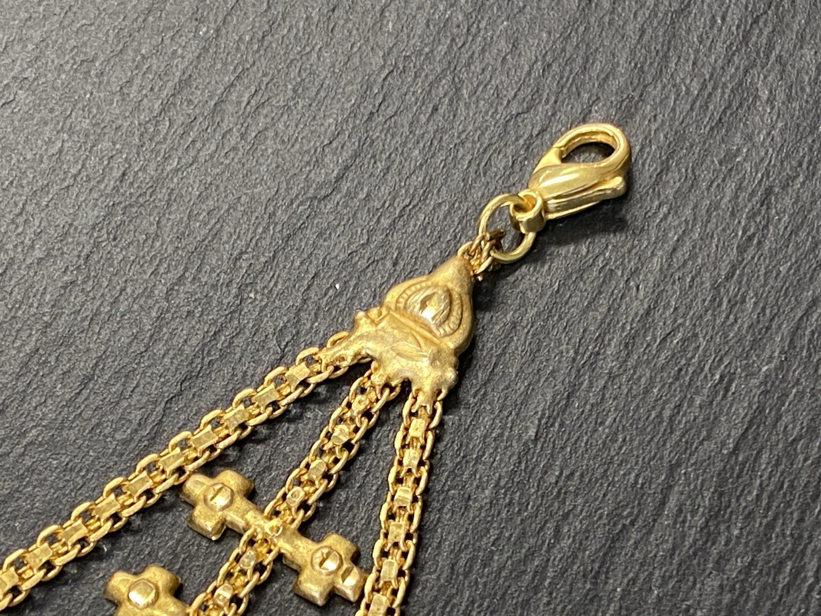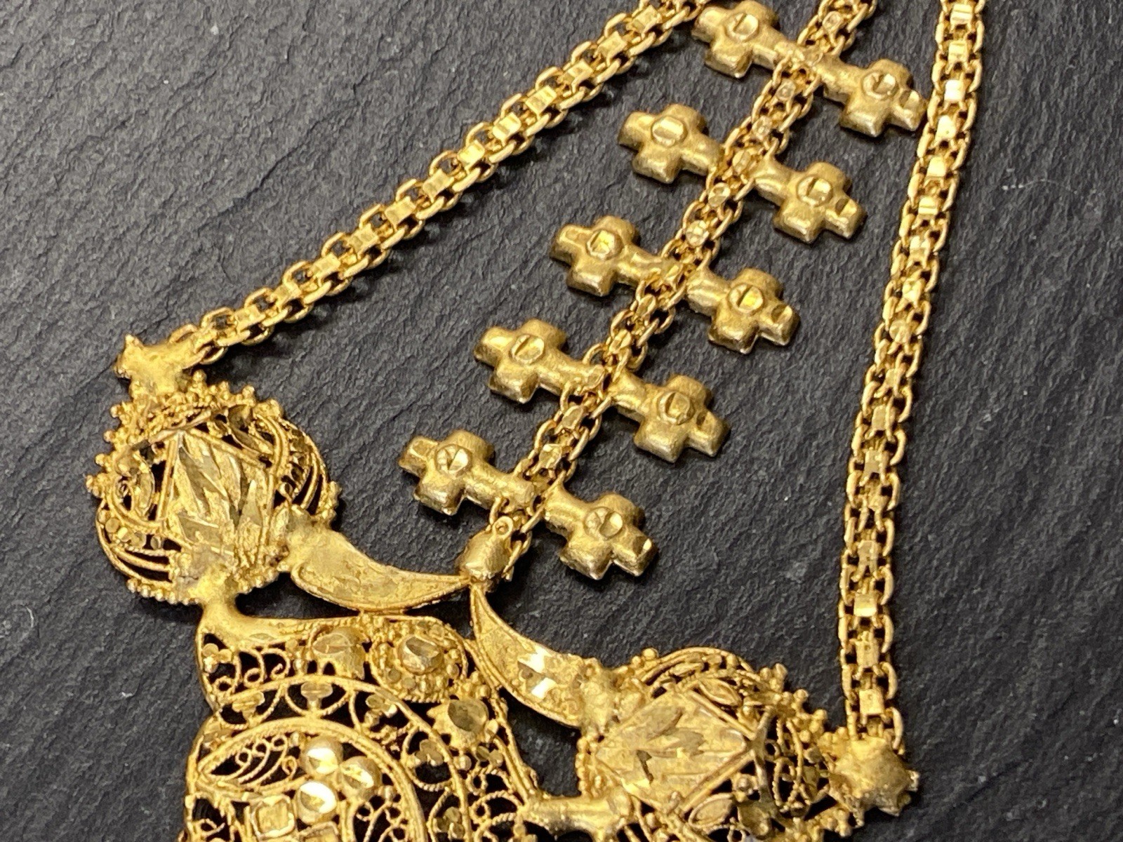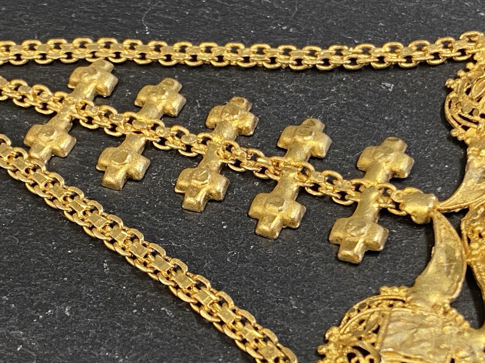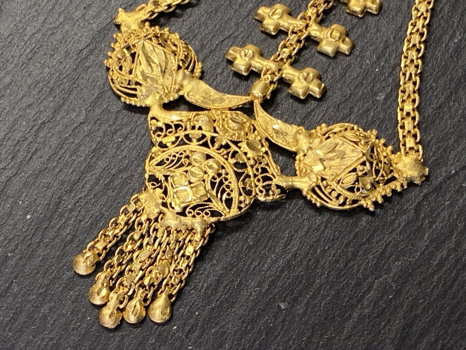 Modeschmuck Anhänger aus vergoldetem Metall, ungestempelt, in dekorativer Gestaltung. Die Vergoldung ist teils berieben und angelaufen. BTH 6,7/0,5/16cm, Gesamtgewicht ca. 16,66g.