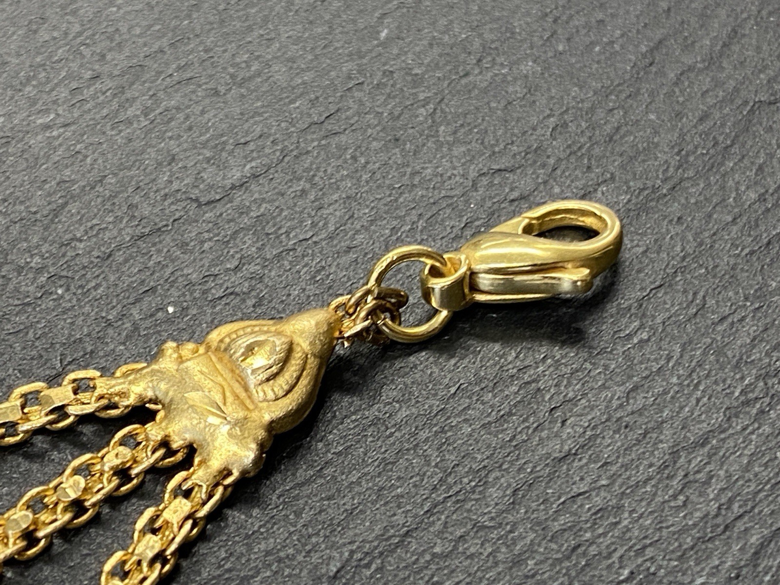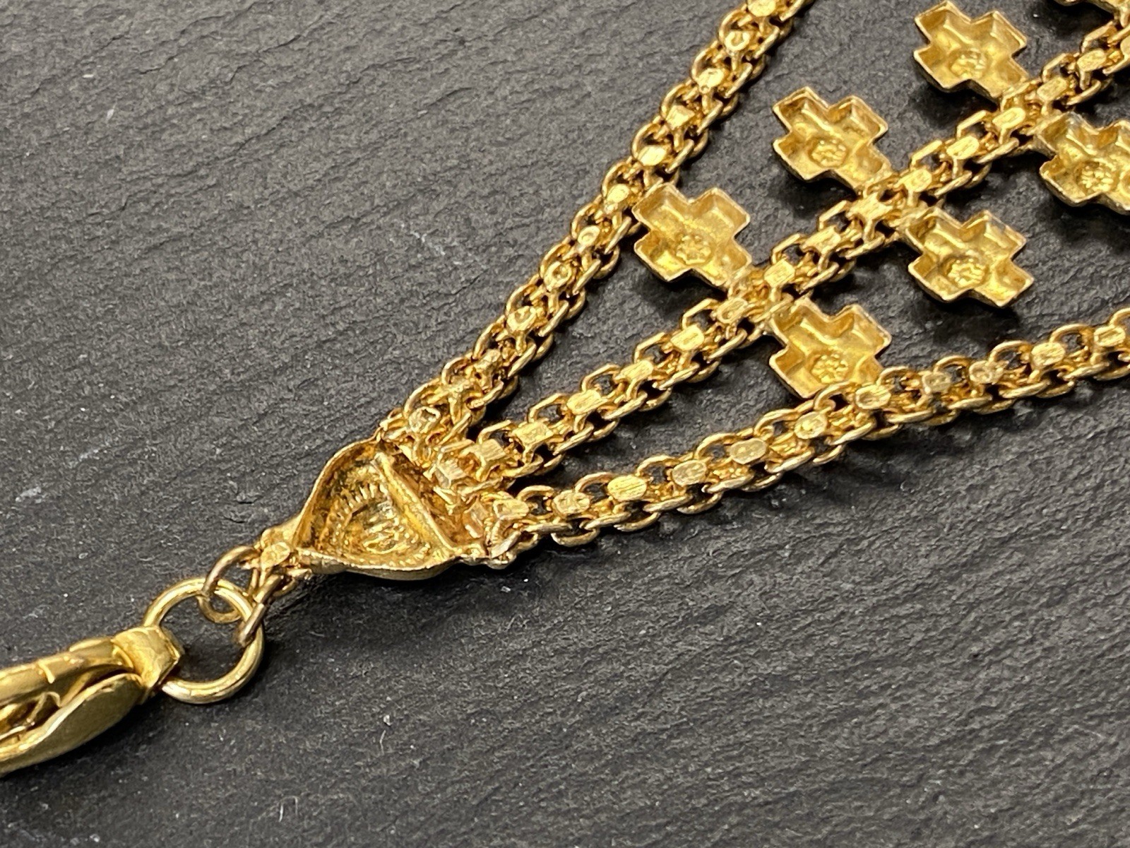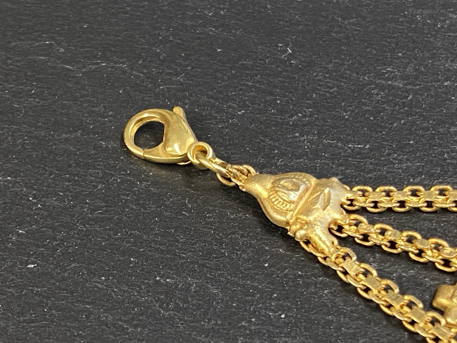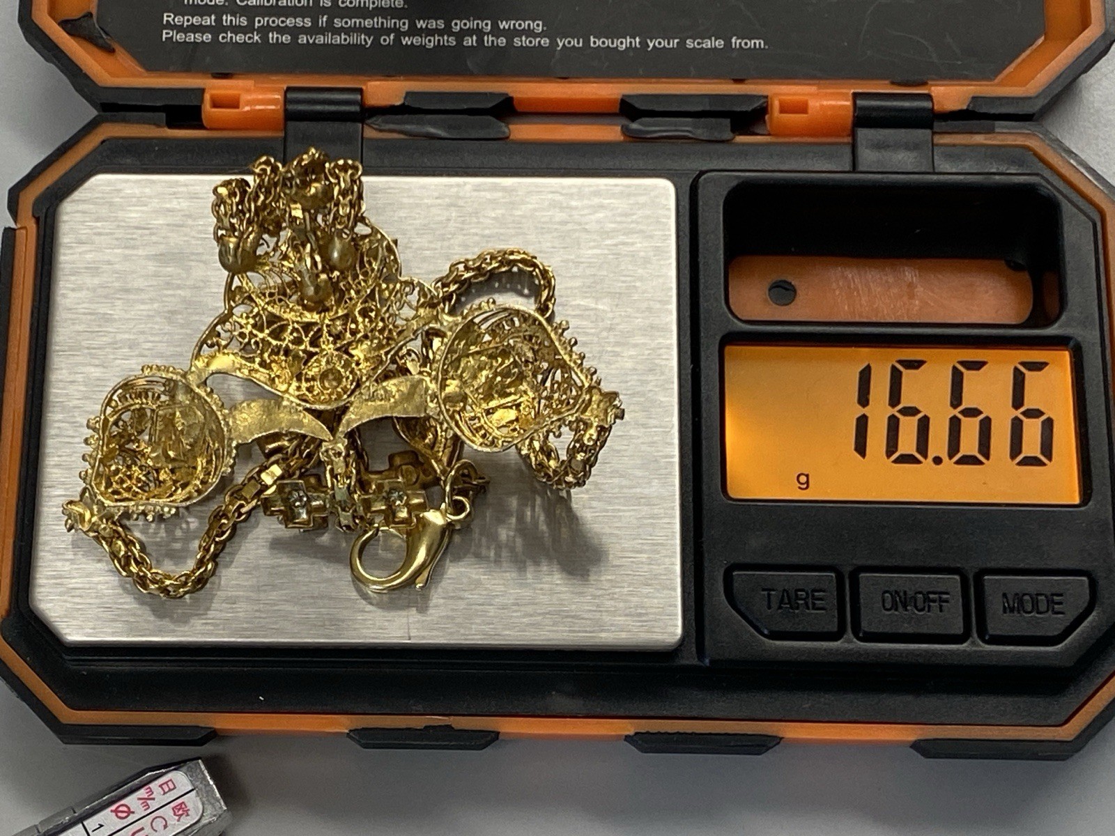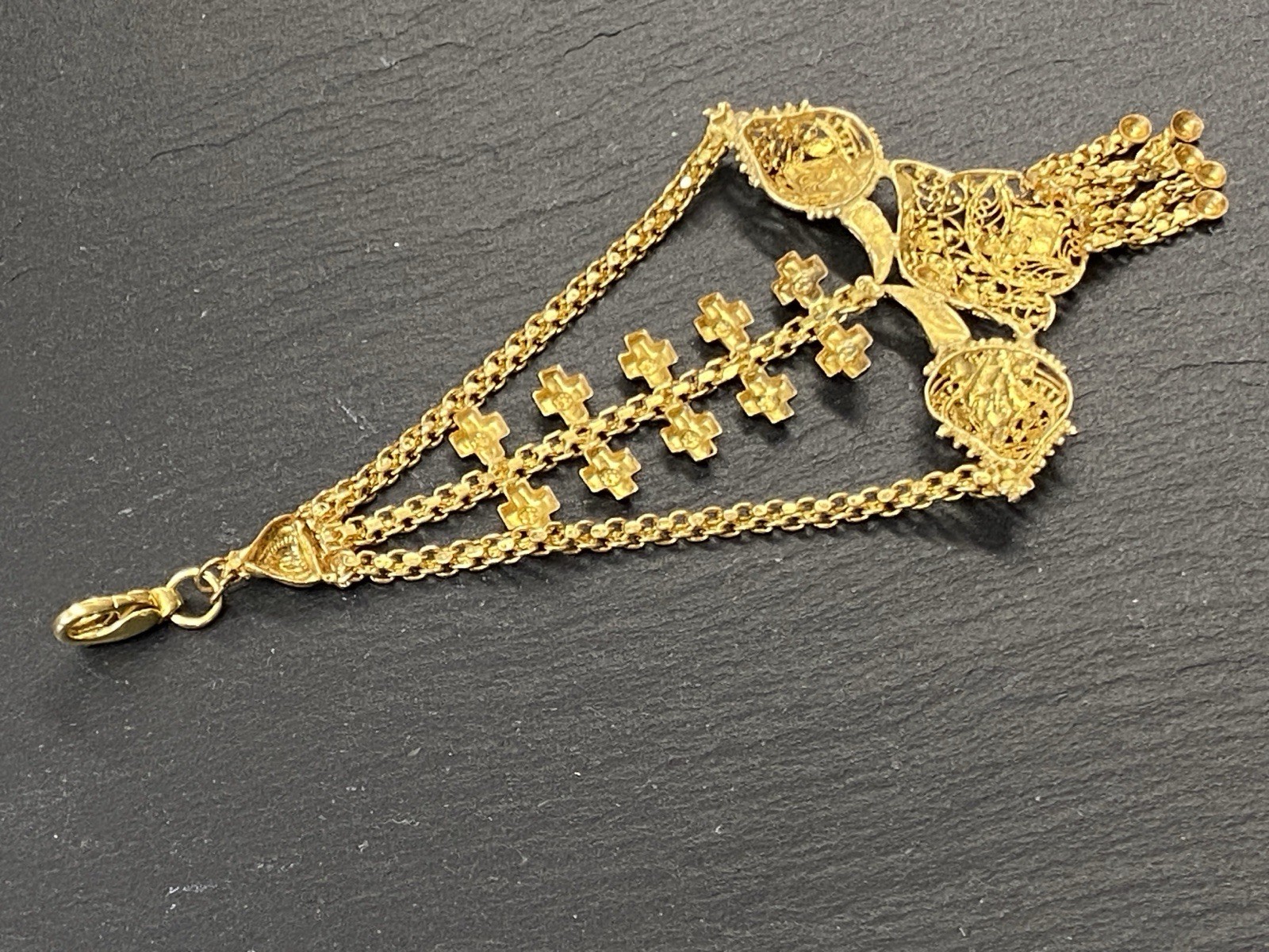 Modeschmuck Anhänger aus vergoldetem Metall, ungestempelt, in dekorativer Gestaltung. Die Vergoldung ist teils berieben und angelaufen. BTH 6,7/0,5/16cm, Gesamtgewicht ca. 16,66g.
