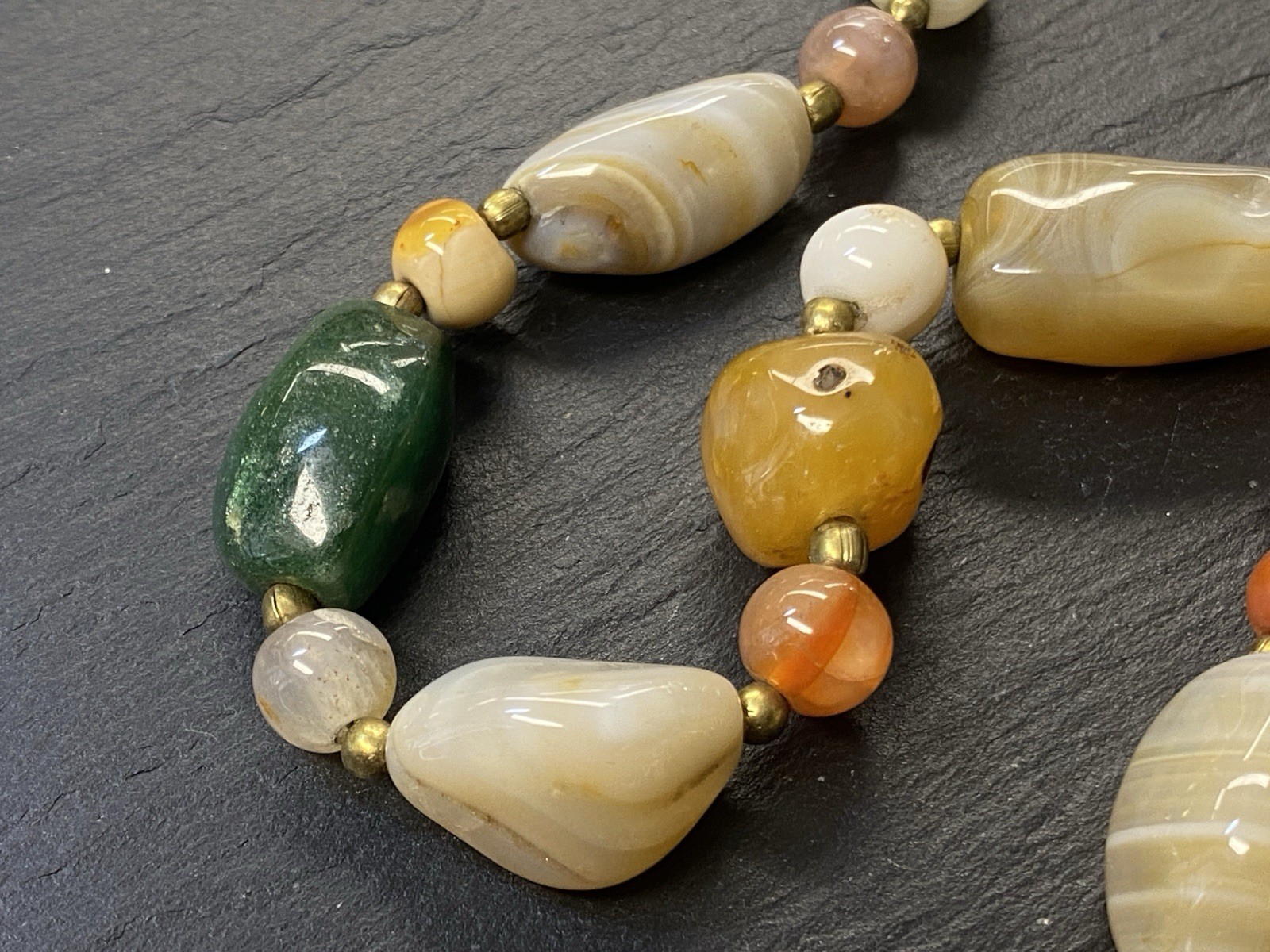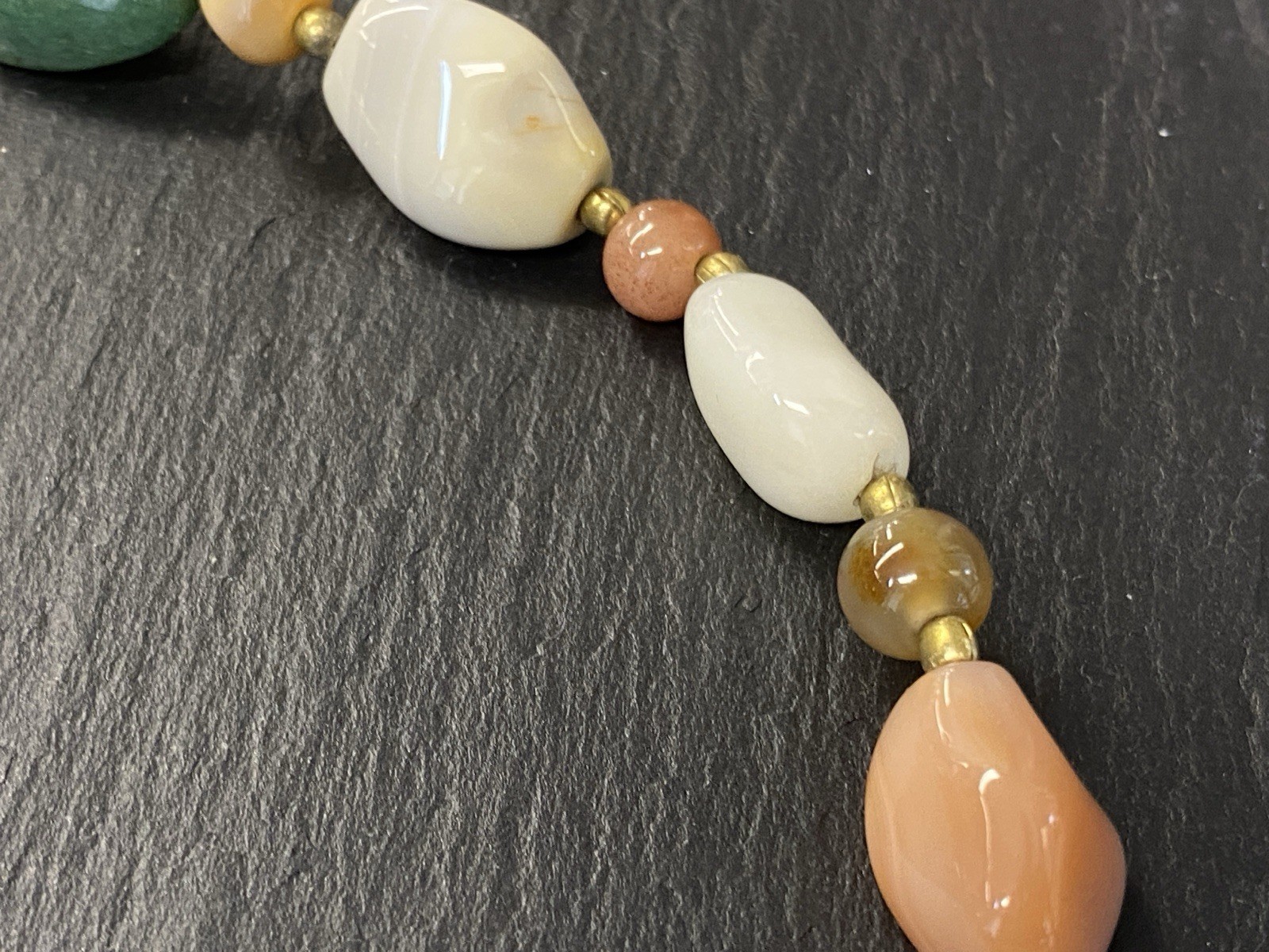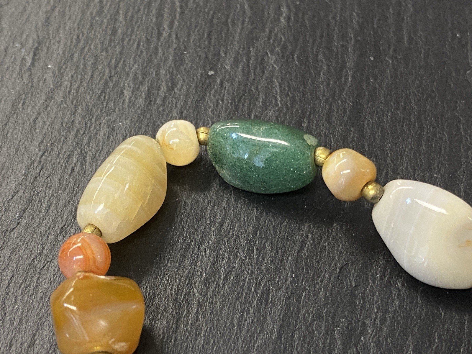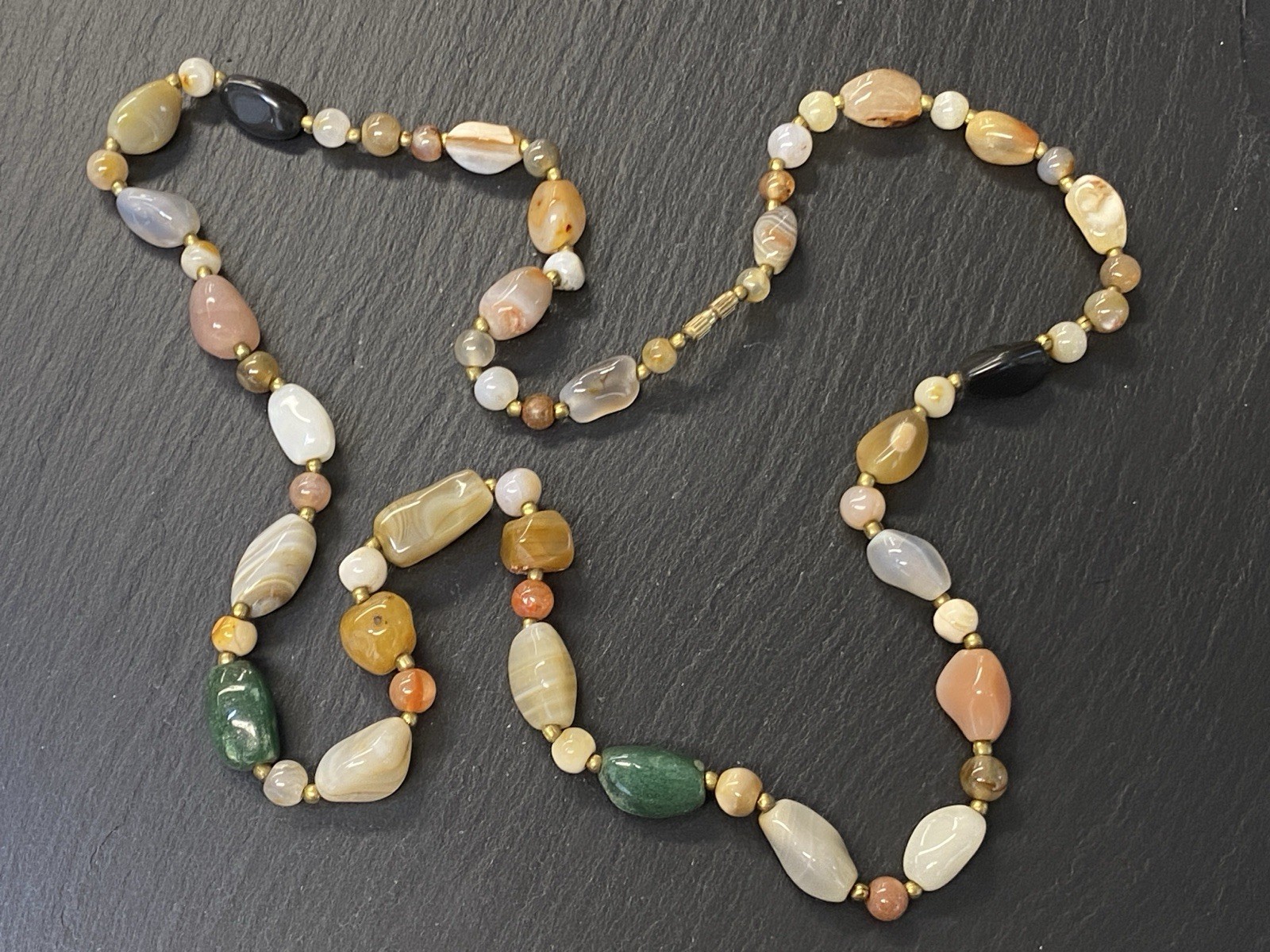 Lange Halskette aus verschiedensten Achaten, Onyx und Chrysopras mit kleinen goldfarbenen Kugeln zwischen jedem Stein. Der Verschluss und die kleinen Kugeln sind aus vergoldetem Metall. L/B der größeren Steine, an den Chrysoprasen gemessen ca. 2/1,2cm, Durchmesser der runden Steine ca. 0,8cm, Durchmesser der goldenen Kügelchen ca. 0,4cm. Gesamtlänge der Kette 91cm, Gesamtgewicht ca. 122,97g.