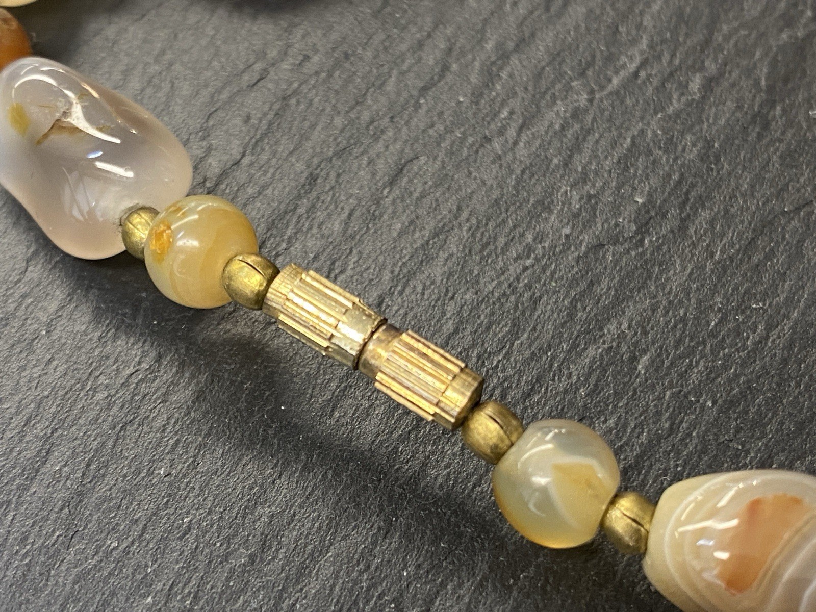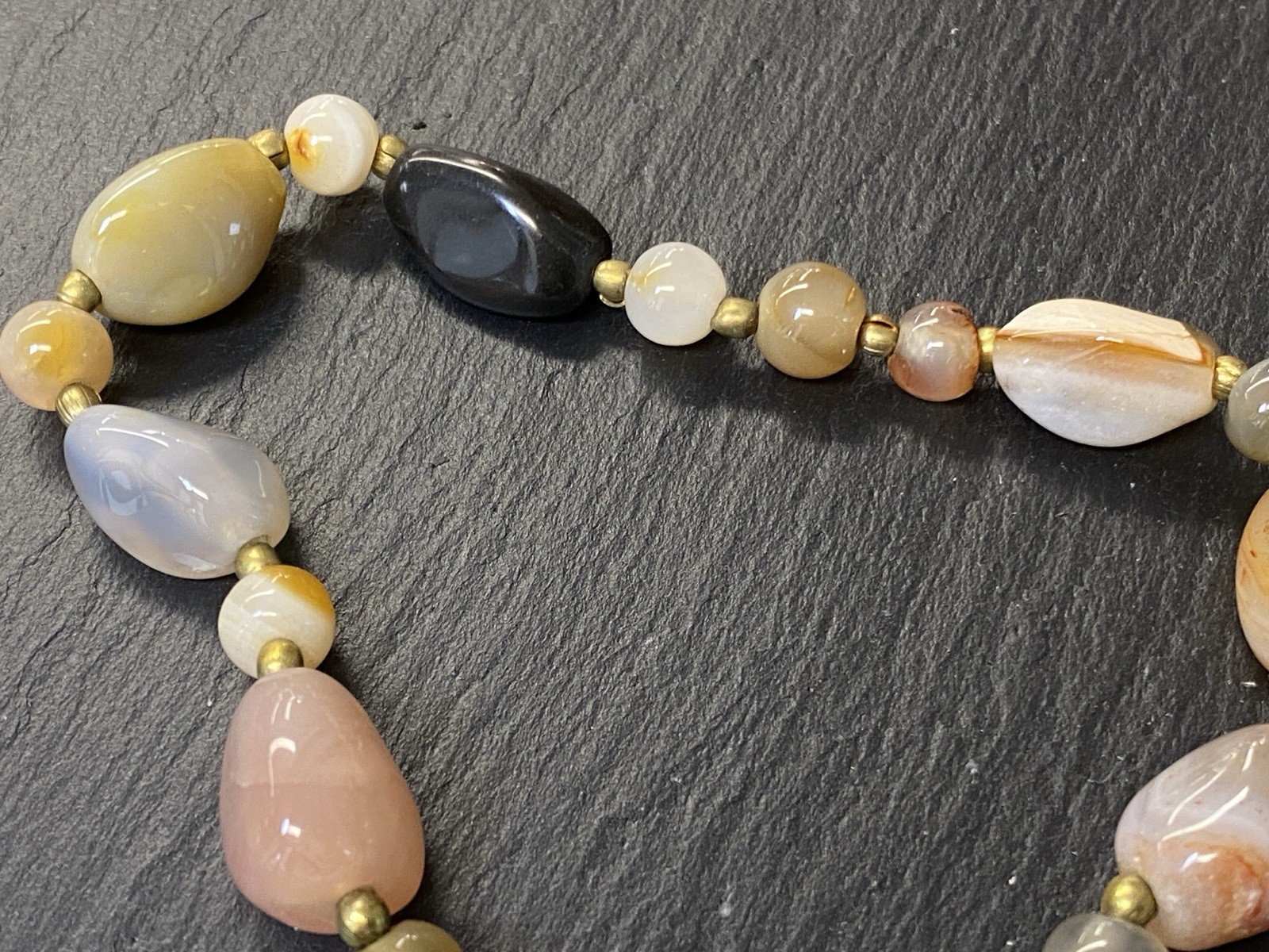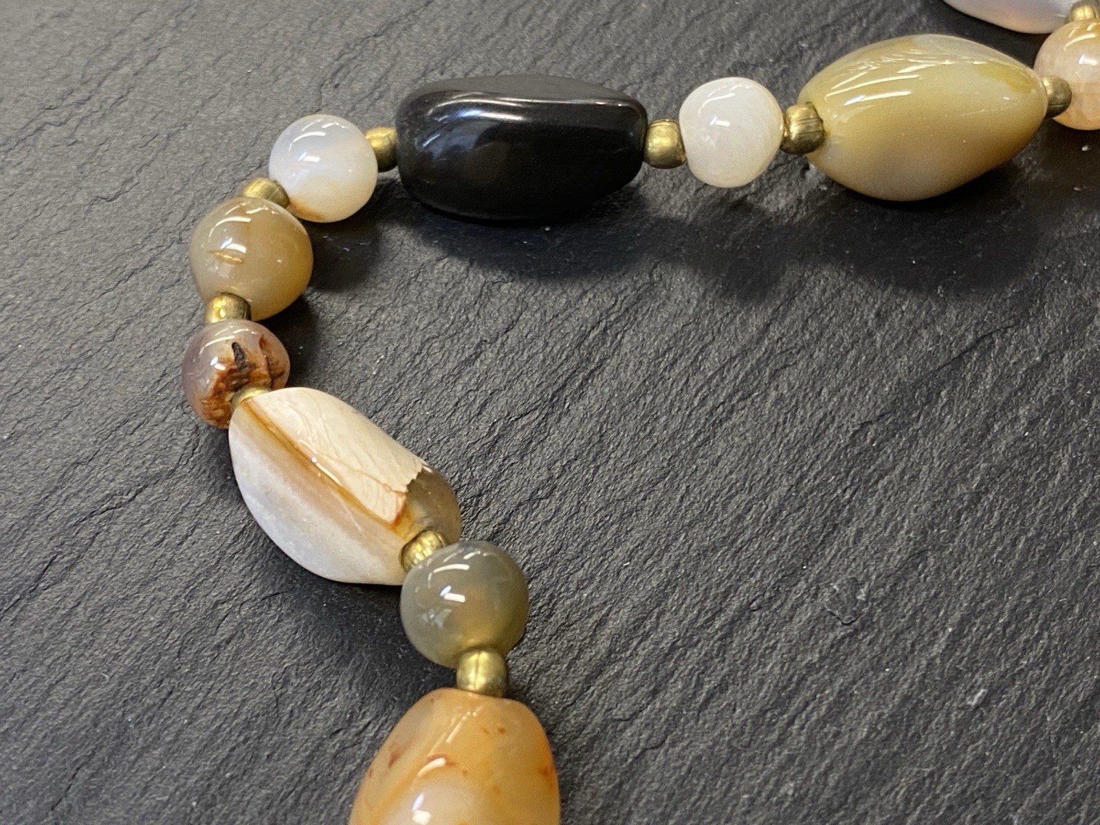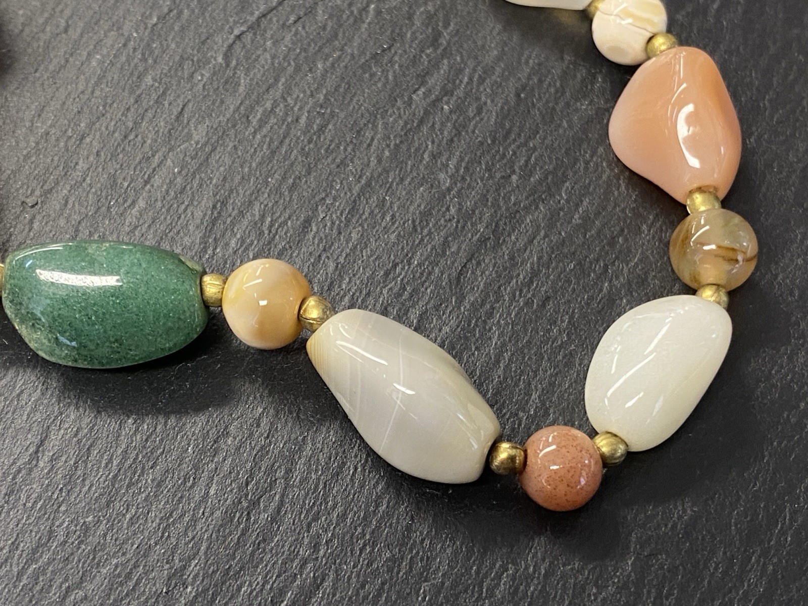 Lange Halskette aus verschiedensten Achaten, Onyx und Chrysopras mit kleinen goldfarbenen Kugeln zwischen jedem Stein. Der Verschluss und die kleinen Kugeln sind aus vergoldetem Metall. L/B der größeren Steine, an den Chrysoprasen gemessen ca. 2/1,2cm, Durchmesser der runden Steine ca. 0,8cm, Durchmesser der goldenen Kügelchen ca. 0,4cm. Gesamtlänge der Kette 91cm, Gesamtgewicht ca. 122,97g.