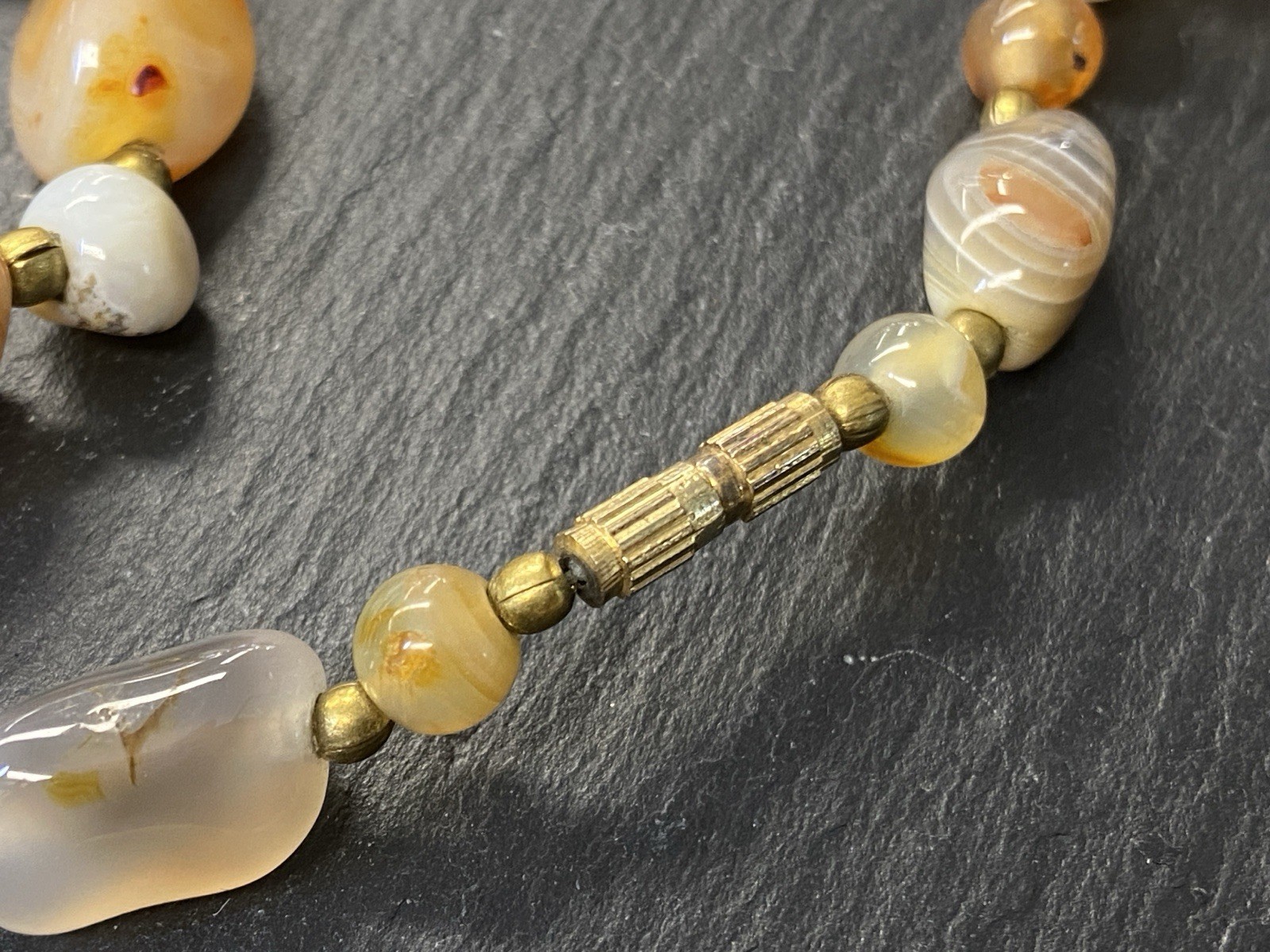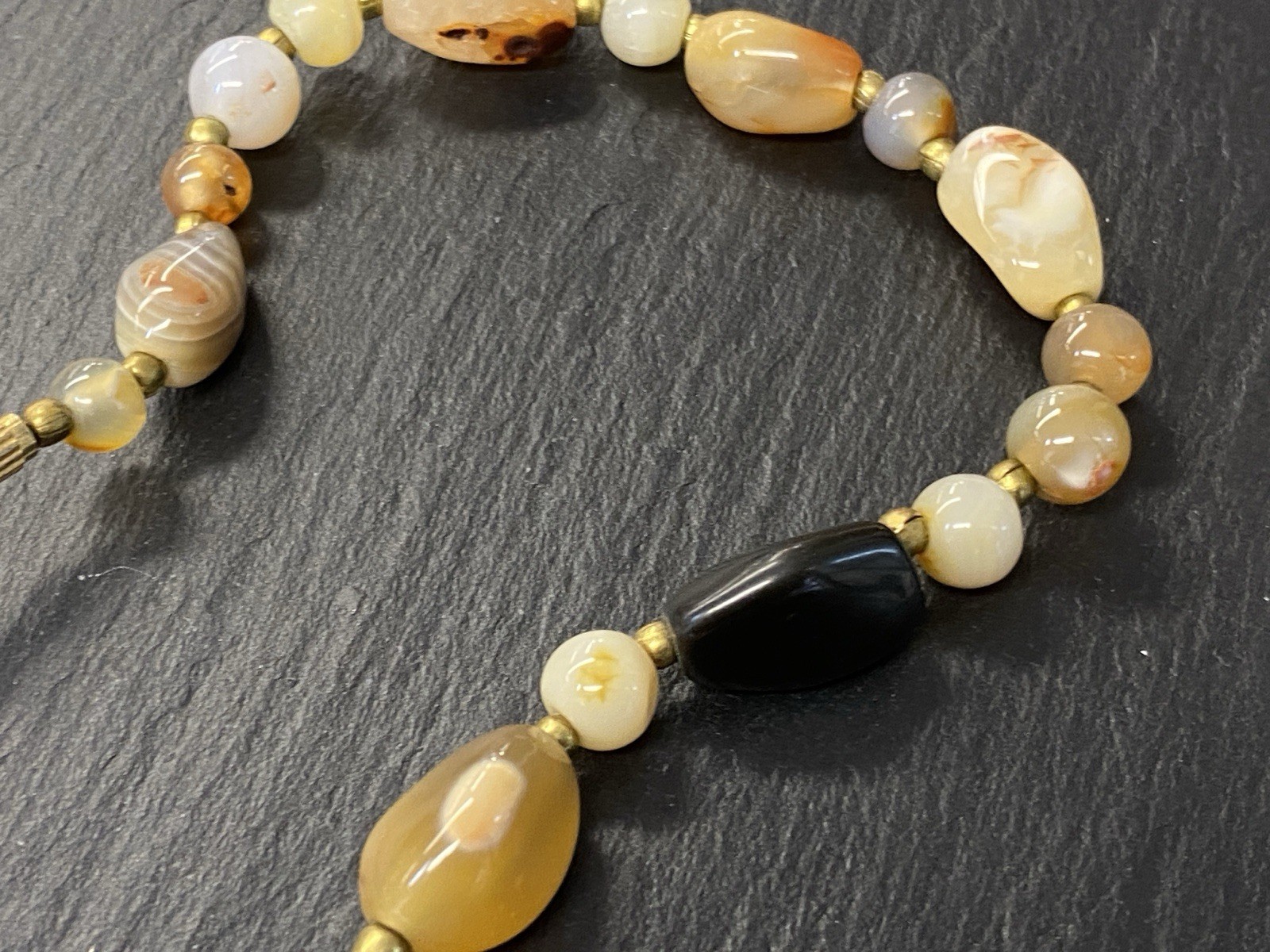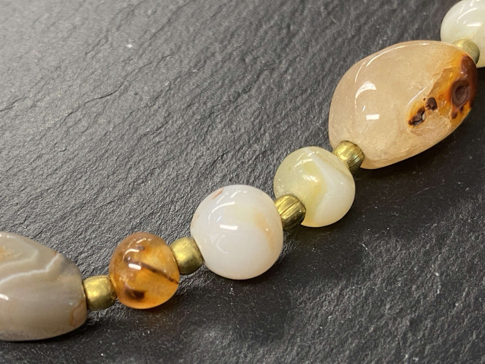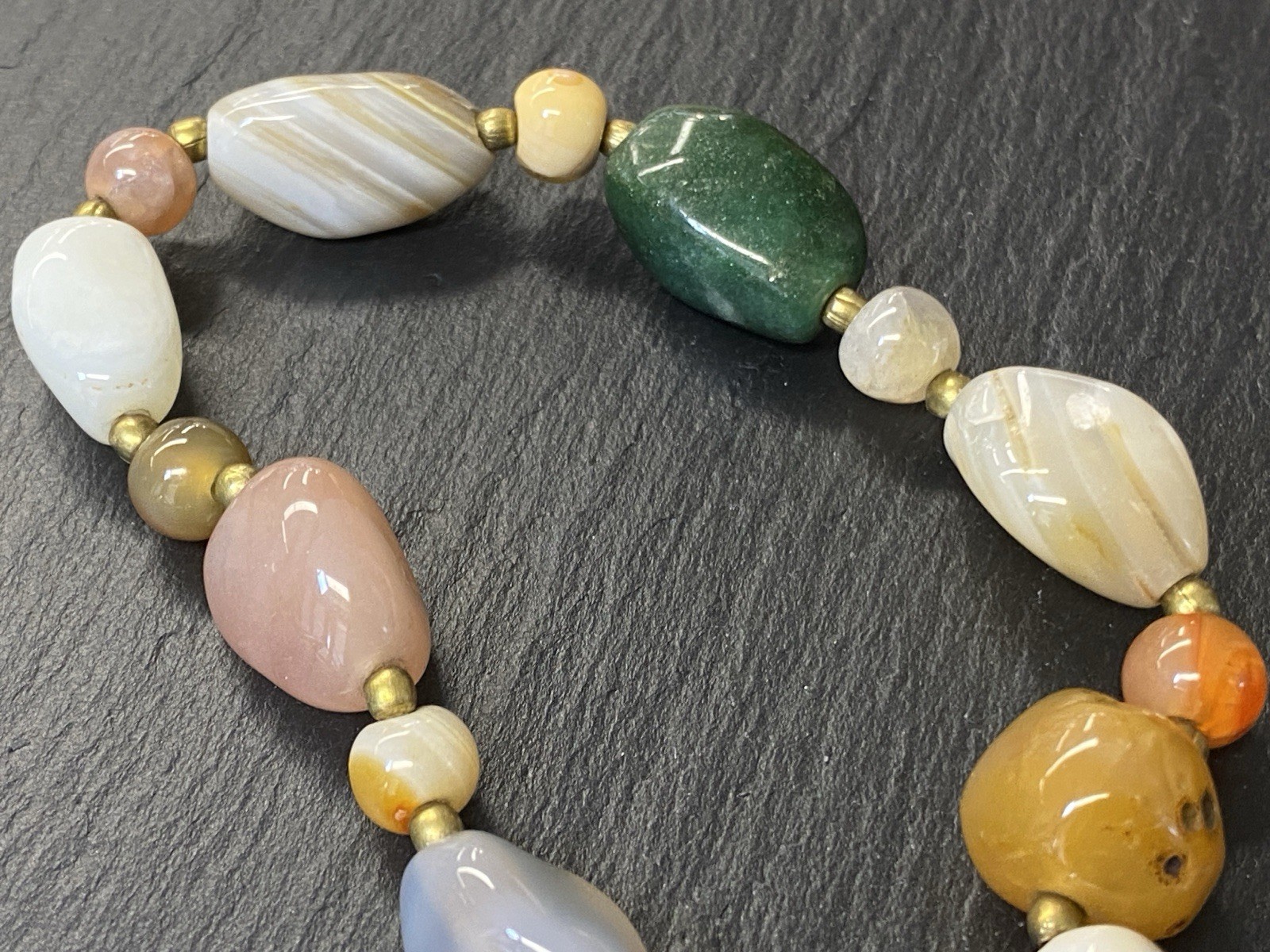 Lange Halskette aus verschiedensten Achaten, Onyx und Chrysopras mit kleinen goldfarbenen Kugeln zwischen jedem Stein. Der Verschluss und die kleinen Kugeln sind aus vergoldetem Metall. L/B der größeren Steine, an den Chrysoprasen gemessen ca. 2/1,2cm, Durchmesser der runden Steine ca. 0,8cm, Durchmesser der goldenen Kügelchen ca. 0,4cm. Gesamtlänge der Kette 91cm, Gesamtgewicht ca. 122,97g.