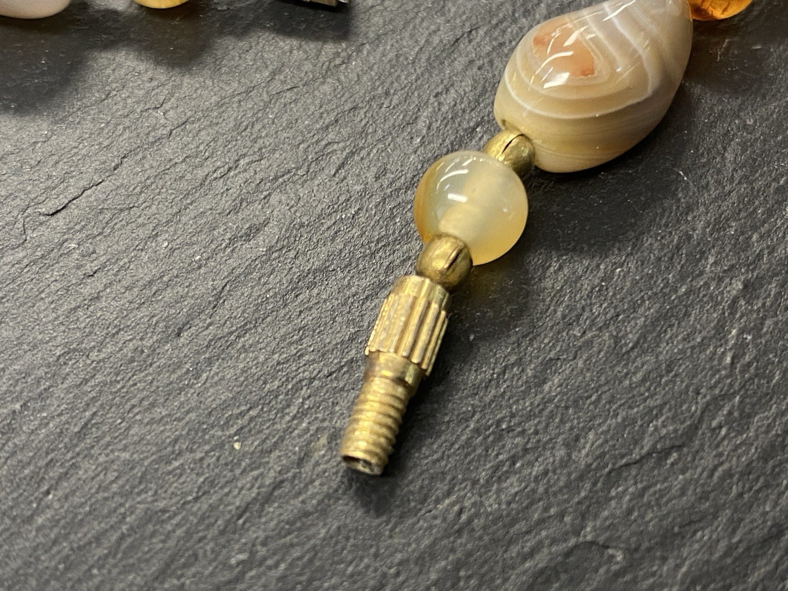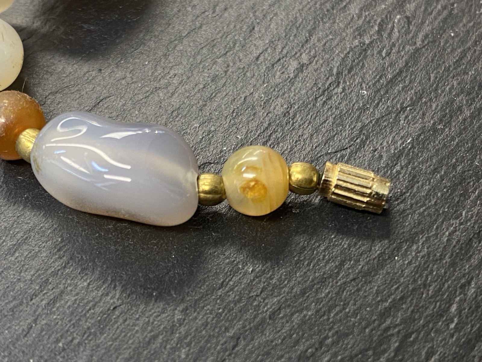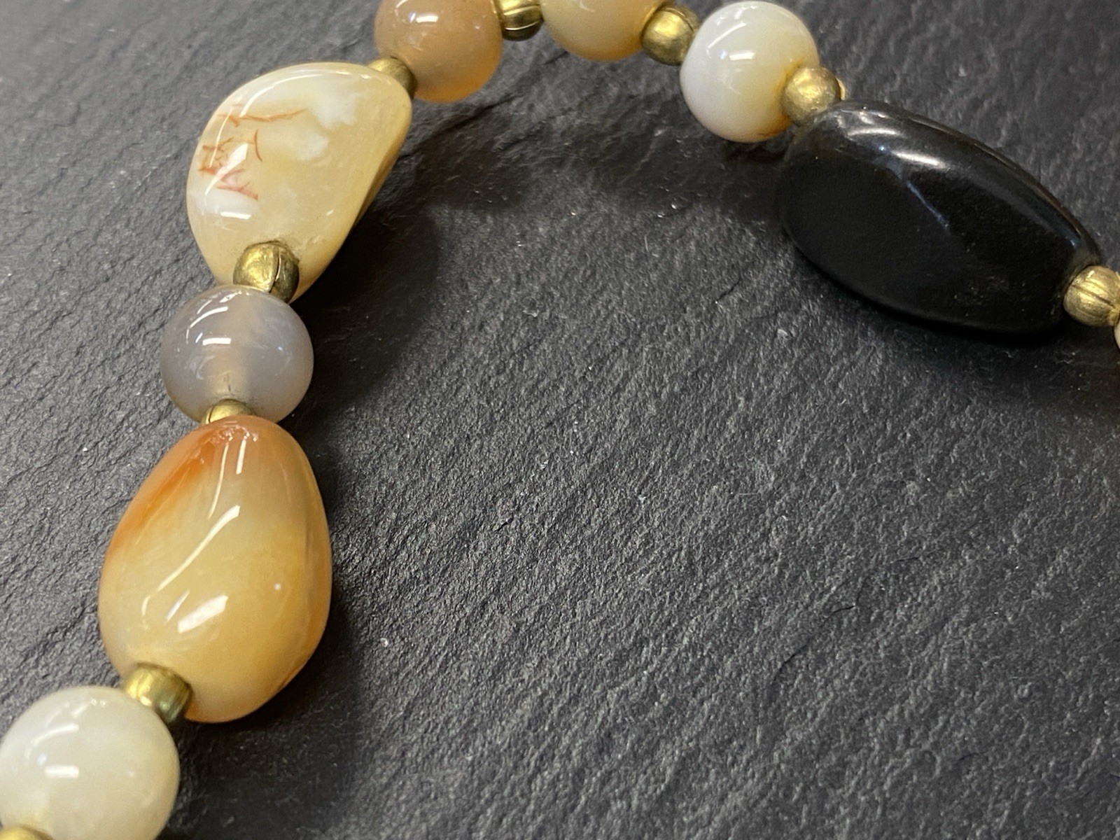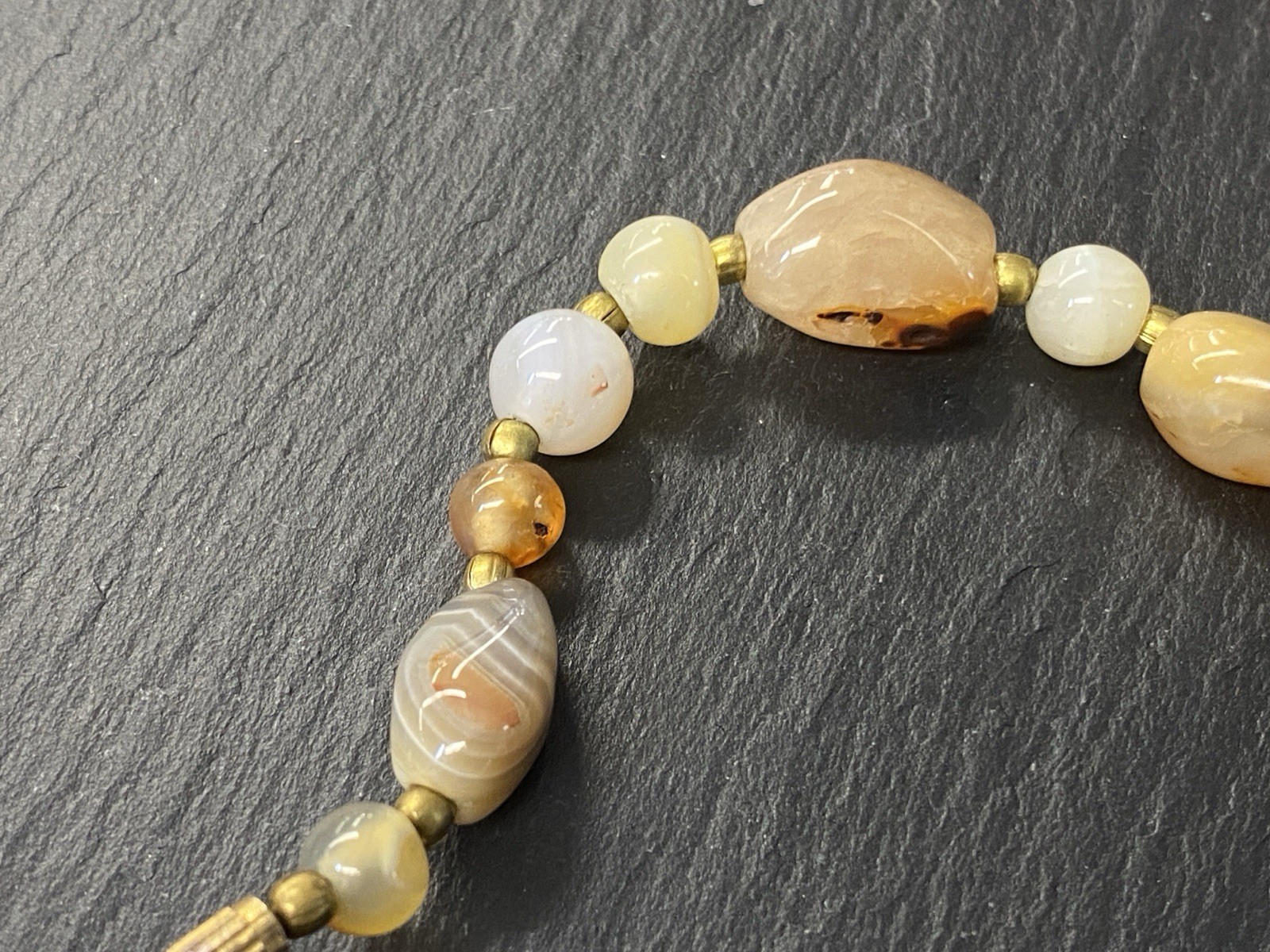 Lange Halskette aus verschiedensten Achaten, Onyx und Chrysopras mit kleinen goldfarbenen Kugeln zwischen jedem Stein. Der Verschluss und die kleinen Kugeln sind aus vergoldetem Metall. L/B der größeren Steine, an den Chrysoprasen gemessen ca. 2/1,2cm, Durchmesser der runden Steine ca. 0,8cm, Durchmesser der goldenen Kügelchen ca. 0,4cm. Gesamtlänge der Kette 91cm, Gesamtgewicht ca. 122,97g.