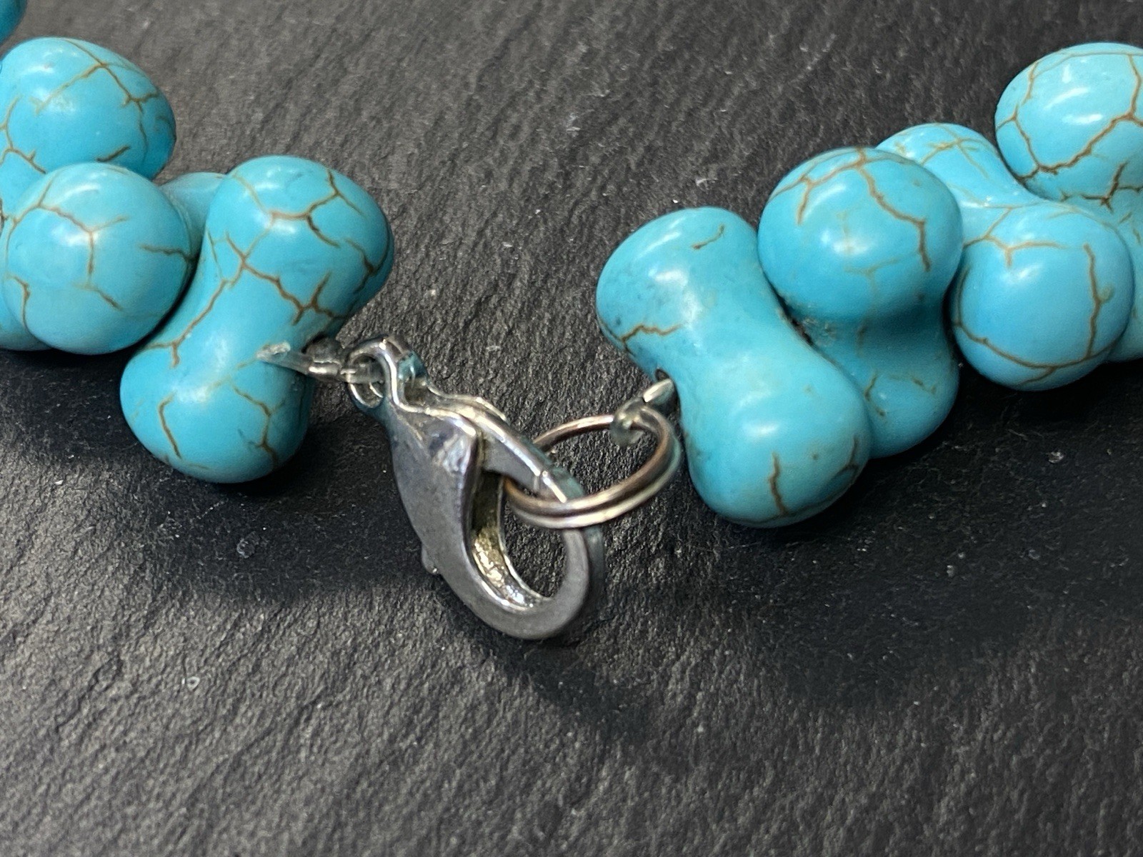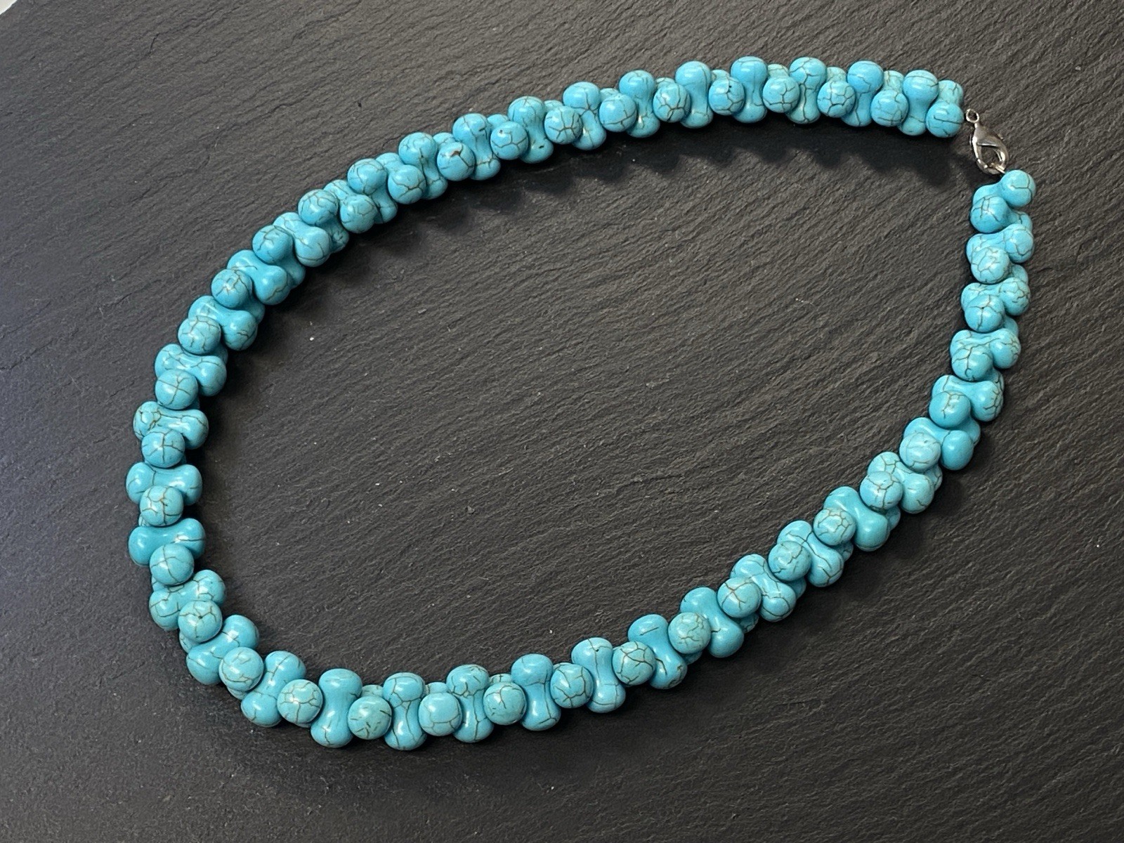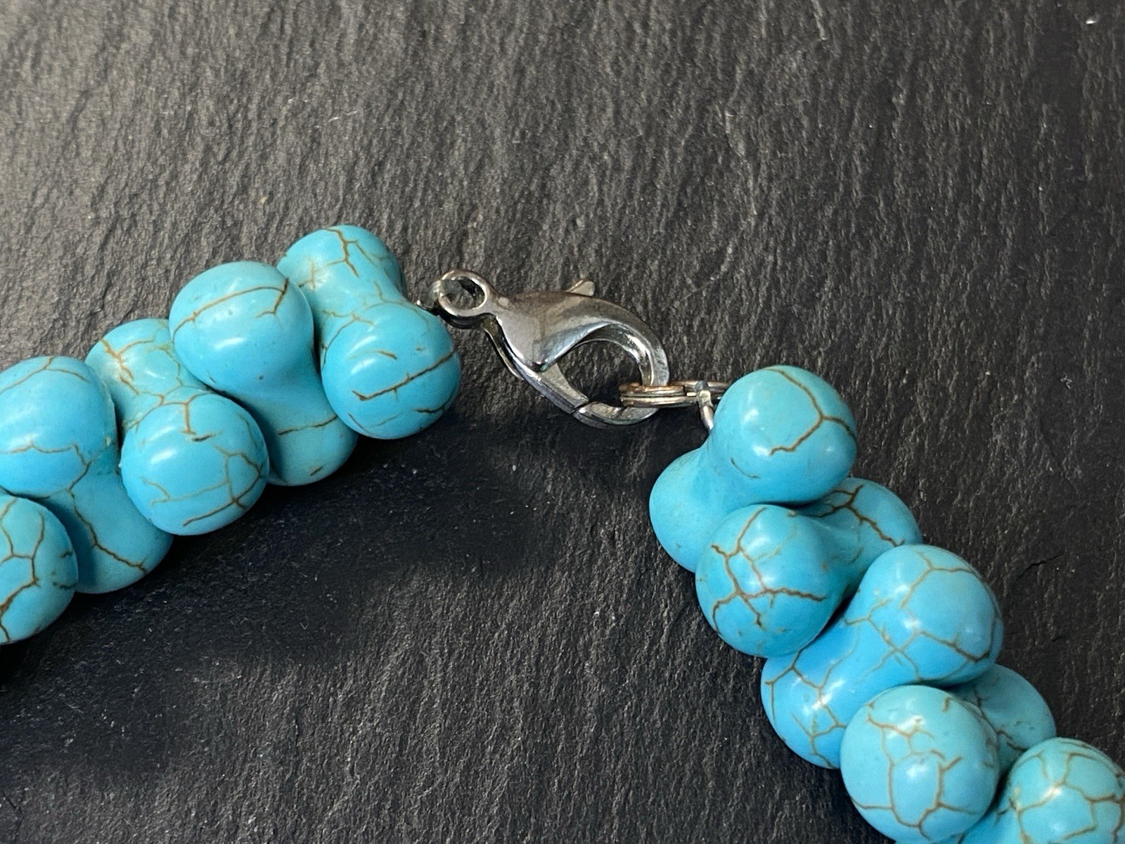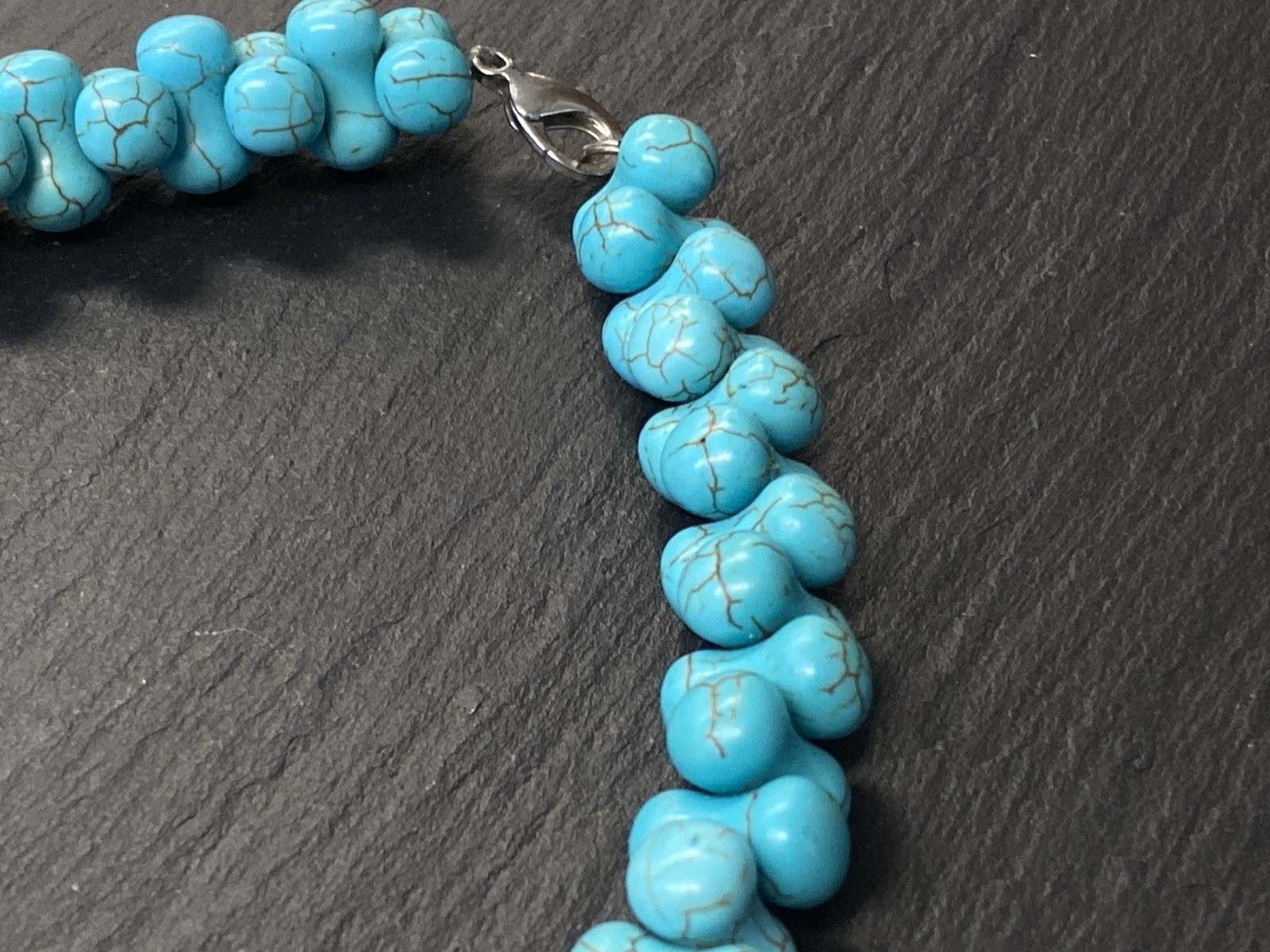 Massive Halskette aus Türkisen in ausgefallener Form, L/B der einzelnen Steine ca. 1,4/0,7cm. Der Verschluss ist aus Metall, Gesamtlänge ca. 48cm, Gesamtgewicht ca. 91,3g.