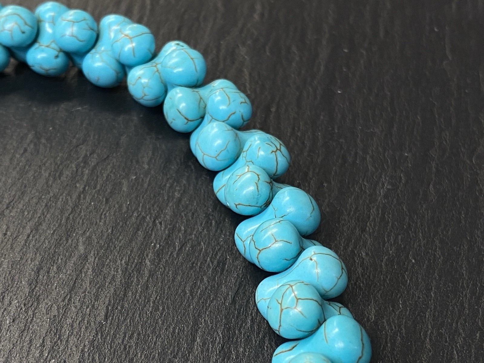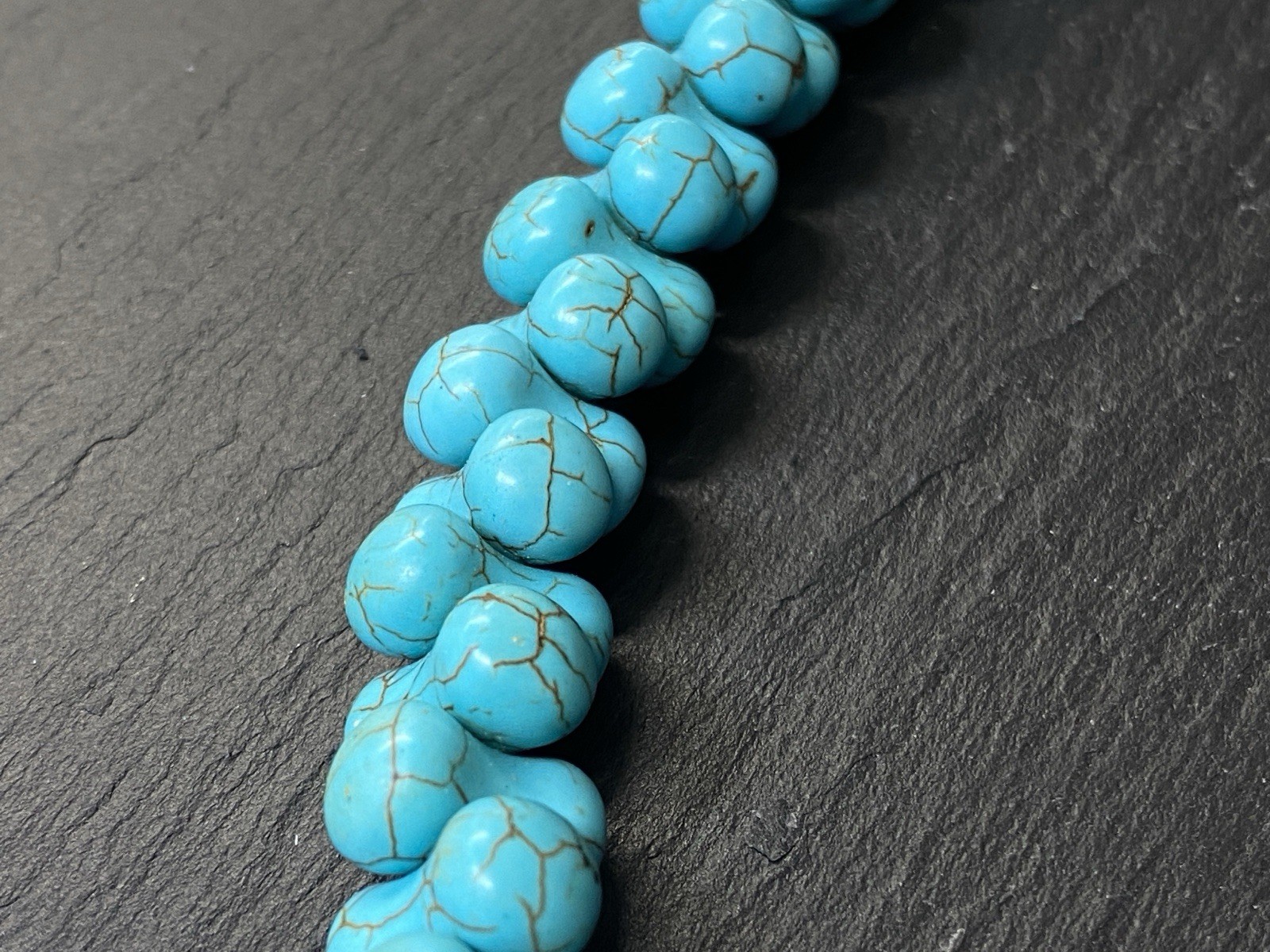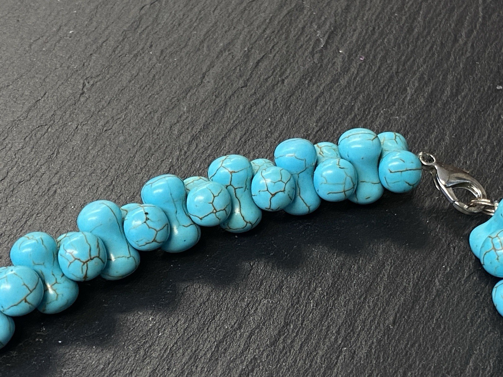 Massive Halskette aus Türkisen in ausgefallener Form, L/B der einzelnen Steine ca. 1,4/0,7cm. Der Verschluss ist aus Metall, Gesamtlänge ca. 48cm, Gesamtgewicht ca. 91,3g.