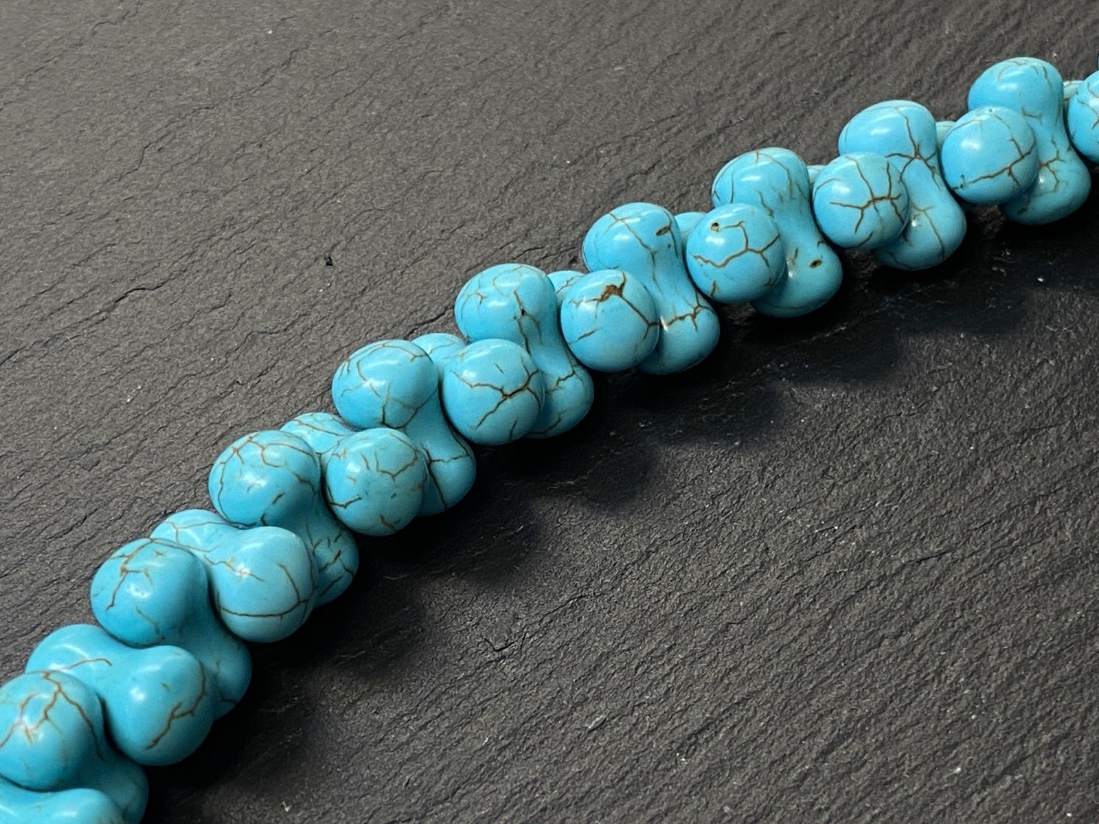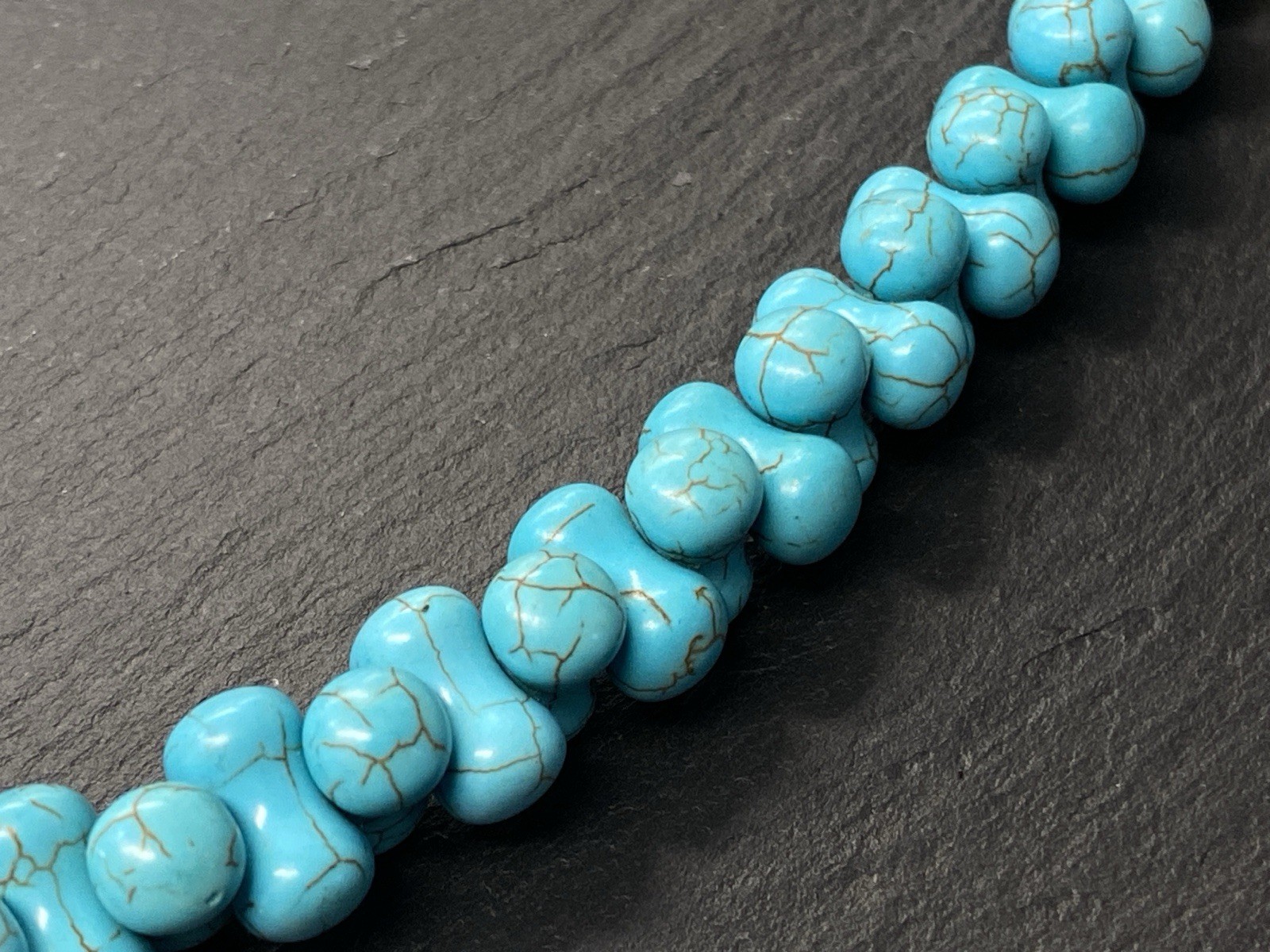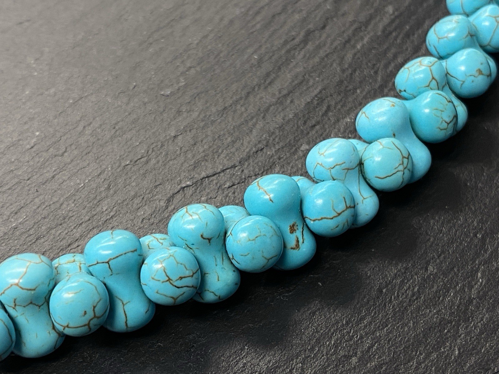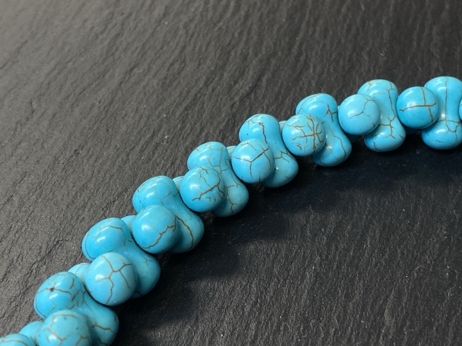 Massive Halskette aus Türkisen in ausgefallener Form, L/B der einzelnen Steine ca. 1,4/0,7cm. Der Verschluss ist aus Metall, Gesamtlänge ca. 48cm, Gesamtgewicht ca. 91,3g.