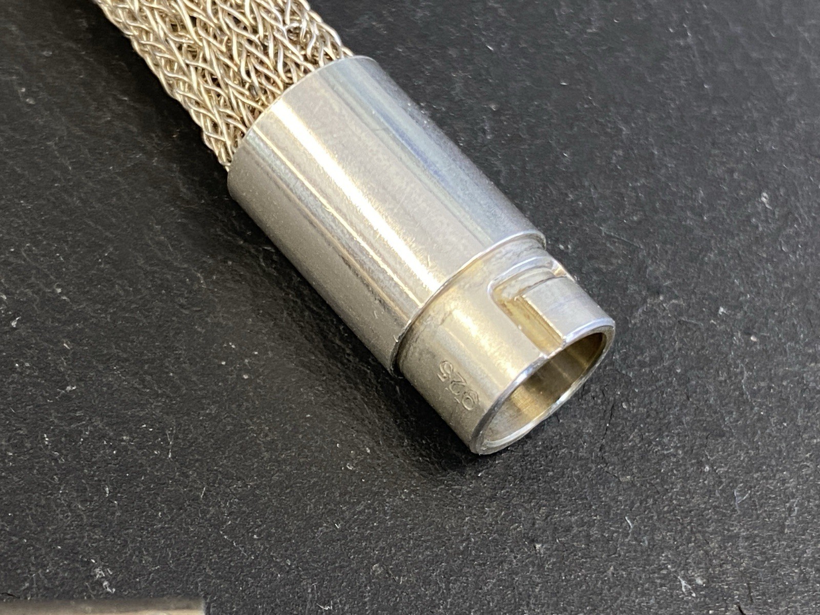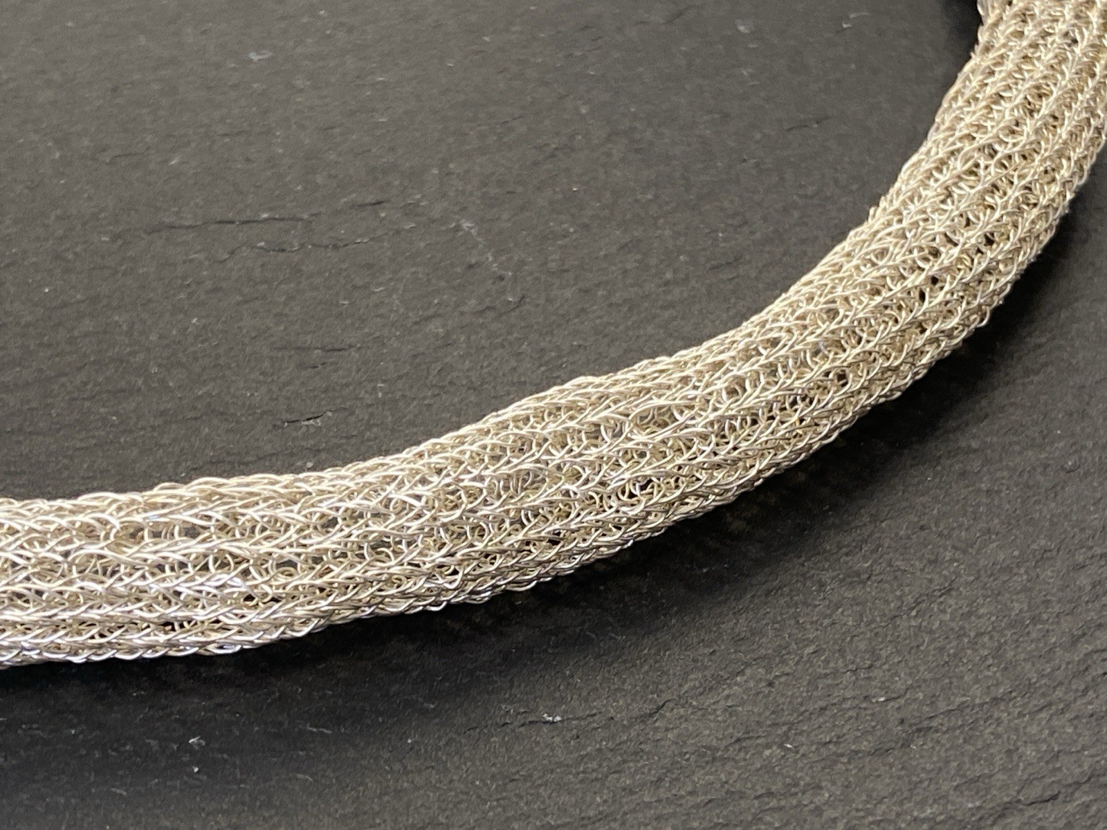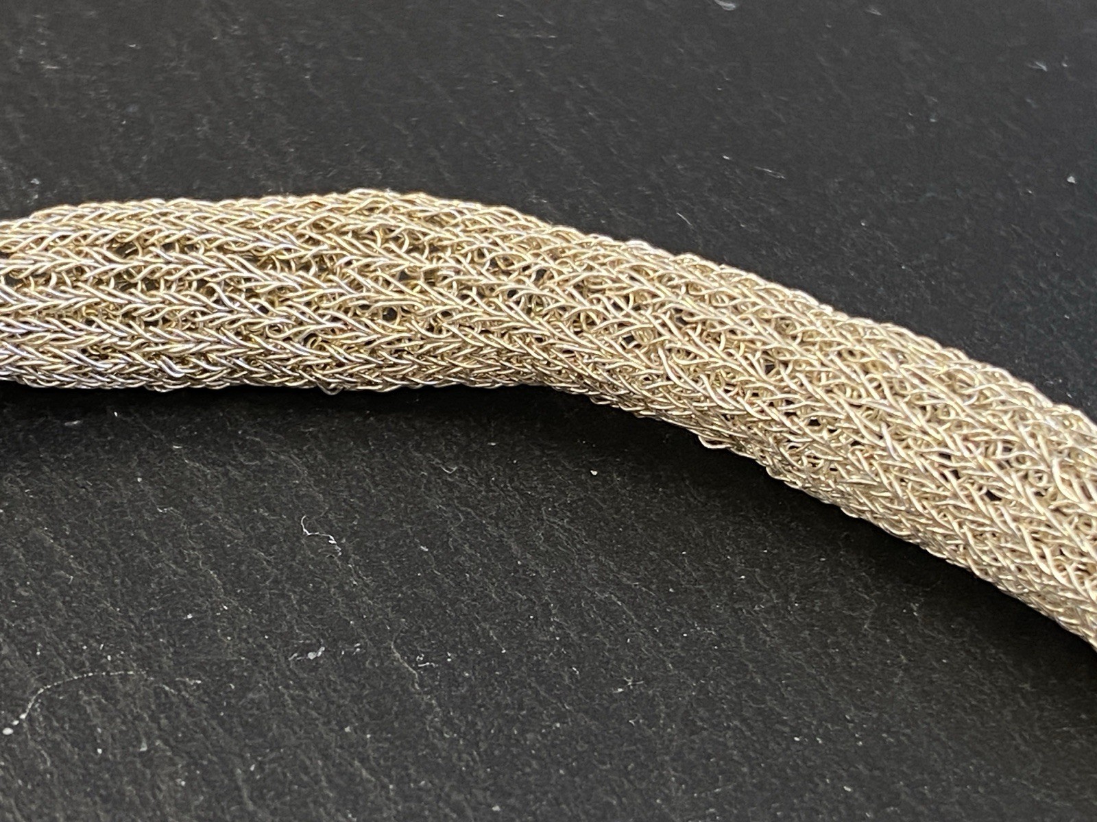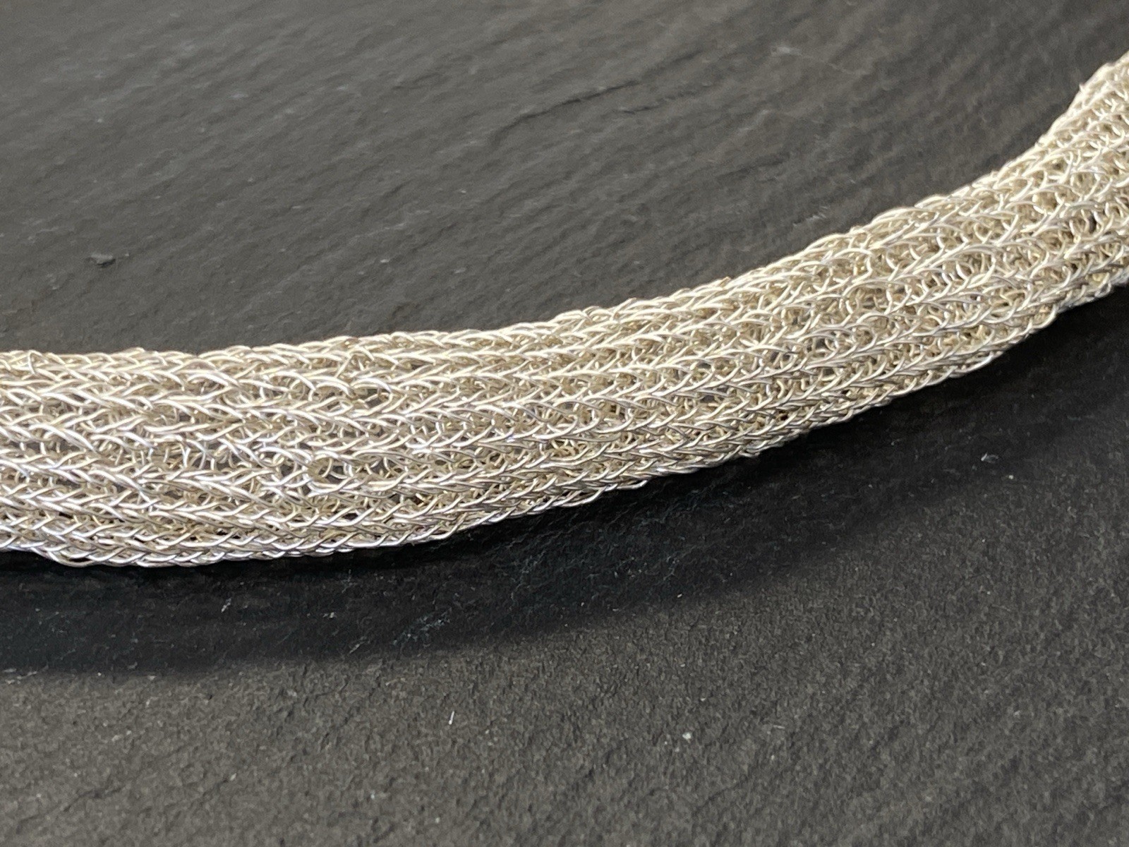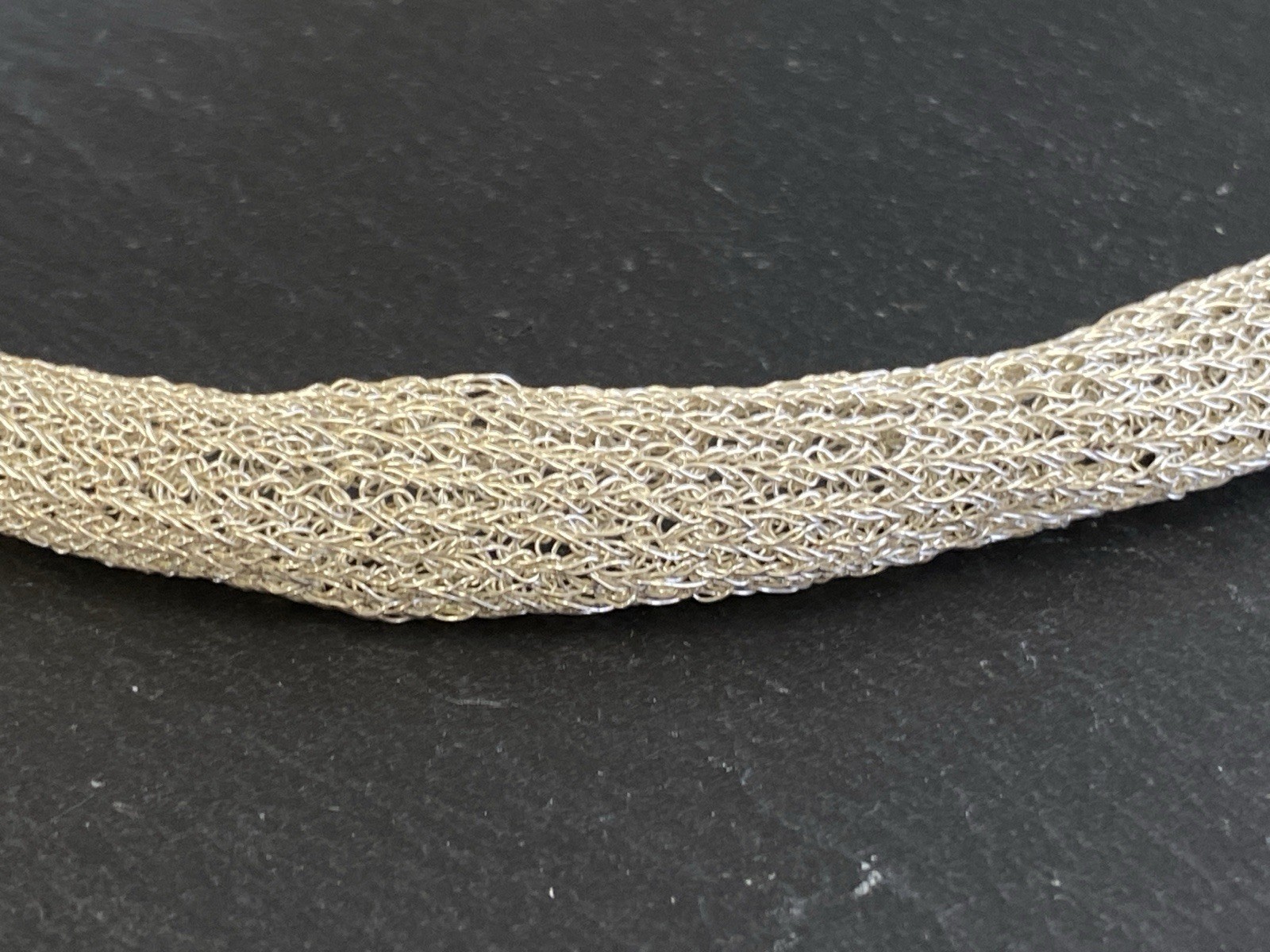 Röhrenförmige Modeschmuck Halskette mit Verschluss aus 925 Silber, gestempelt, in Mesh Optik. Die Kette an sich ist verdellt und nicht mehr vollständig rund. Der Verschluss schließt und ist leicht berieben. D/L 1/46cm, Gesamtgewicht ca. 33,61g.