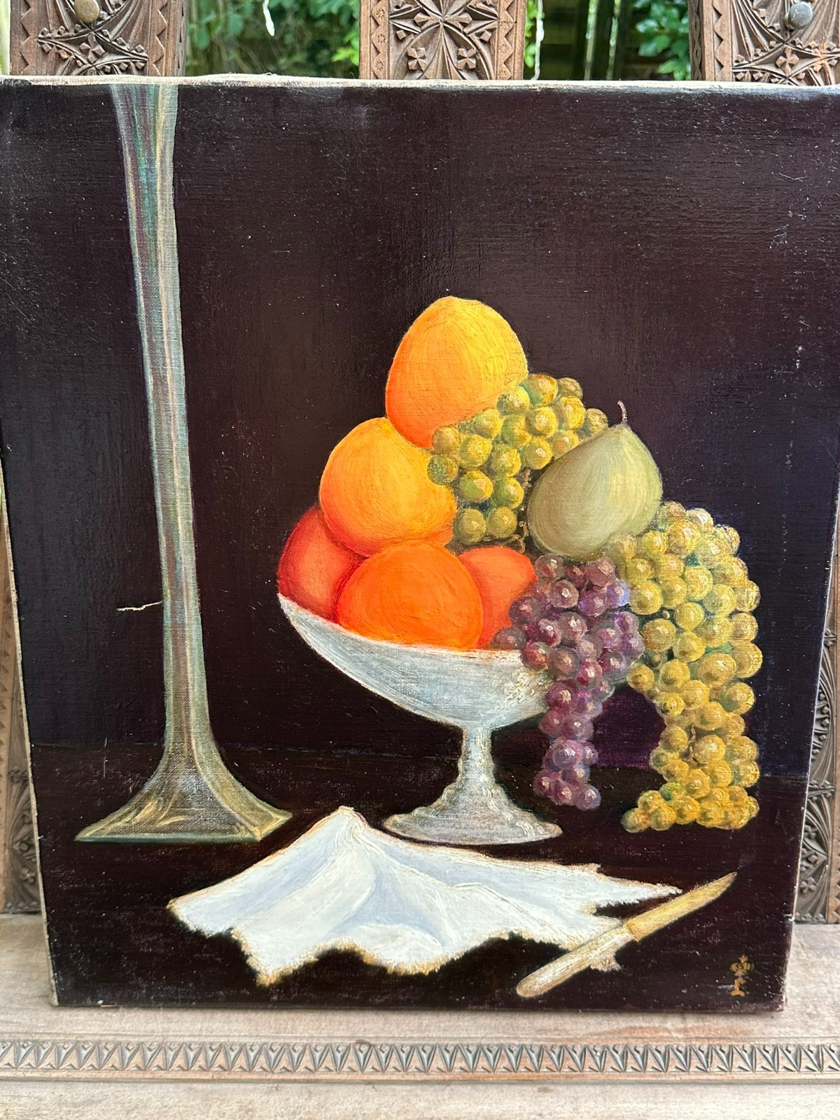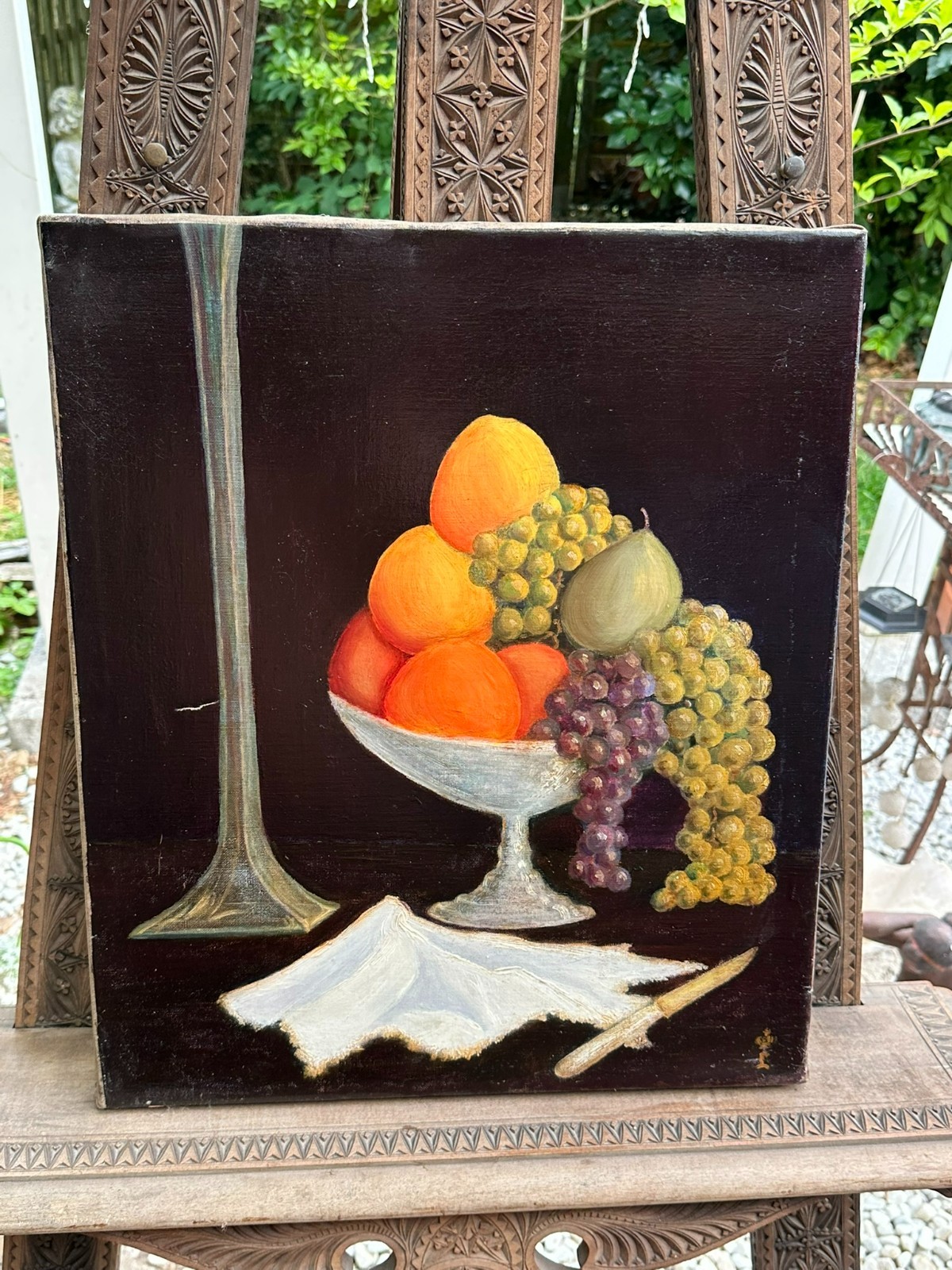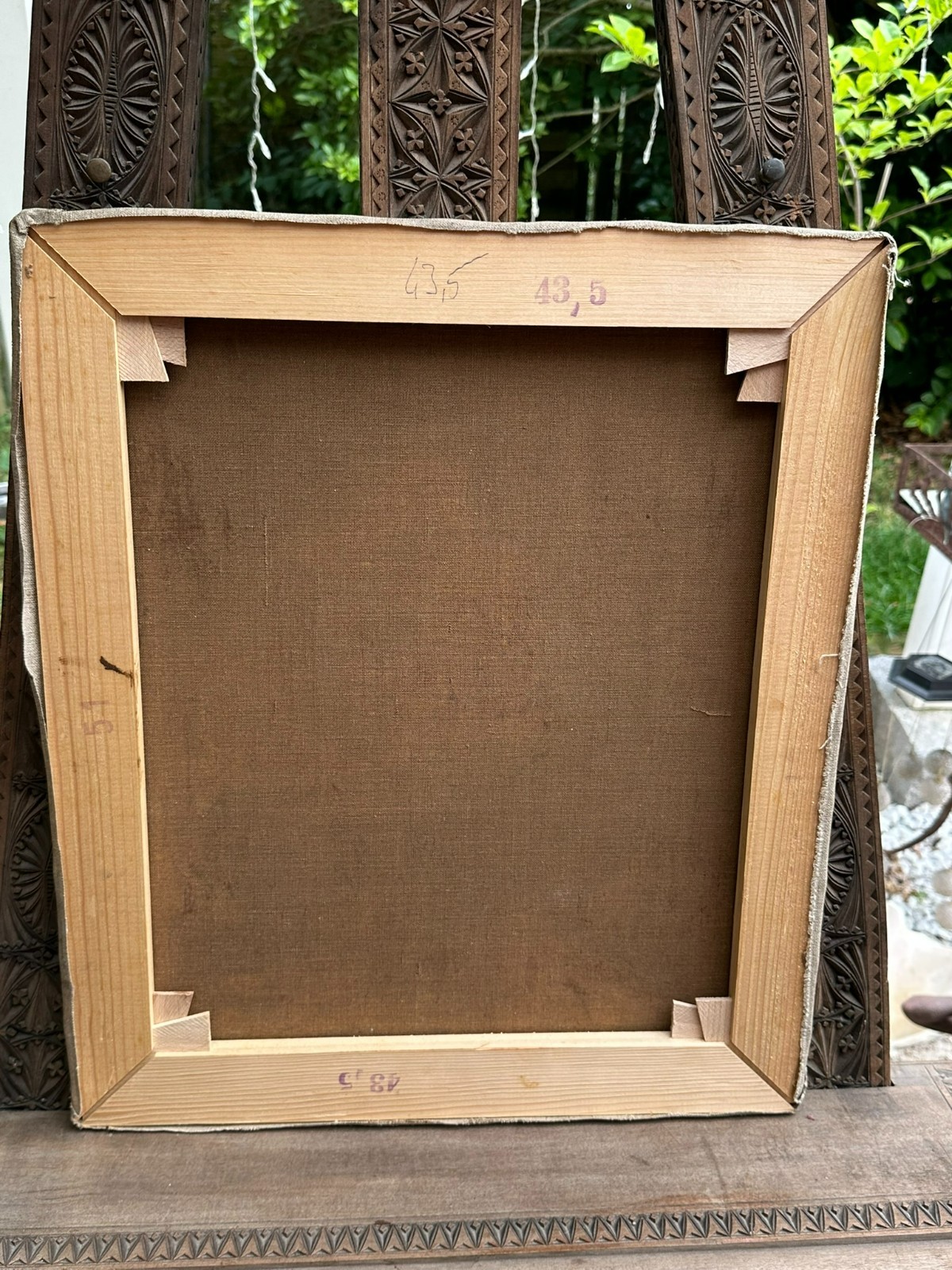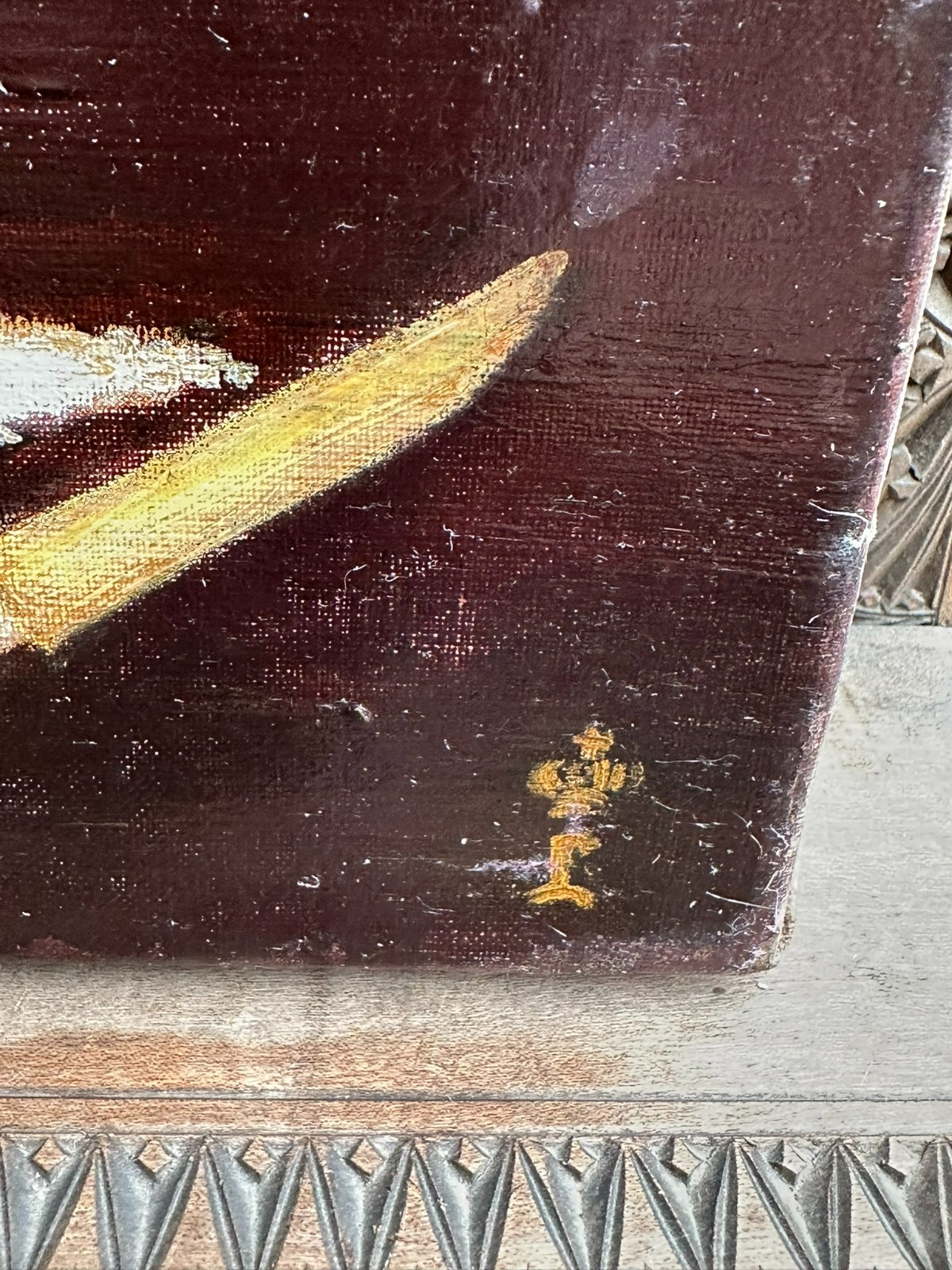 Altes Ölgemälde auf Leinwand, auf Leinwand doubliert, unten rechts Monogramm. Links mittig Leinwandschaden. Abmessungen 44x52cm.
