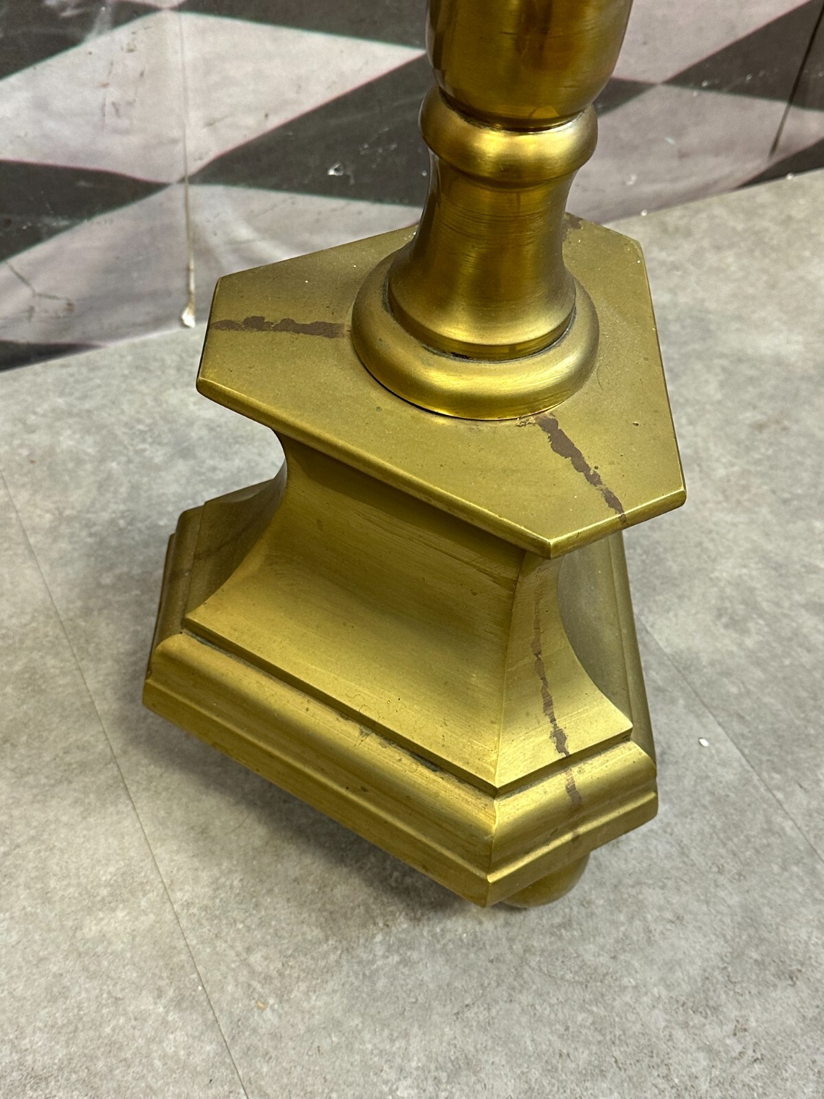 Sehr großer, neobarock Kerzenleuchter aus Messing, 18KG und 107cm hoch, zweite Hälfte 20. Jahrhundert, Oberfläche zum Teil berieben und leicht fleckig, in der Kerzenaufnahme leichte Korrosion. Oben Außendurchemsser: 22,5cm. Der Leuchter ist komplett zerlegbar, der Versand erfolgt in zerlegtem Zustand.