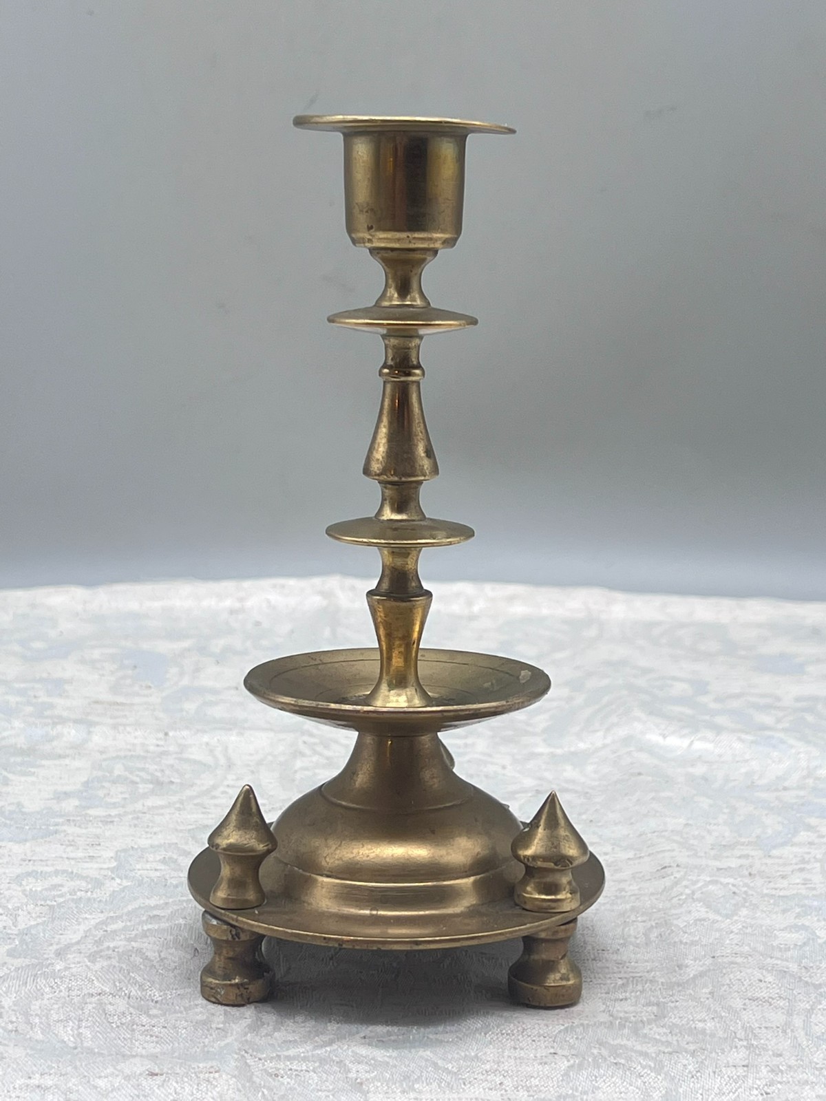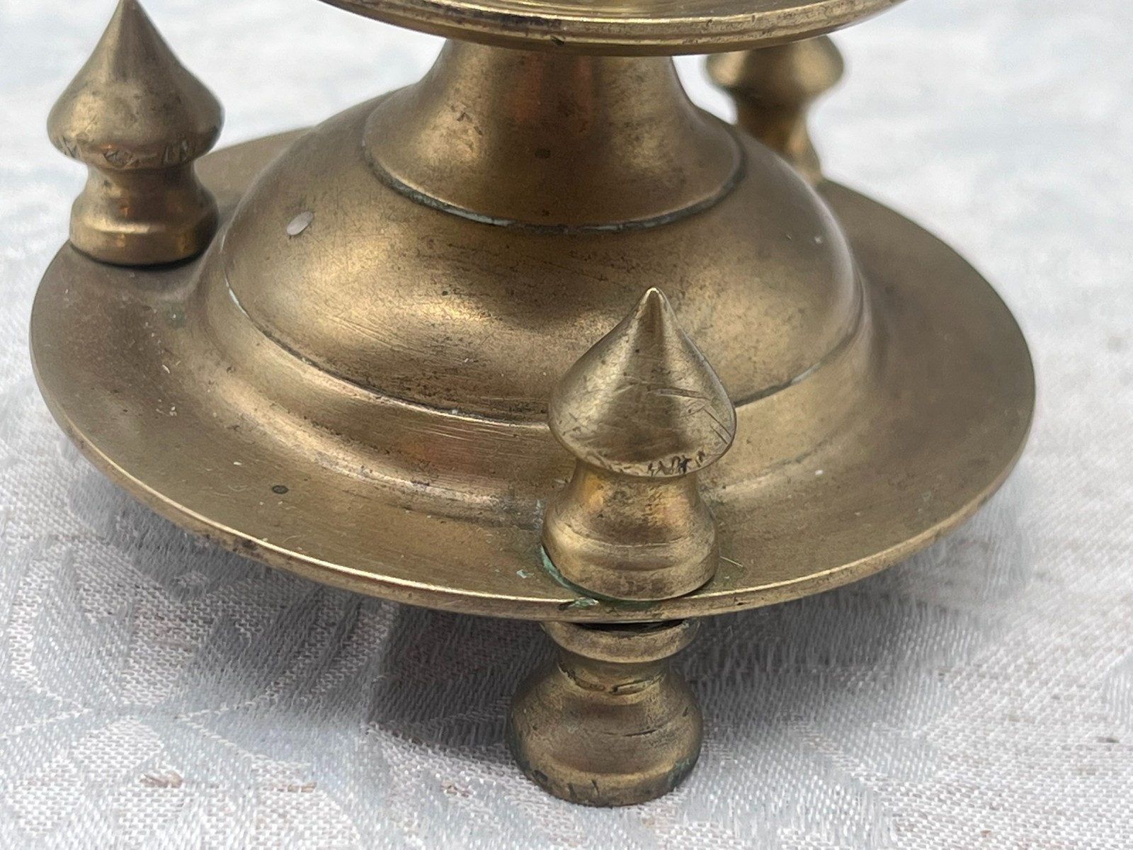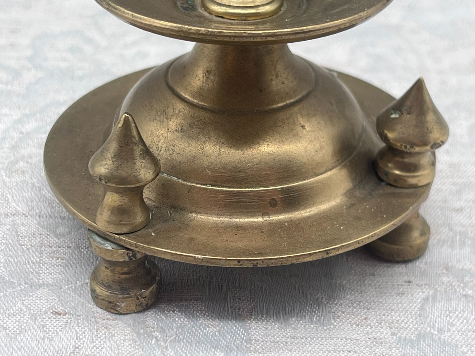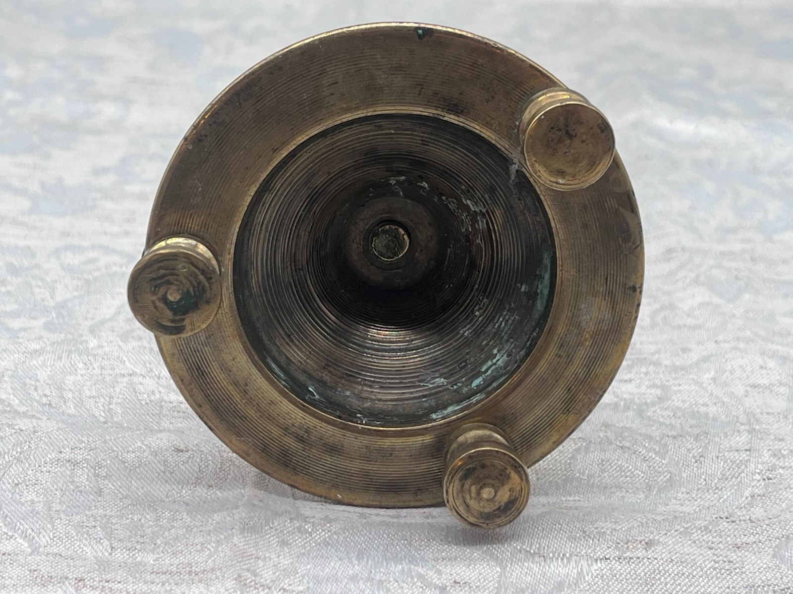 Neogotischer Kerzenleuchter aus Messing, 19/20igstes Jhd. Gewicht 555g, Oberfläche zum Teil berieben, leichte Gußfehler. Höhe/Durchmesser 18/9cm.
