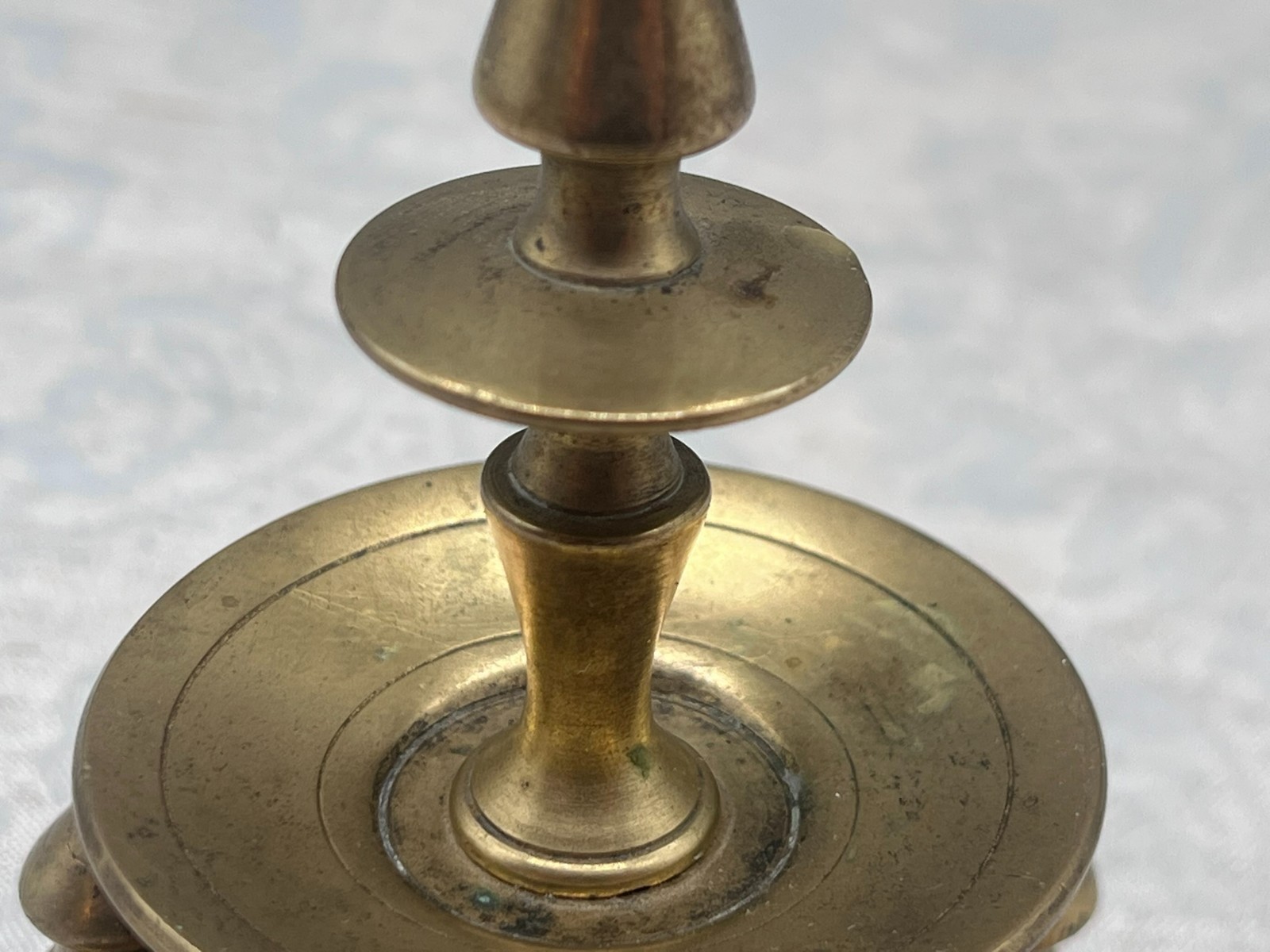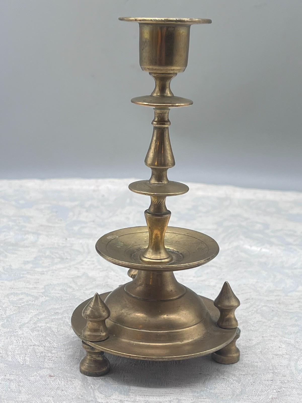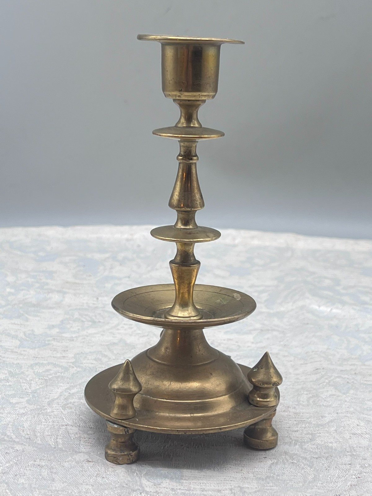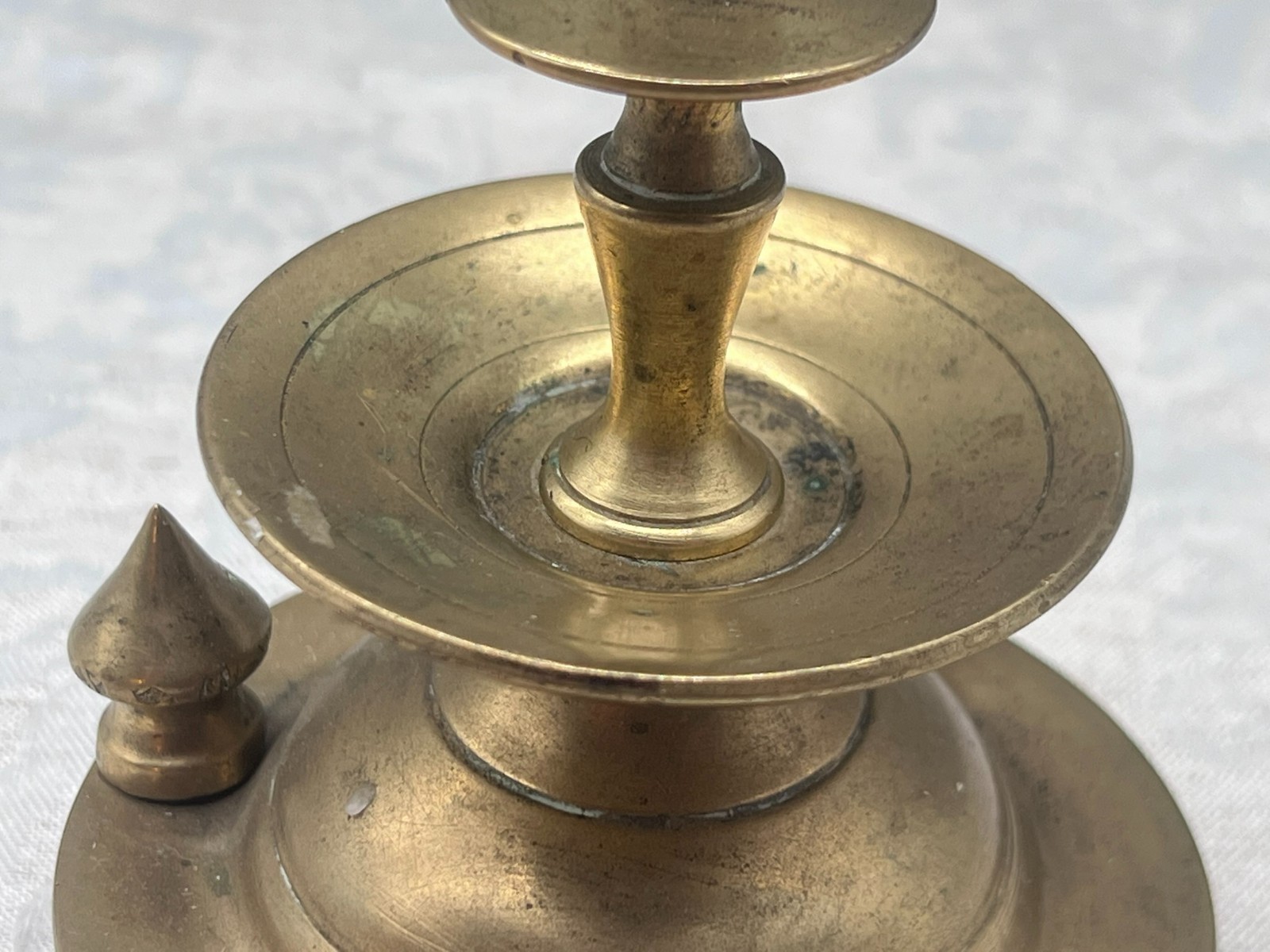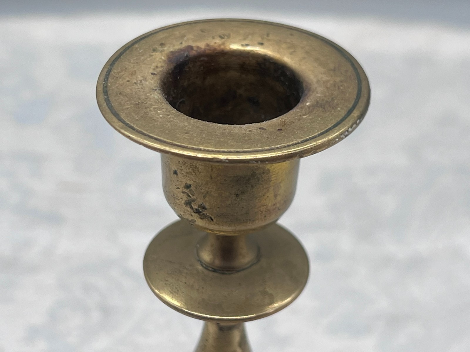 Neogotischer Kerzenleuchter aus Messing, 19/20igstes Jhd. Gewicht 555g, Oberfläche zum Teil berieben, leichte Gußfehler. Höhe/Durchmesser 18/9cm.