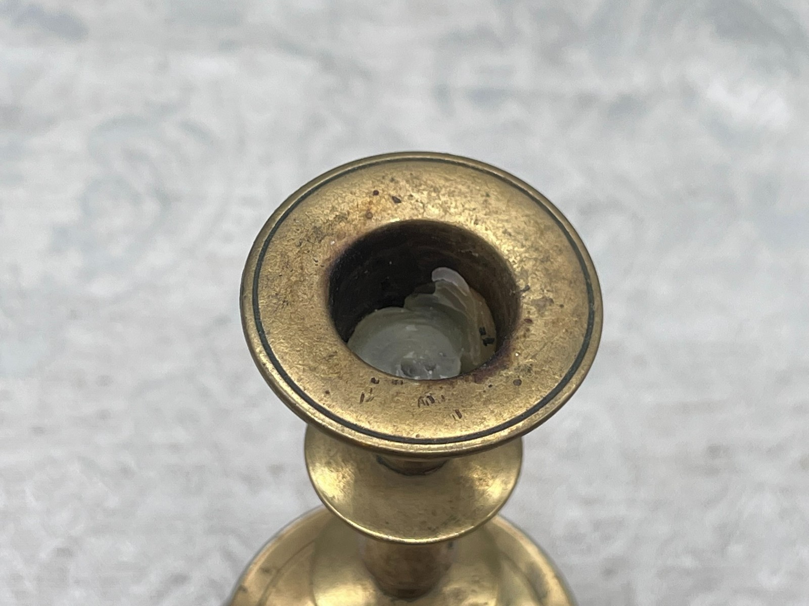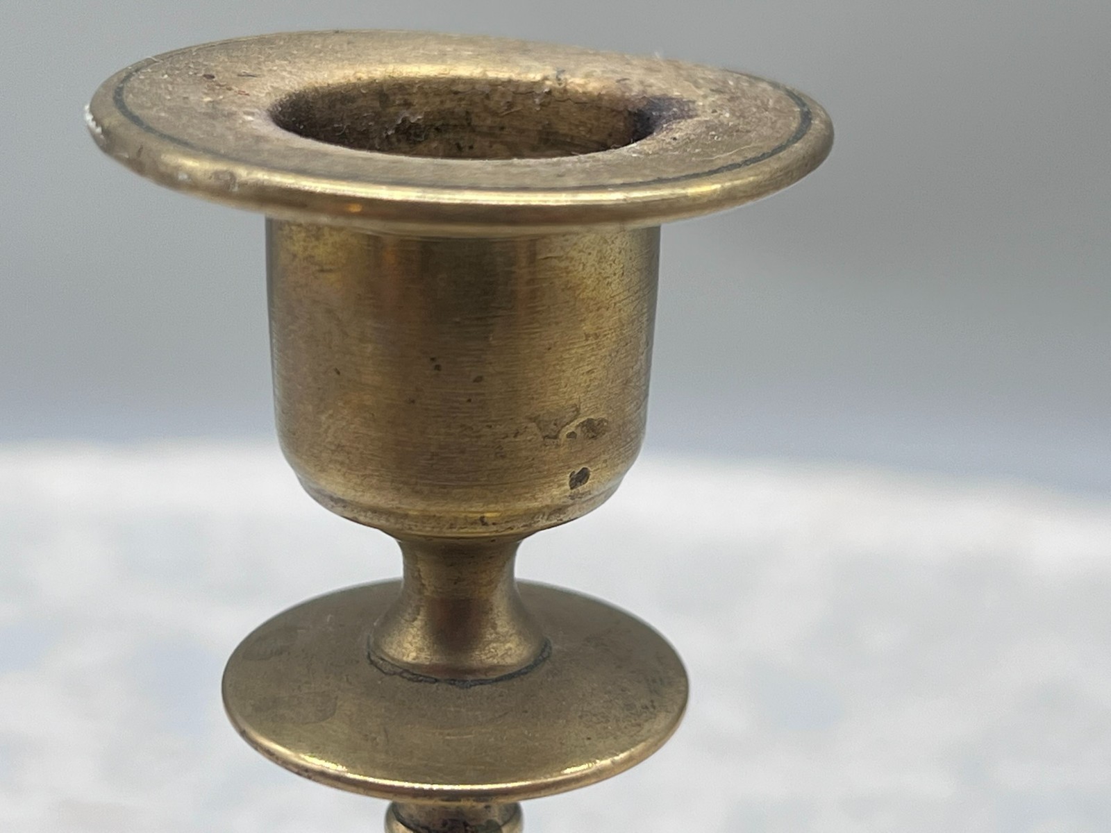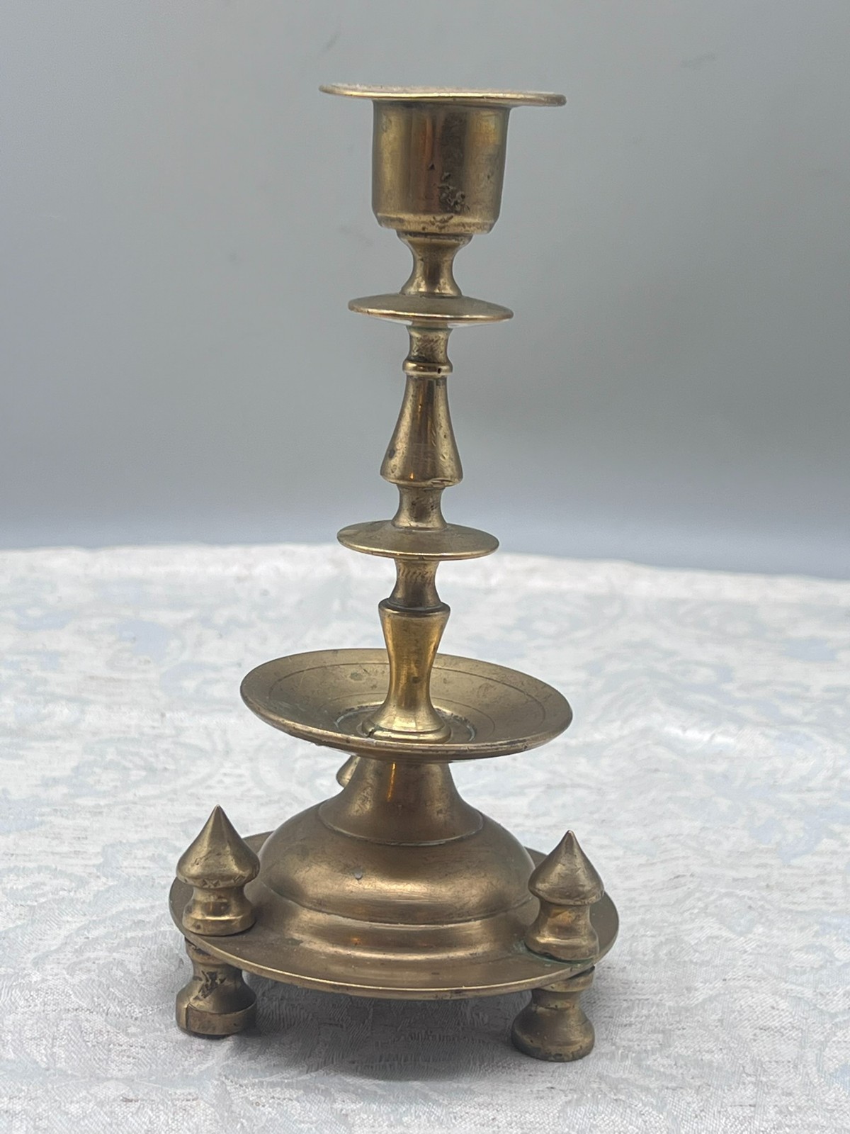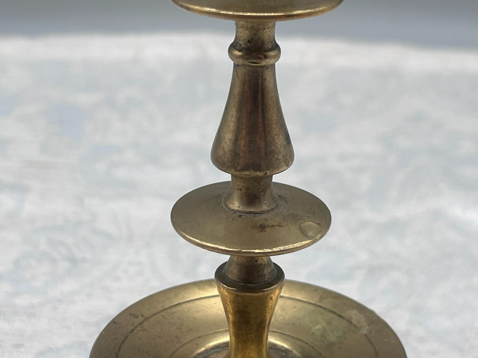 Neogotischer Kerzenleuchter aus Messing, 19/20igstes Jhd. Gewicht 555g, Oberfläche zum Teil berieben, leichte Gußfehler. Höhe/Durchmesser 18/9cm.