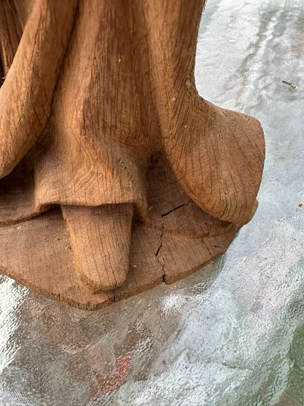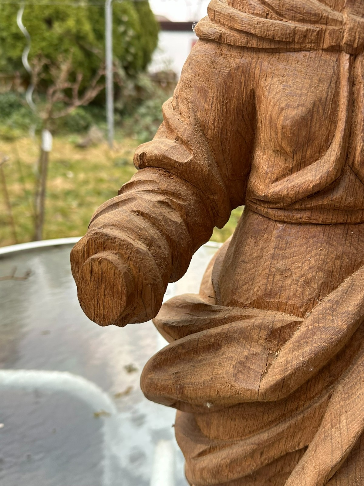 Neogotische Heiligenfigur aus massiver Eiche, 20tes Jahrhundert. Oberfläche handgeschnitzt, teils nicht fertig gestellt, Montageplatten / Zapfen möglich (siehe Fotos). Diverse Unvollständigkeiten, Dehnungsrisse, Bestossungen, möglicherweise teils ergänzt. Höhe 68cm.