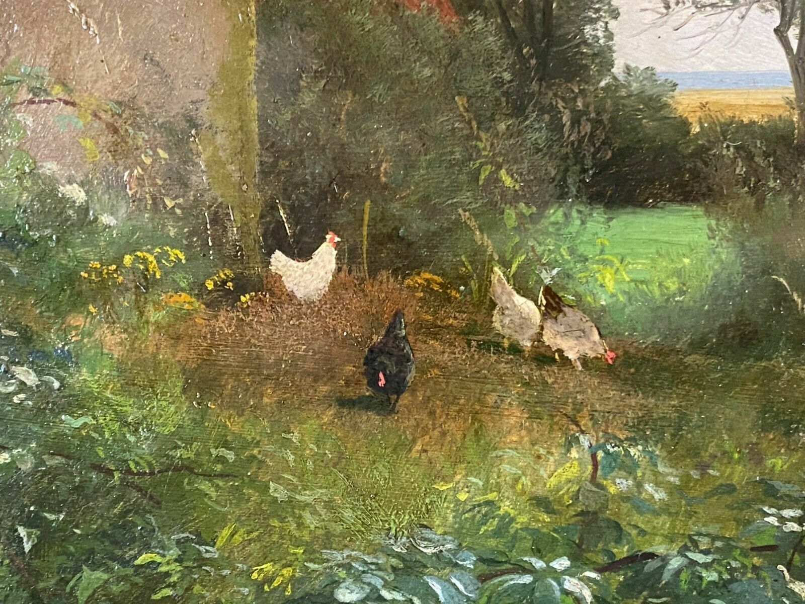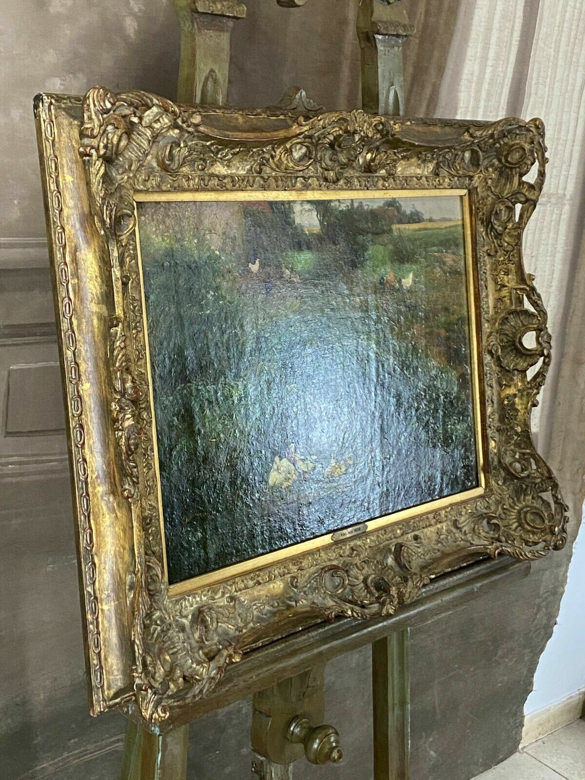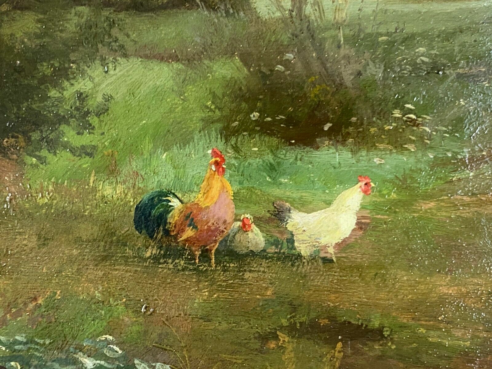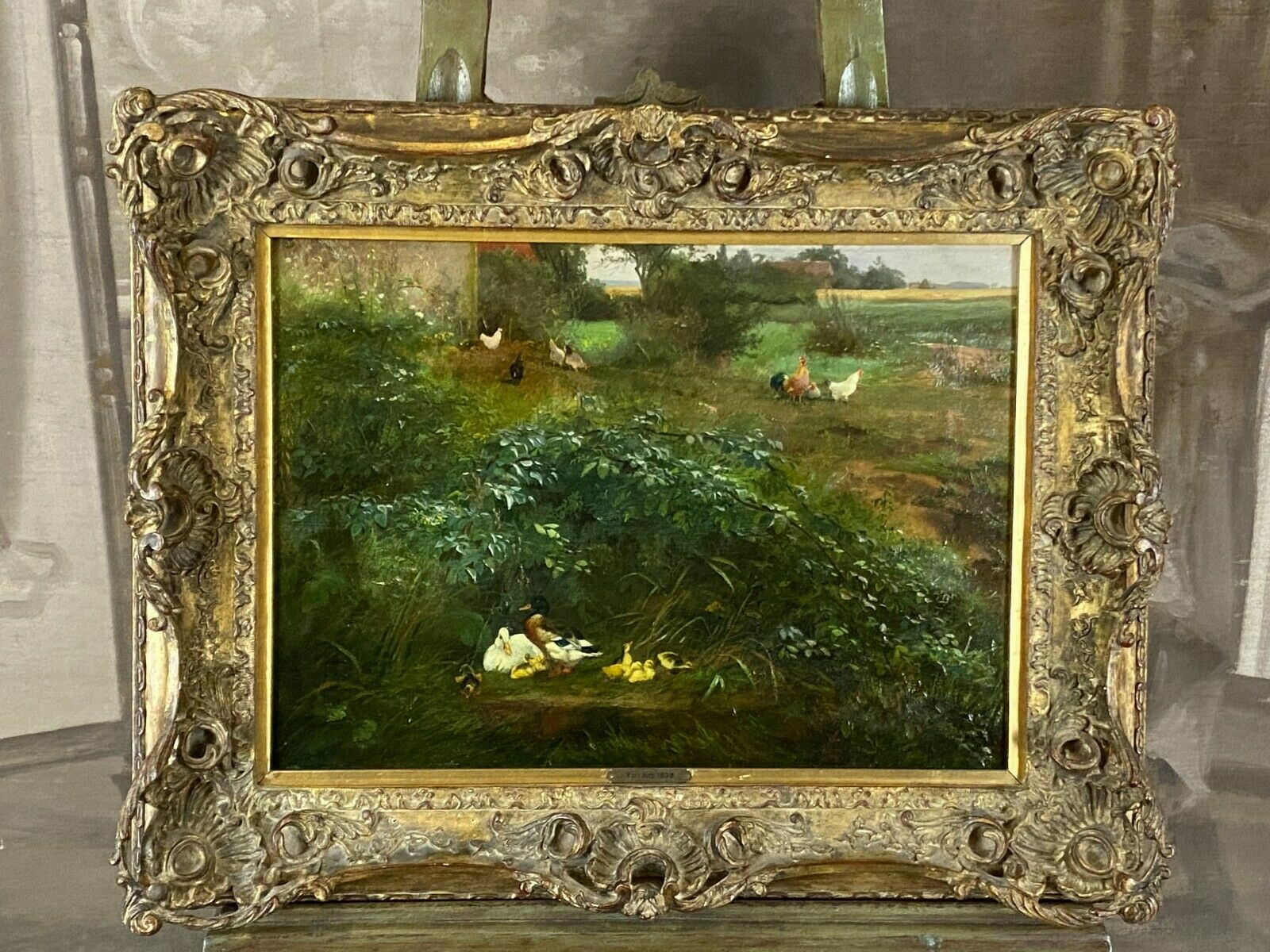 ÖL GEMÄLDE FEDERVIEH AM GEHÖF IM PRUNKRAHMEN AUF KARTON Carl I JUTZ (1838-1916)