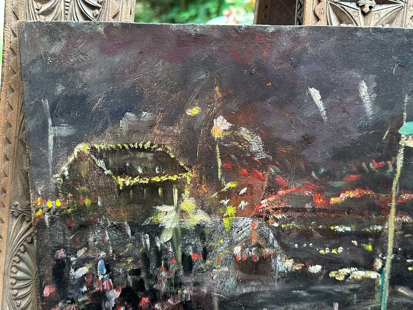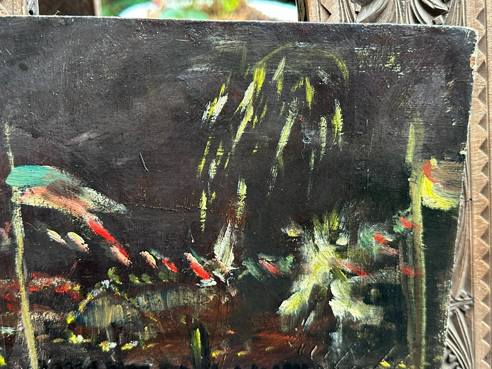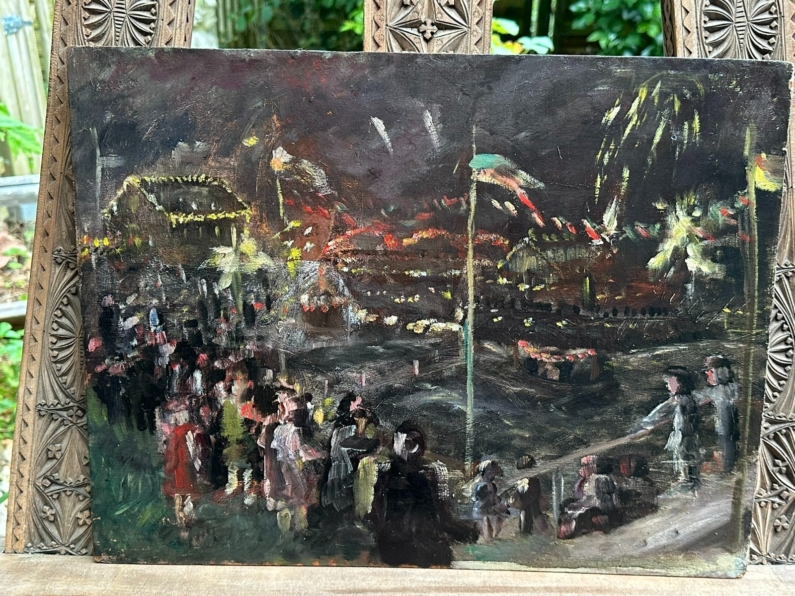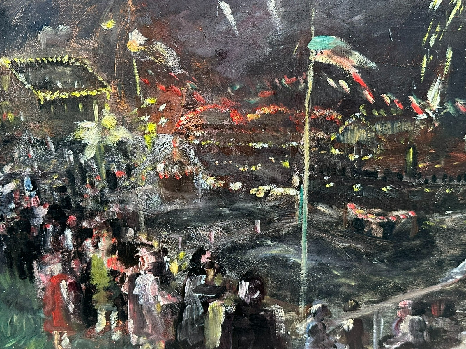 Ölgemälde auf Platte, unsigniert. Rückseitig bezeichnet Devambez, Feuerwerk. Sehr schöner Zustand, im Randbereich minimal berieben und bestossen. Abmessungen 45x35cm.