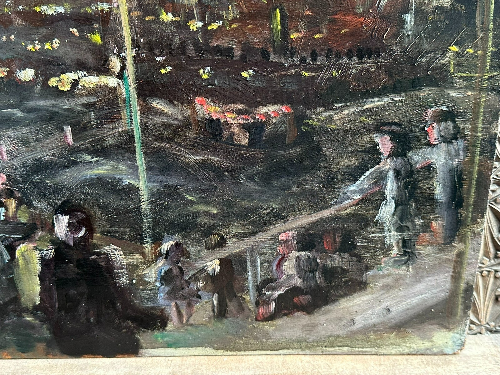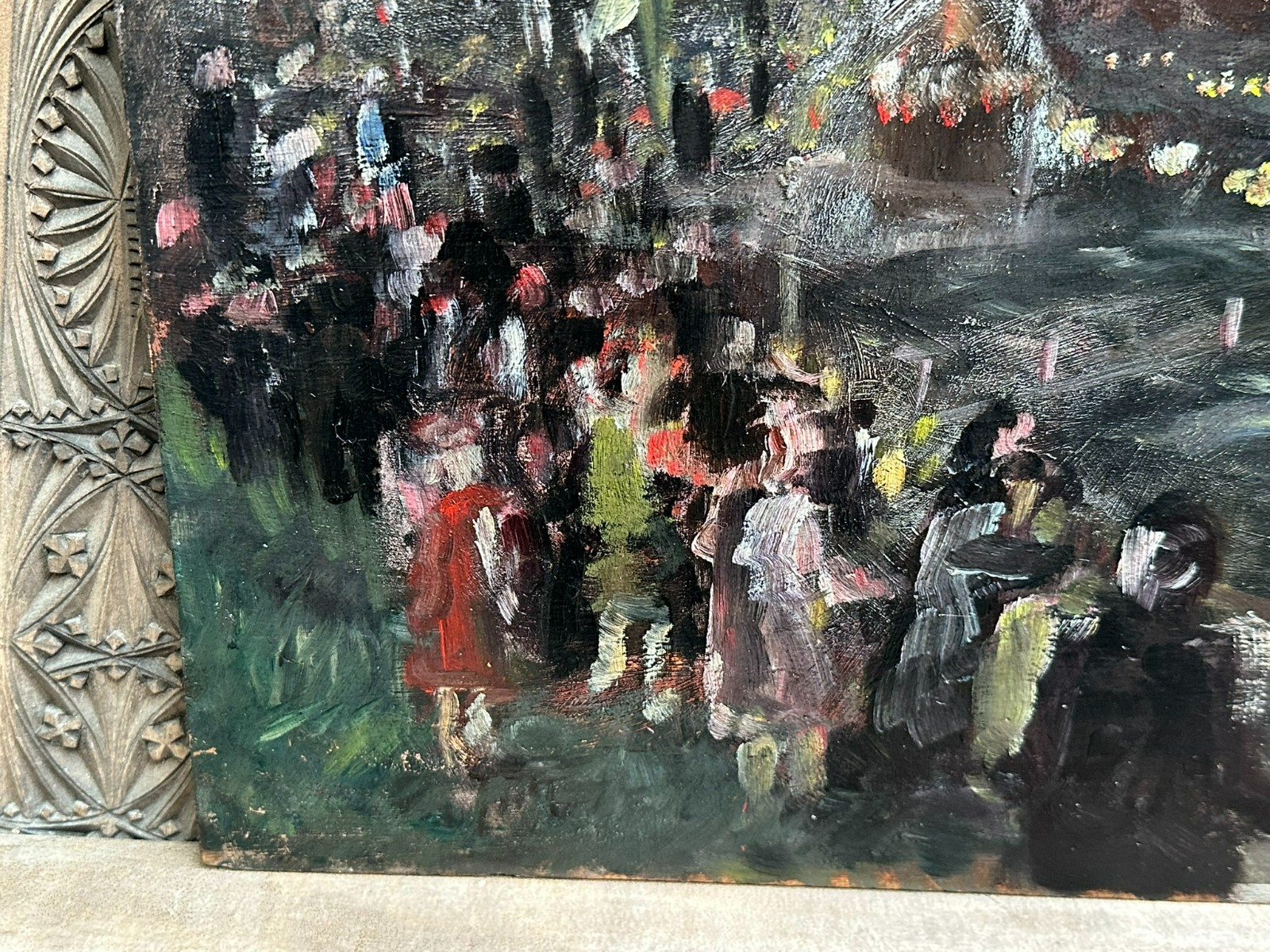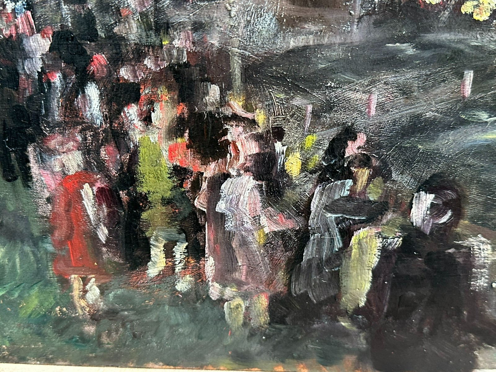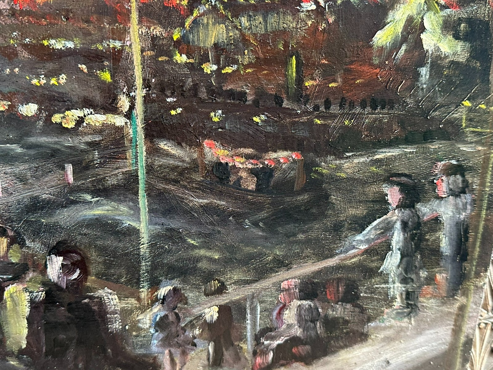 Ölgemälde auf Platte, unsigniert. Rückseitig bezeichnet Devambez, Feuerwerk. Sehr schöner Zustand, im Randbereich minimal berieben und bestossen. Abmessungen 45x35cm.