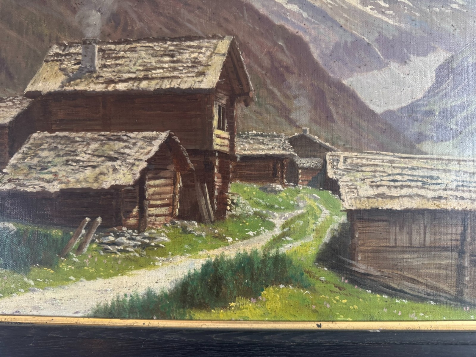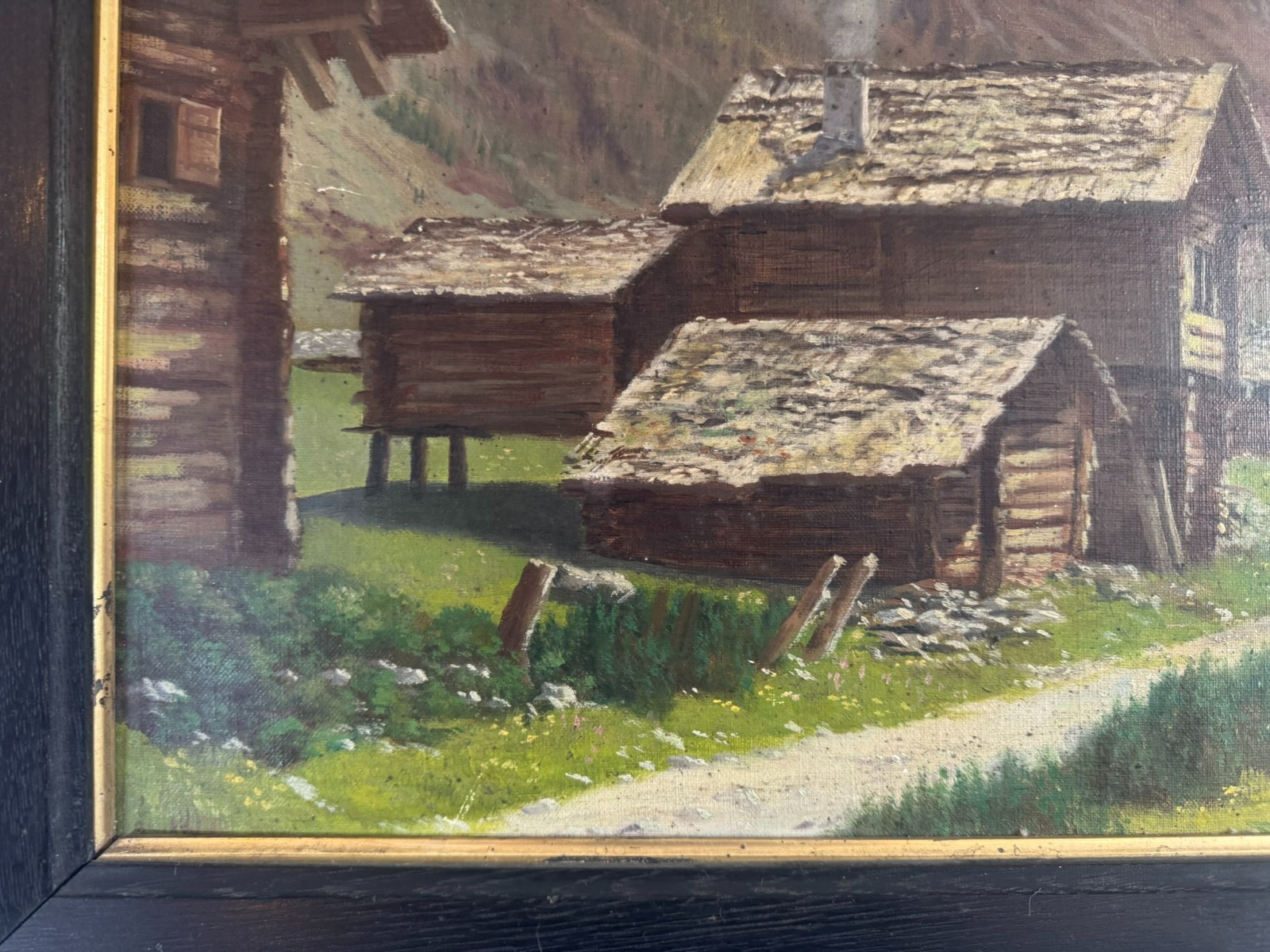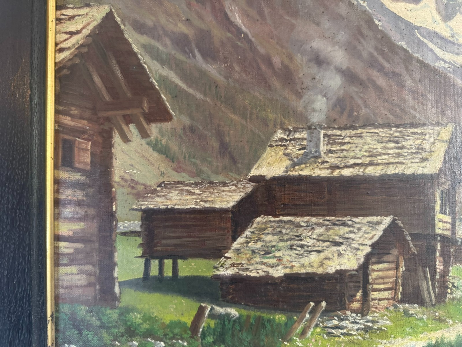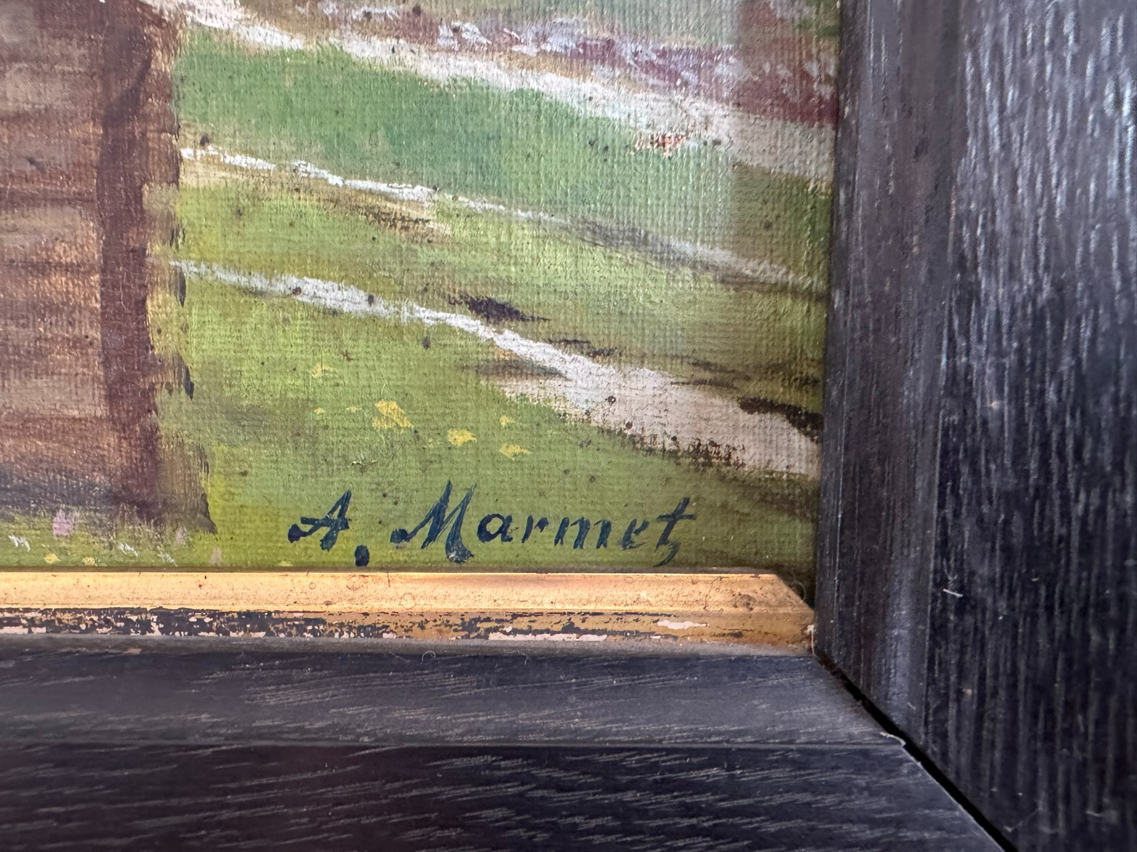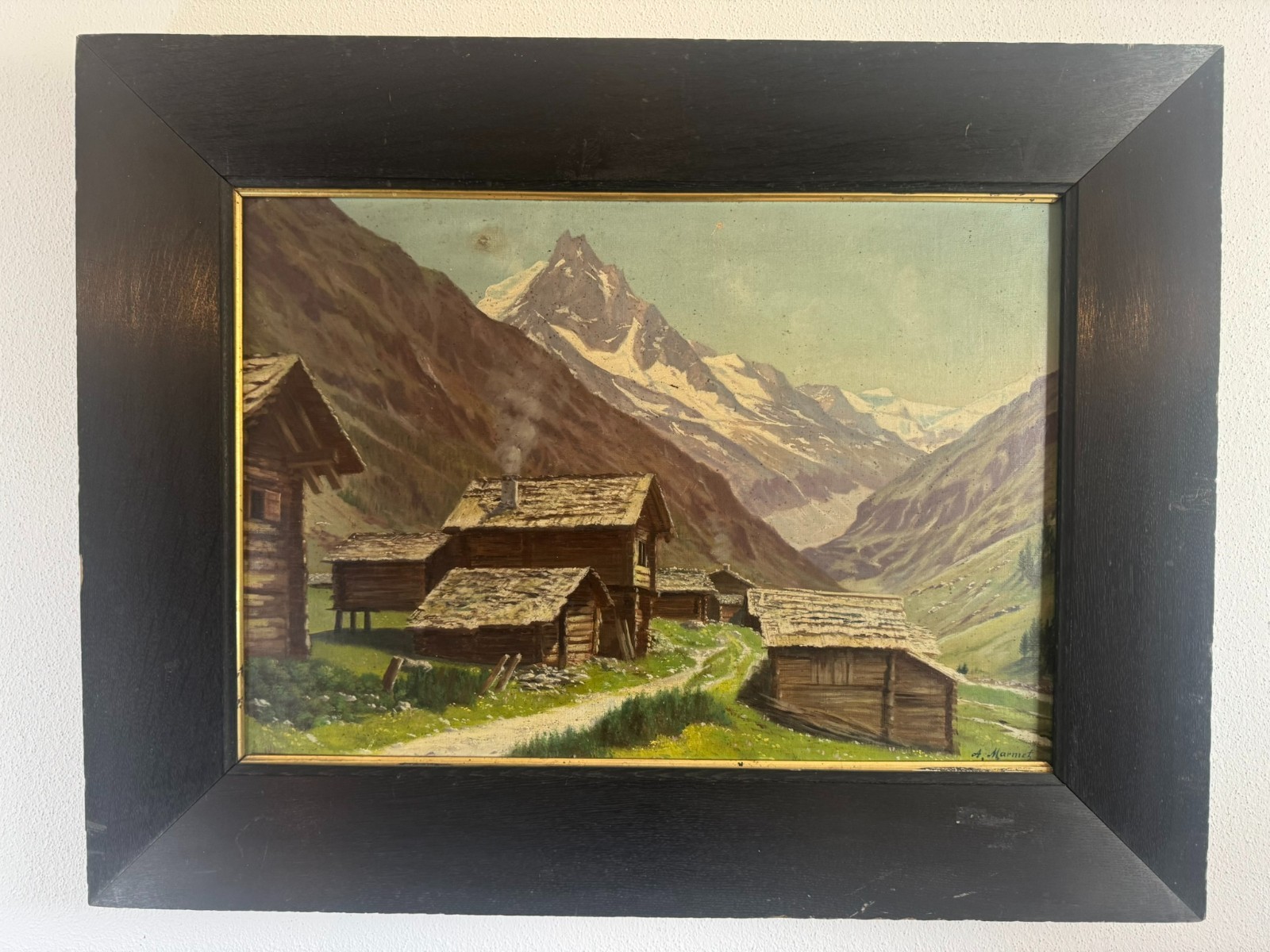 Sehr schönes Ölgemälde auf Leinwand, das Gemälde ist verschmutzt und muss gereinigt werden, zudem fehlt die innere rechte Passepartout-Zierleiste. Oben mittig eine leichte Druckstelle und ein leichter Abplatzer, das Gemälde ist signiert „A.Marmet“. Abmessungen gesamt: 84x65cm, ohne Rahmen: 65x47cm.