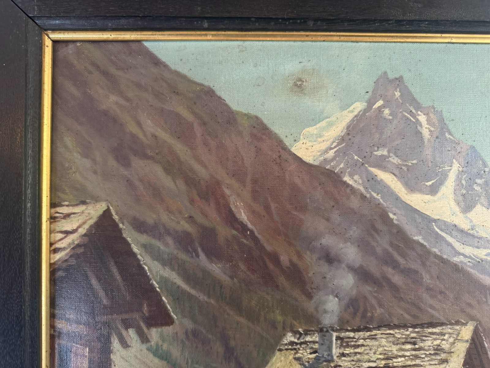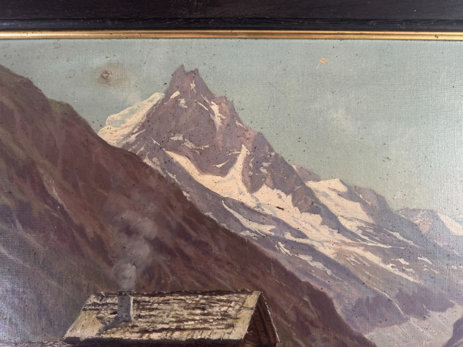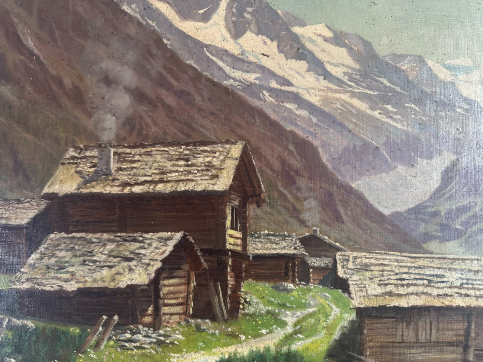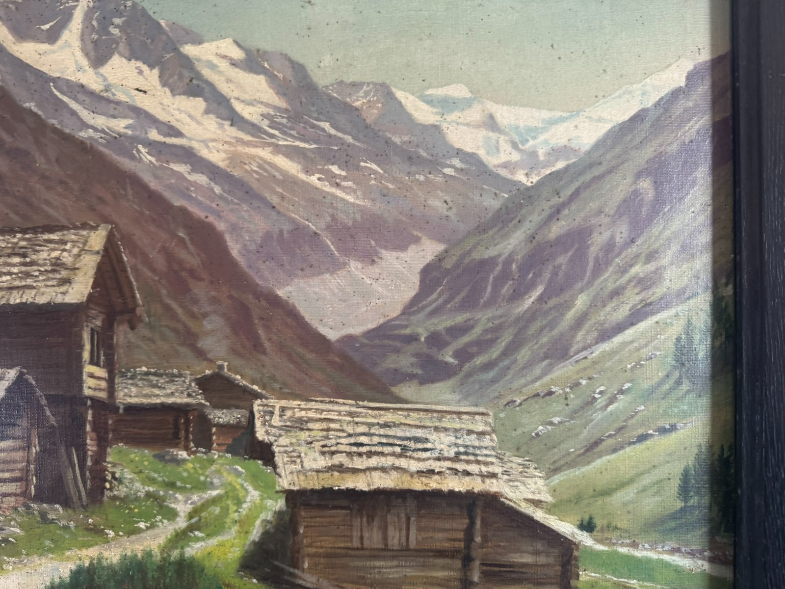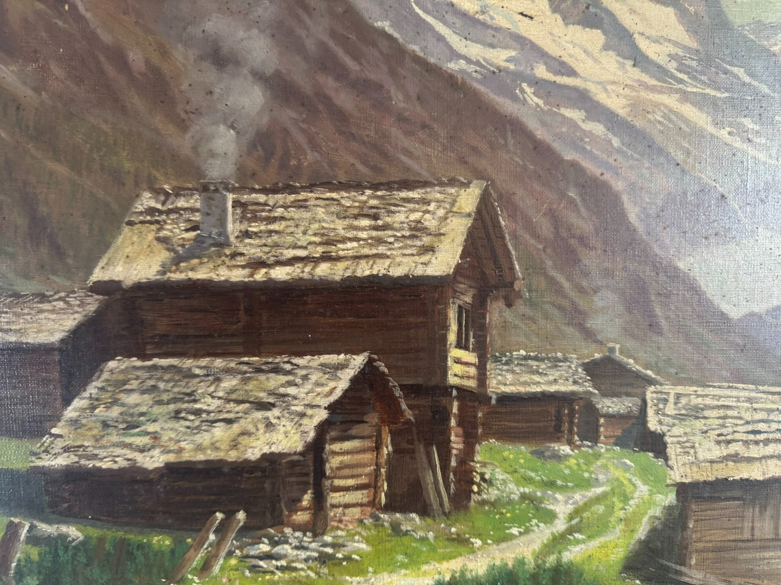 Sehr schönes Ölgemälde auf Leinwand, das Gemälde ist verschmutzt und muss gereinigt werden, zudem fehlt die innere rechte Passepartout-Zierleiste. Oben mittig eine leichte Druckstelle und ein leichter Abplatzer, das Gemälde ist signiert „A.Marmet“. Abmessungen gesamt: 84x65cm, ohne Rahmen: 65x47cm.