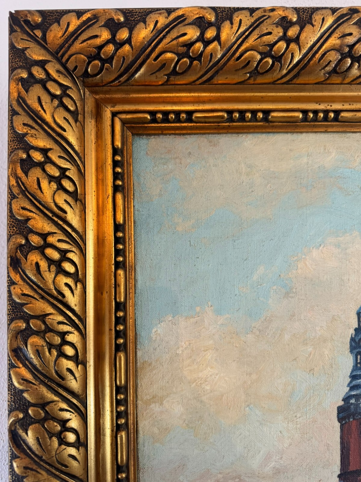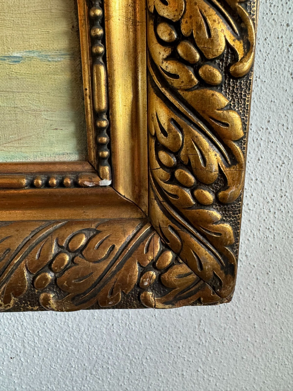 Schönes Gemälde, Öl auf Leinwand. Mittig leichter Abrieb, am Rand ist die Farbe leicht abgeplatzt. Der Rahmen ist rundum berieben und weist leichte Risse in der Fassung auf. Abmessungen gesamt: 55x85cm, ohne Rahmen: 41x70cm.