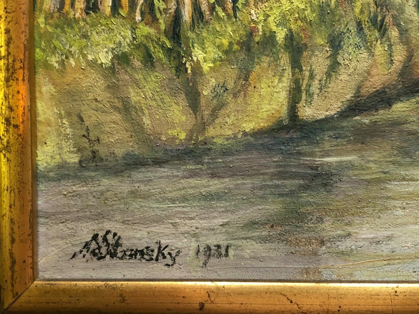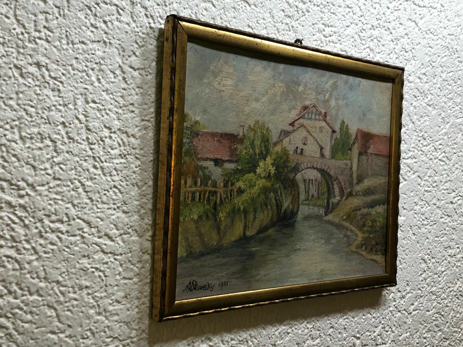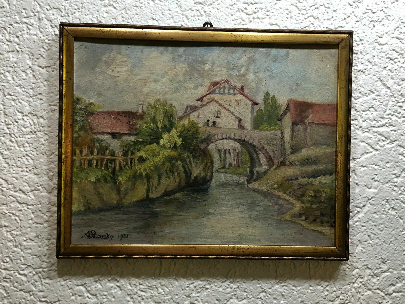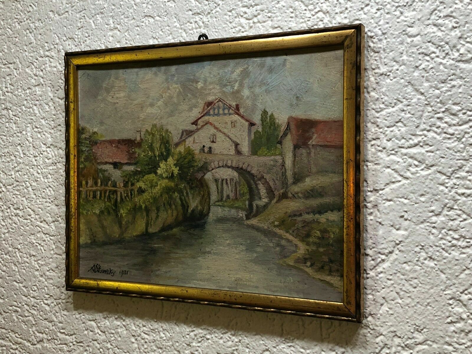 Artikelstandort: 83727 Schliersee – Ferdinand STRANSKY (1904-1981) Ölgemälde auf Holz, idyllische Dorfszenerie, links unten signiert und datiert. – Das Gemälde befindet sich insgesamt in einem guten Zustand, Platte leicht gewölbt, die Signatur scheint übergangen worden zu sein, es handelt sich jedoch 100% um ein Original weil es eins von zwei Gegenstücken ist, die sich beide in unserem Besitz befinden. Der Rahmen ist leicht wacklig, geht an den Ecken auseinander und wird kostenlos dazu gegeben. – Das Gemälde mißt 27,5×21,5cm, mit Rahmen 30x24cm.