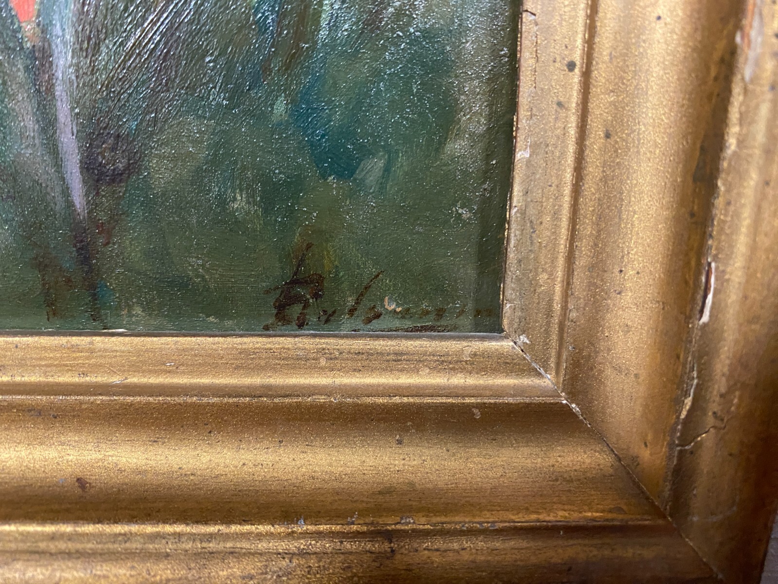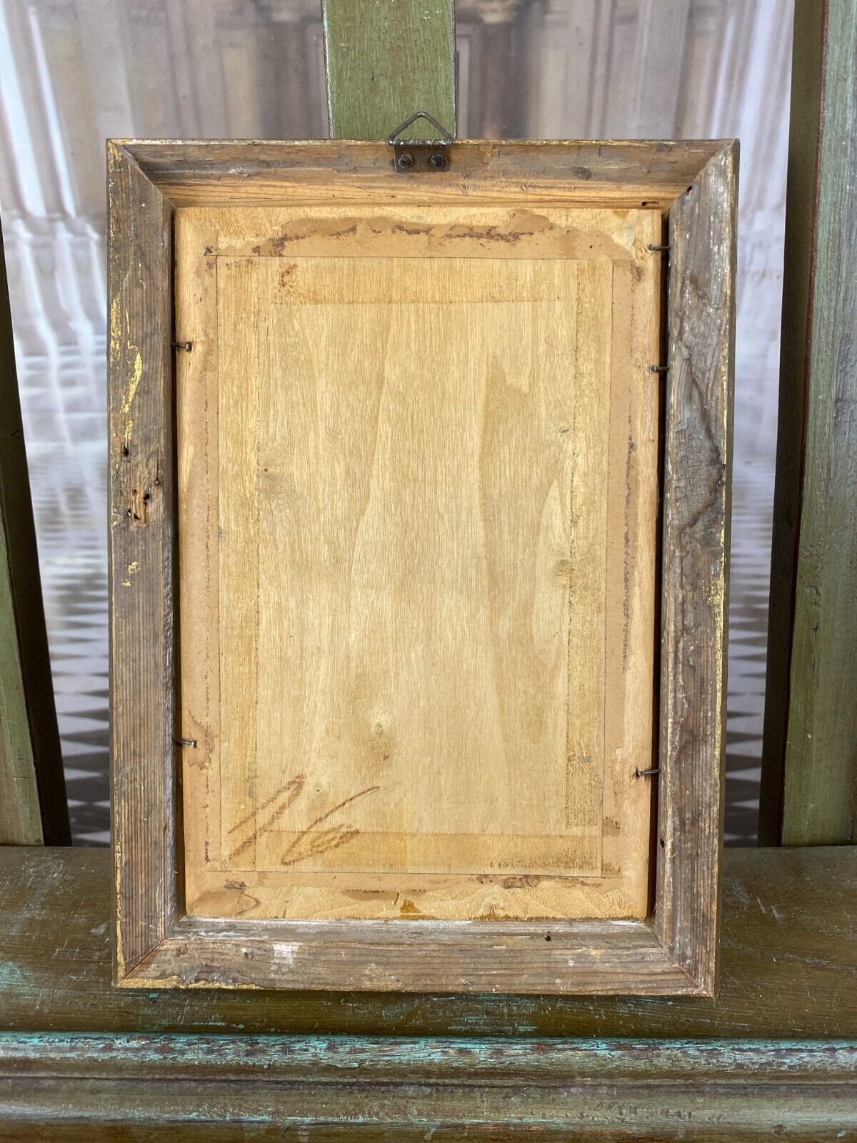 Ölgemälde auf Holz, unten rechts signiert „Rulsmann ?“. Der antike Rahmen ist berieben, zum Teil bestoßen und übermalt, das Gemälde befindet sich in schönem Zustand, Abmessungen: 15×22,5cm, mit Rahmen: 20x28cm.