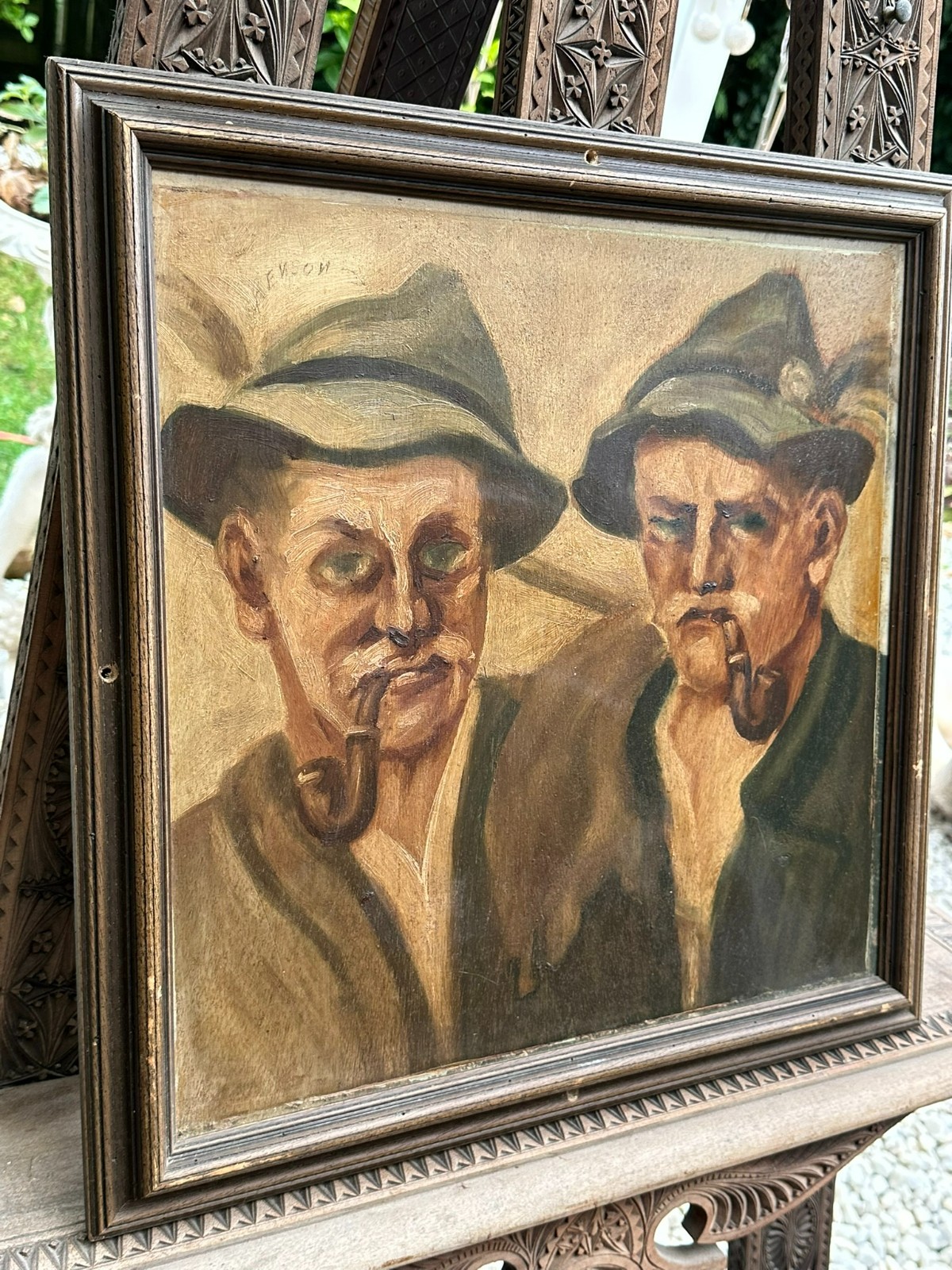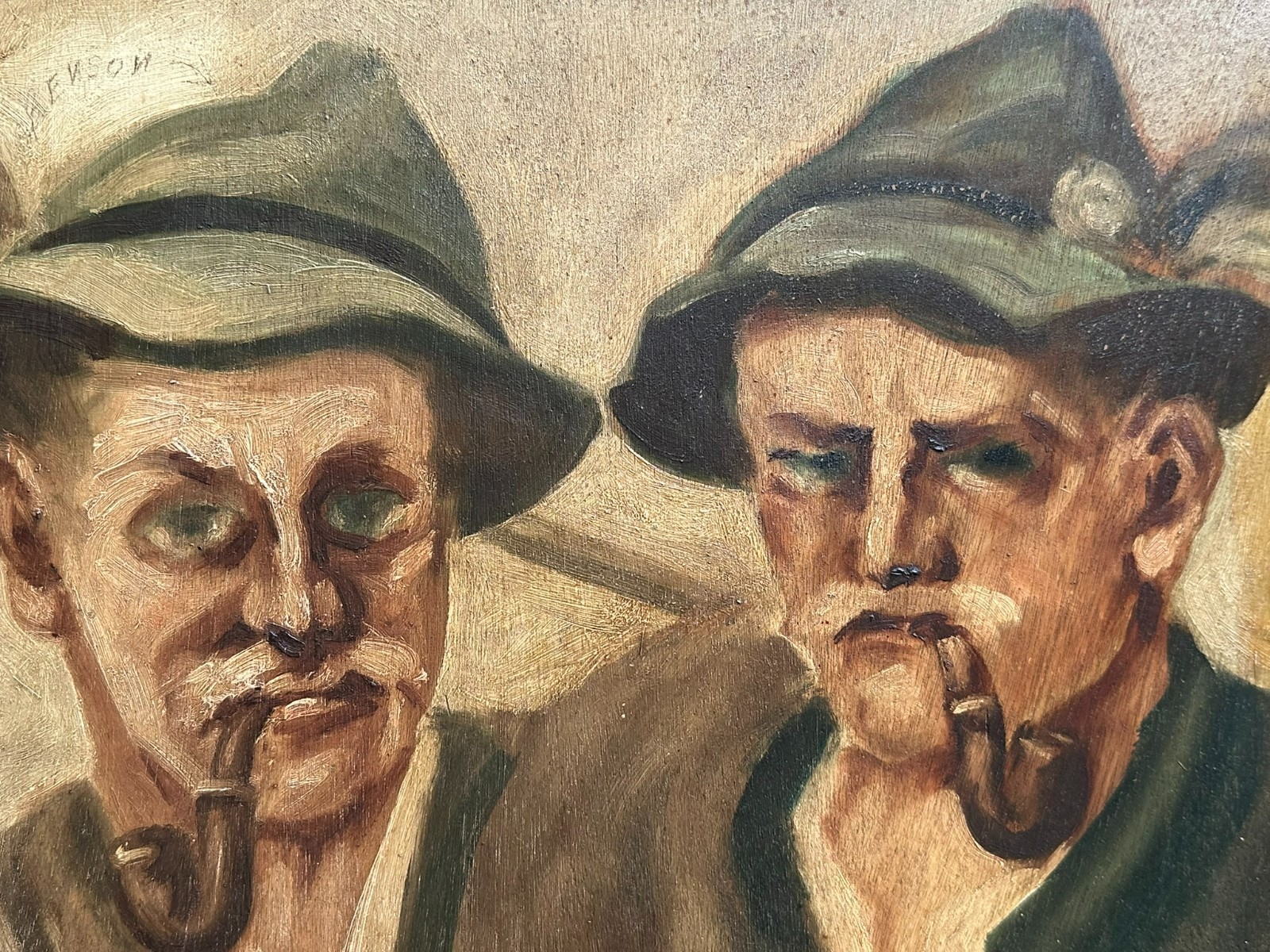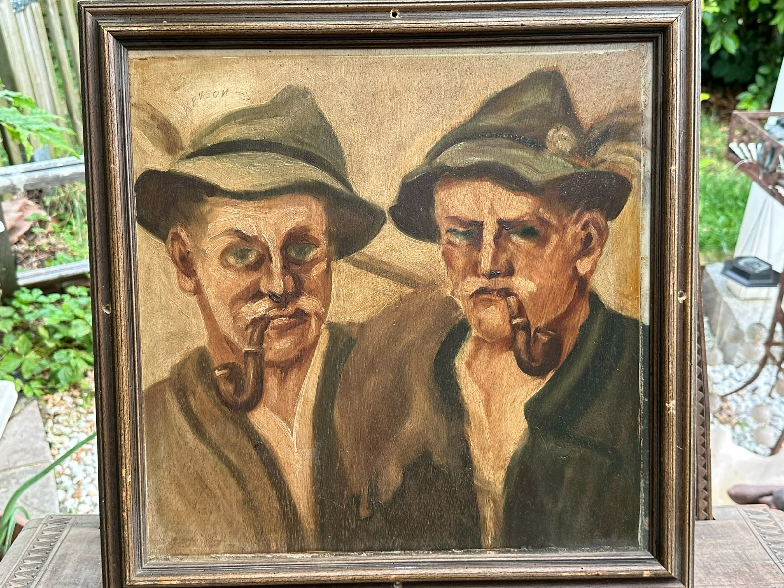 Ölgemälde auf Platte, Portrait zweier Bauern mit Pfeife, über dem Linken steht geschrieben Renson. Der Firnis ist stark vergilbt, der Rahmen hat an den Seiten vier Löcher und ist total berieben. Das Gemälde hat einen alten Falzrand von einem alten Rahmen. Abmessungen 42x42cm, mit Rahmen 48,5×48,5cm.