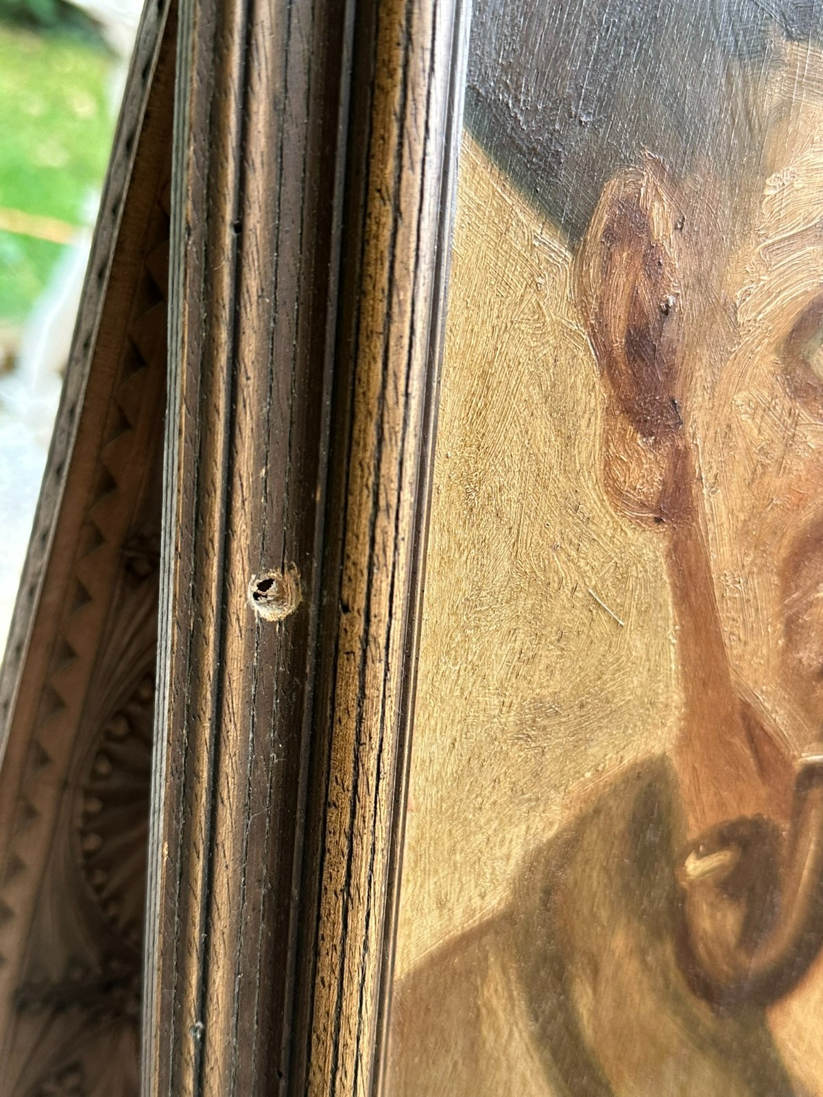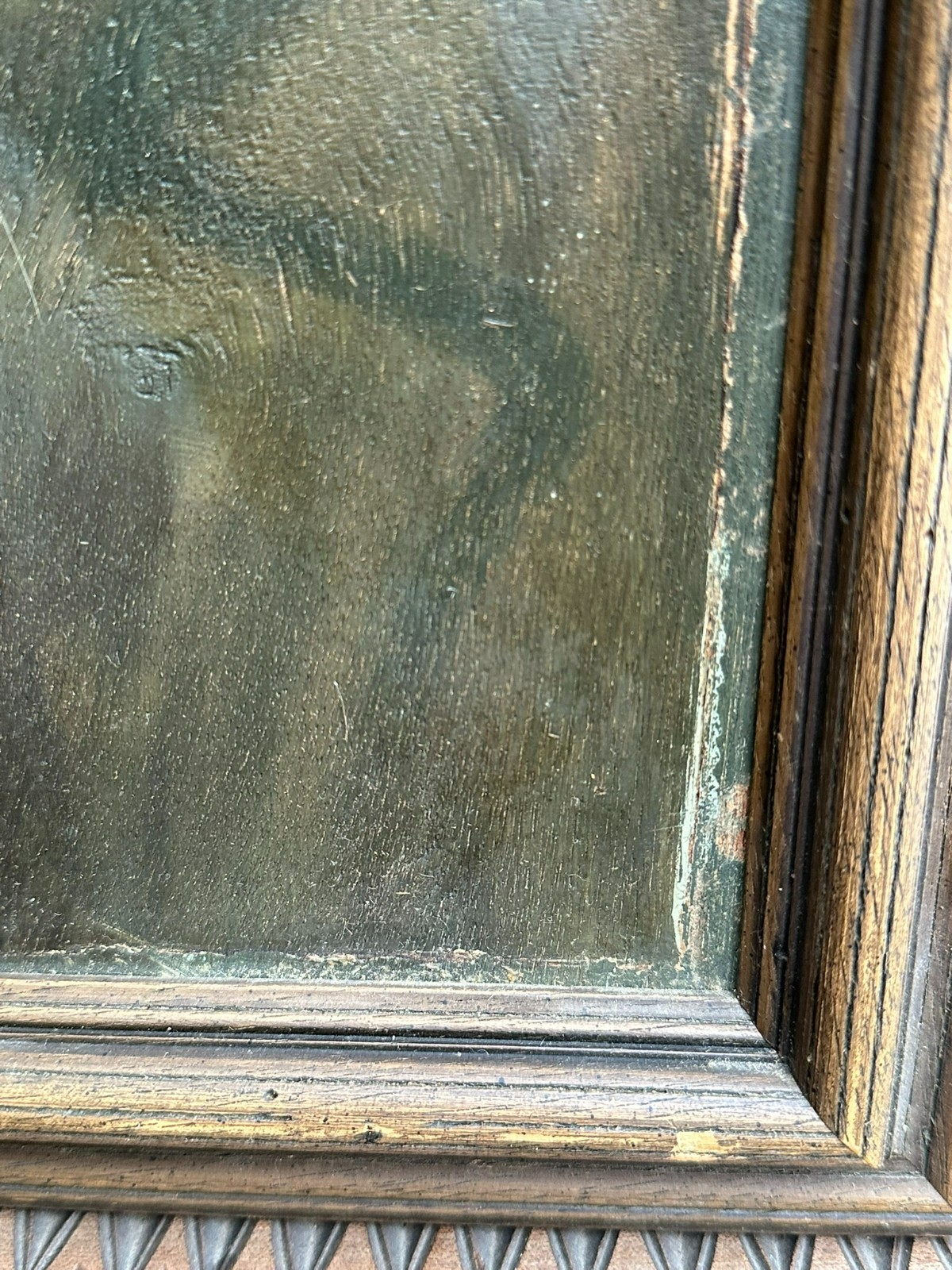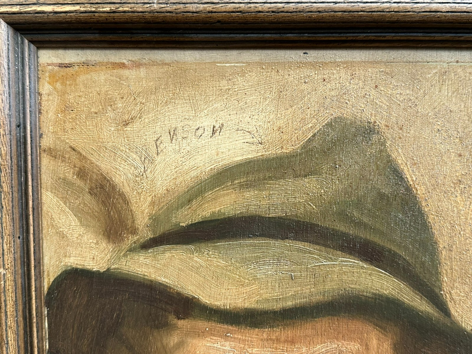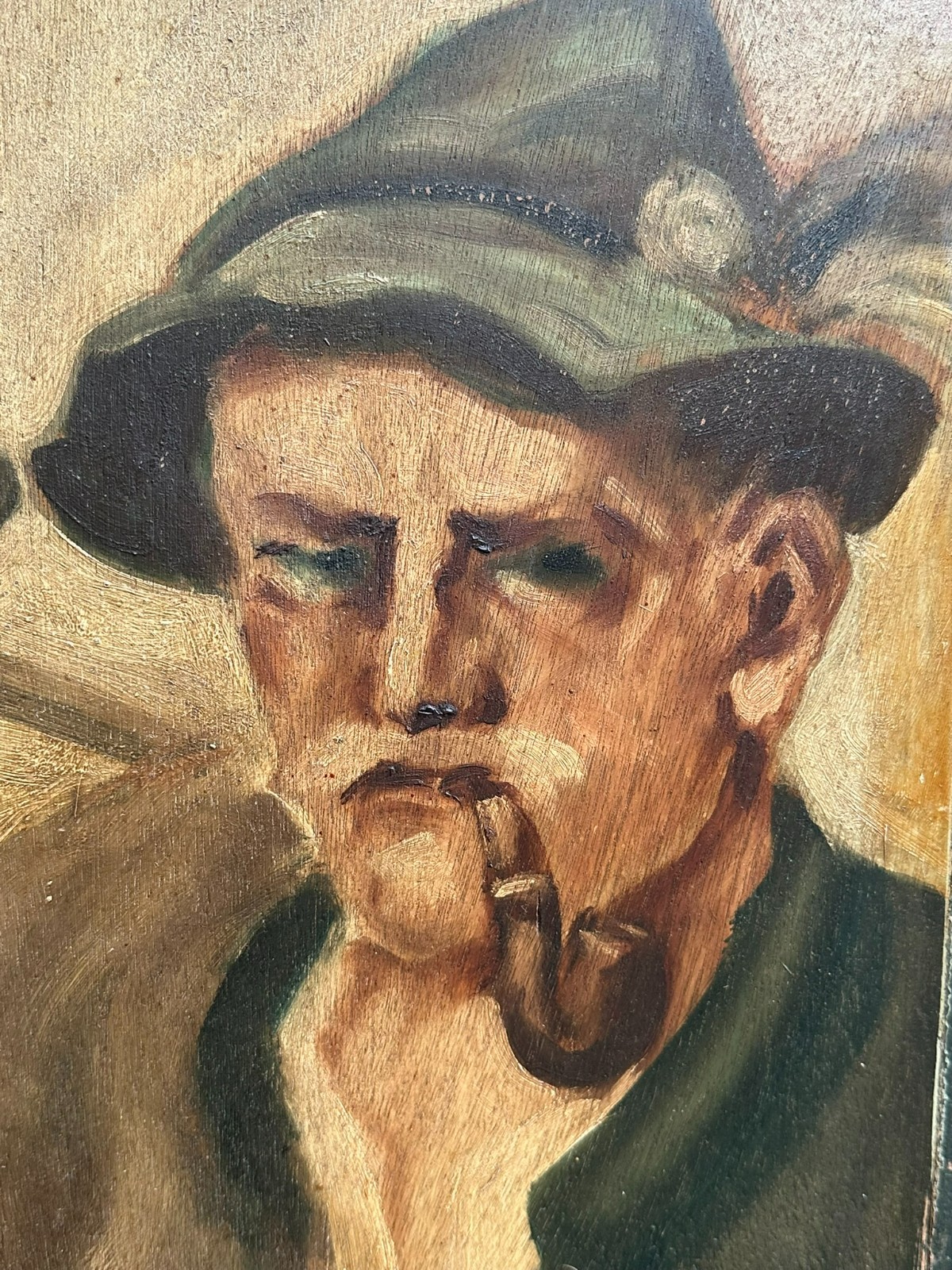 Ölgemälde auf Platte, Portrait zweier Bauern mit Pfeife, über dem Linken steht geschrieben Renson. Der Firnis ist stark vergilbt, der Rahmen hat an den Seiten vier Löcher und ist total berieben. Das Gemälde hat einen alten Falzrand von einem alten Rahmen. Abmessungen 42x42cm, mit Rahmen 48,5×48,5cm.