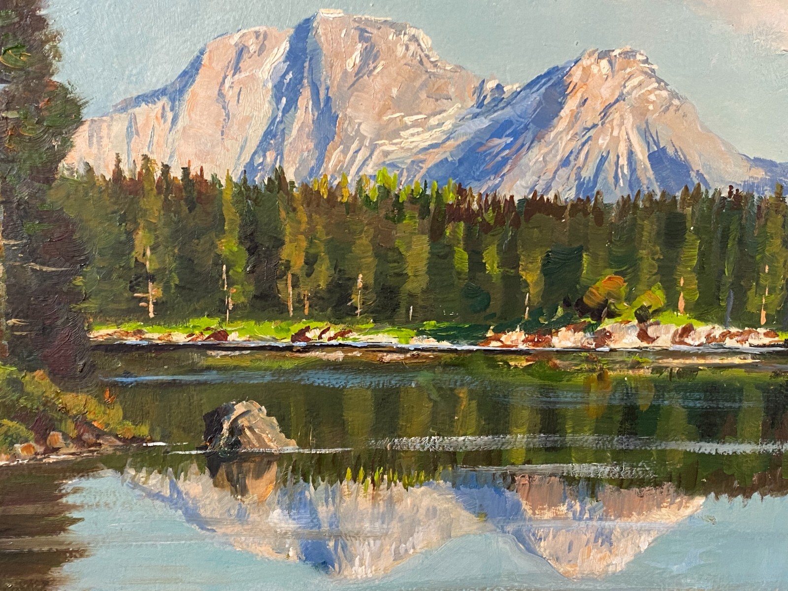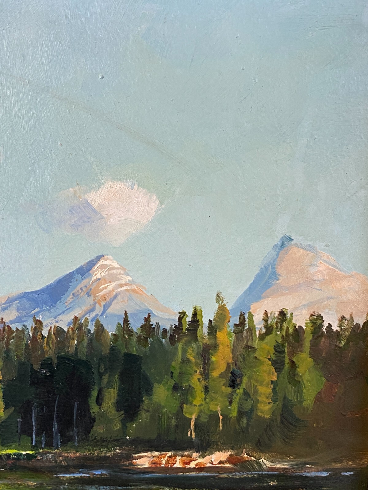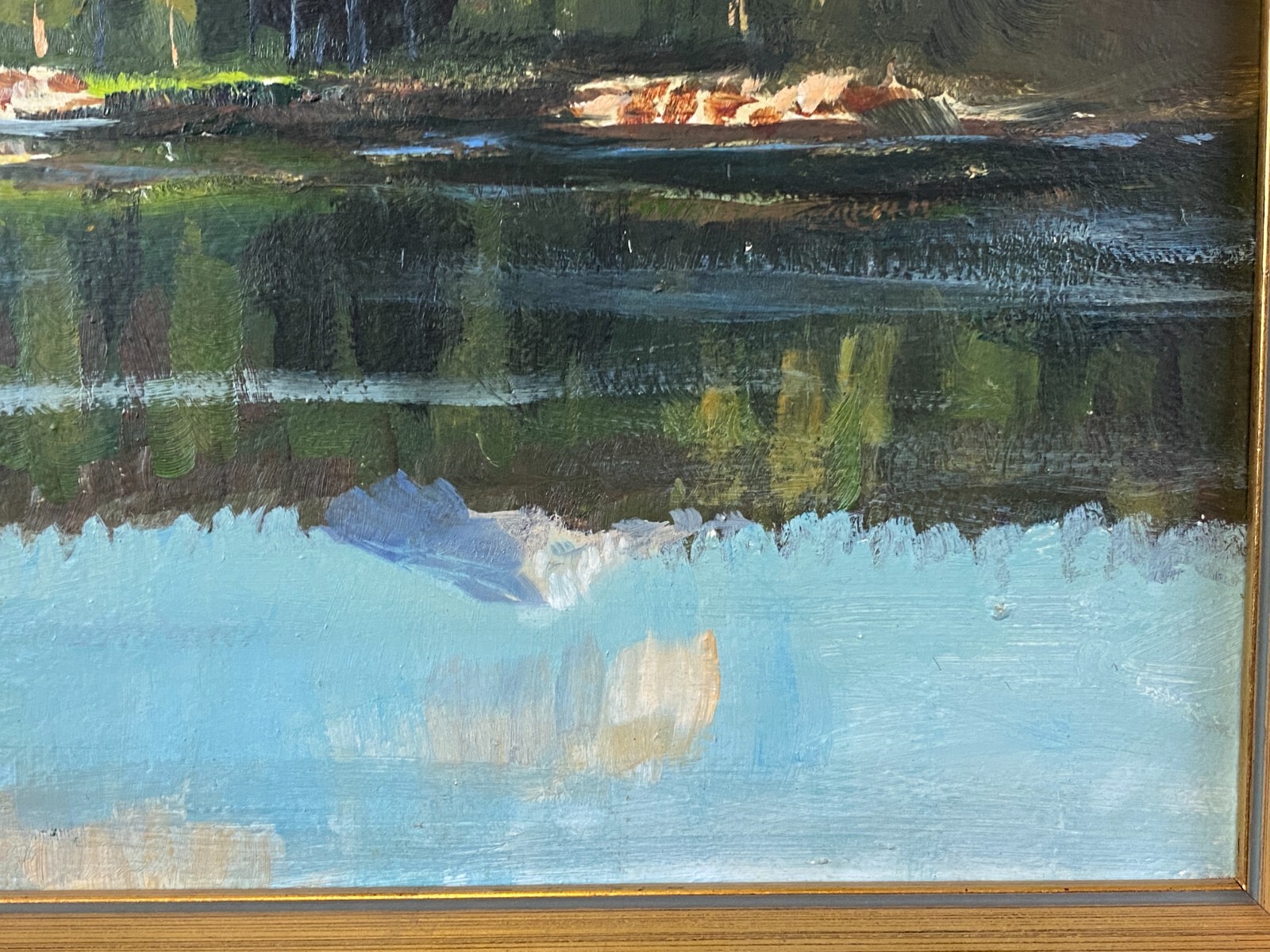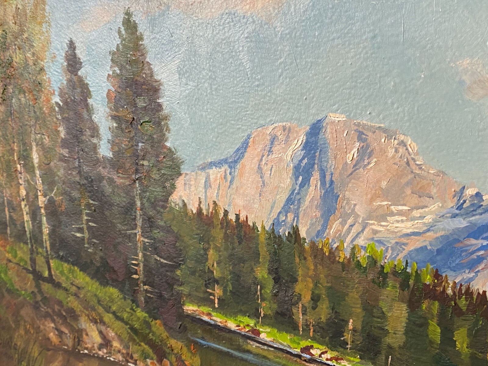 Ölgemälde auf Platte, signiert Höhne. Im Himmeslbereich leicht berieben, Rahmen minimal bestossen. Abmessungen 72x35cm, mit Rahmen 81x44cm.