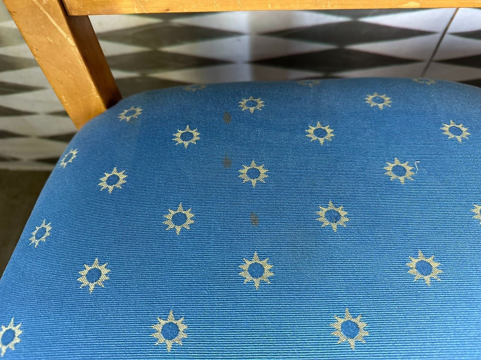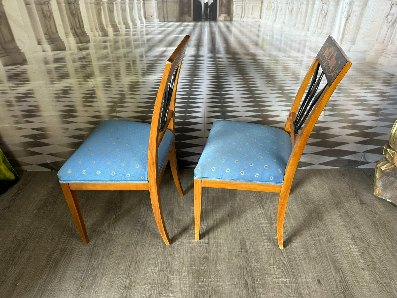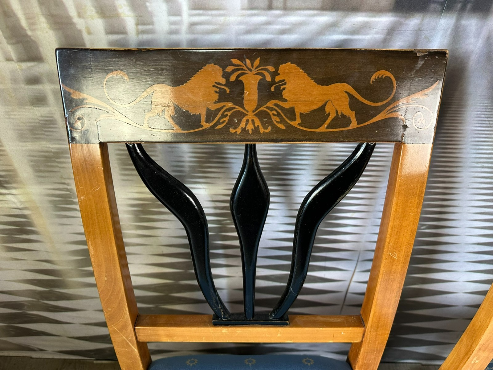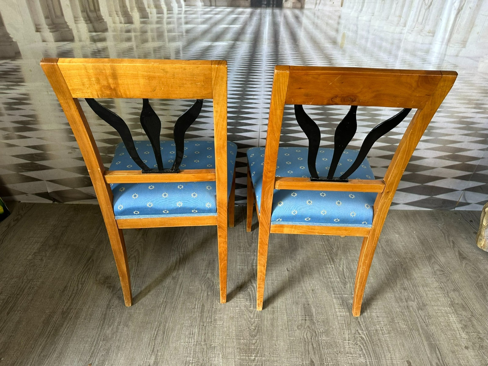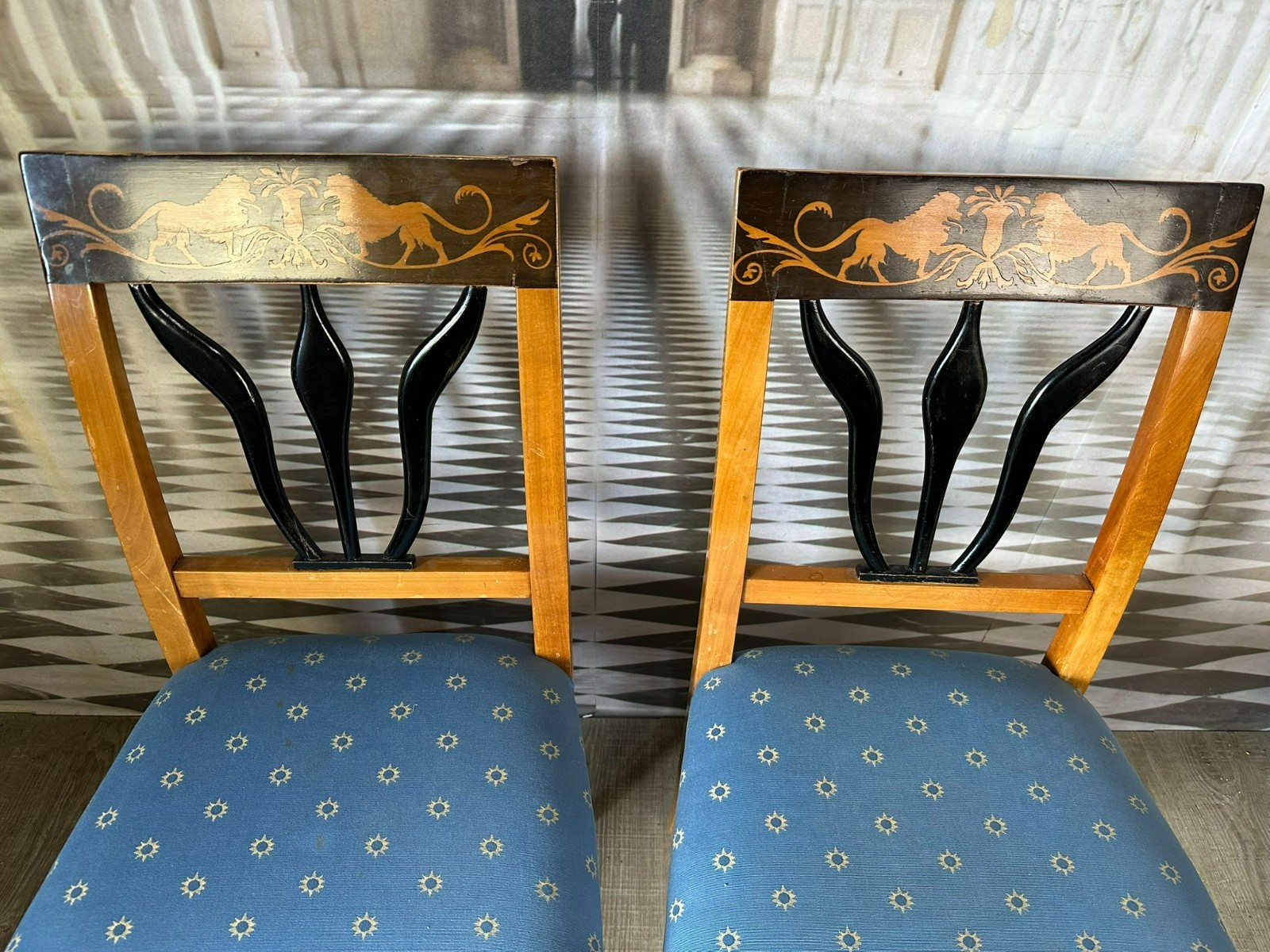 Paar antike Biedermeier Stühle, Kirschholzgestell, obere Rückenlehne mit Intarsienbild, weiterhin ebonisierte Appliken. Die Bezüge wurden mal ersetzt, einer der beiden Stühle leicht fleckig, guter Sitzkomfort. An den Zusammenfügungsstellen der oberen Rückenlehne, leichte Dehnungsrisse mit dementsprechenden Rissen im Furnier. Abmessungen BTH 44/49/88cm, Sitzhöhe 46cm.
