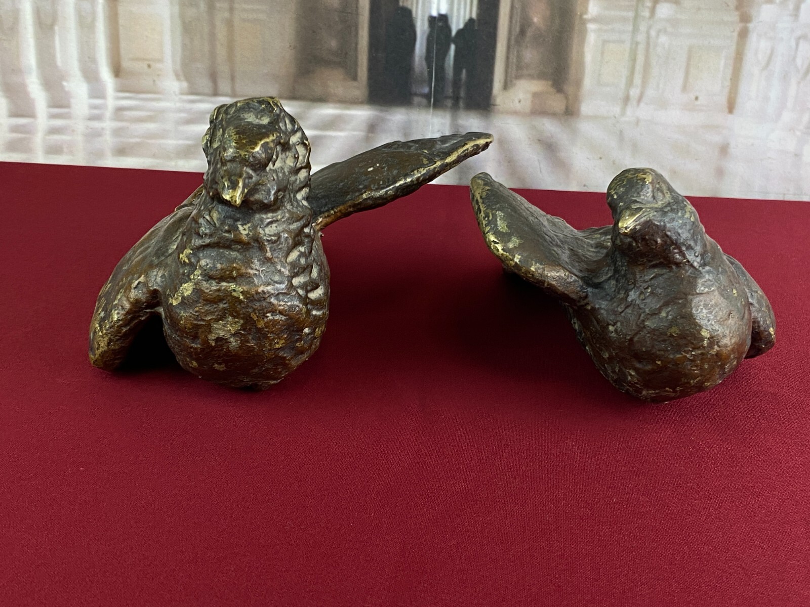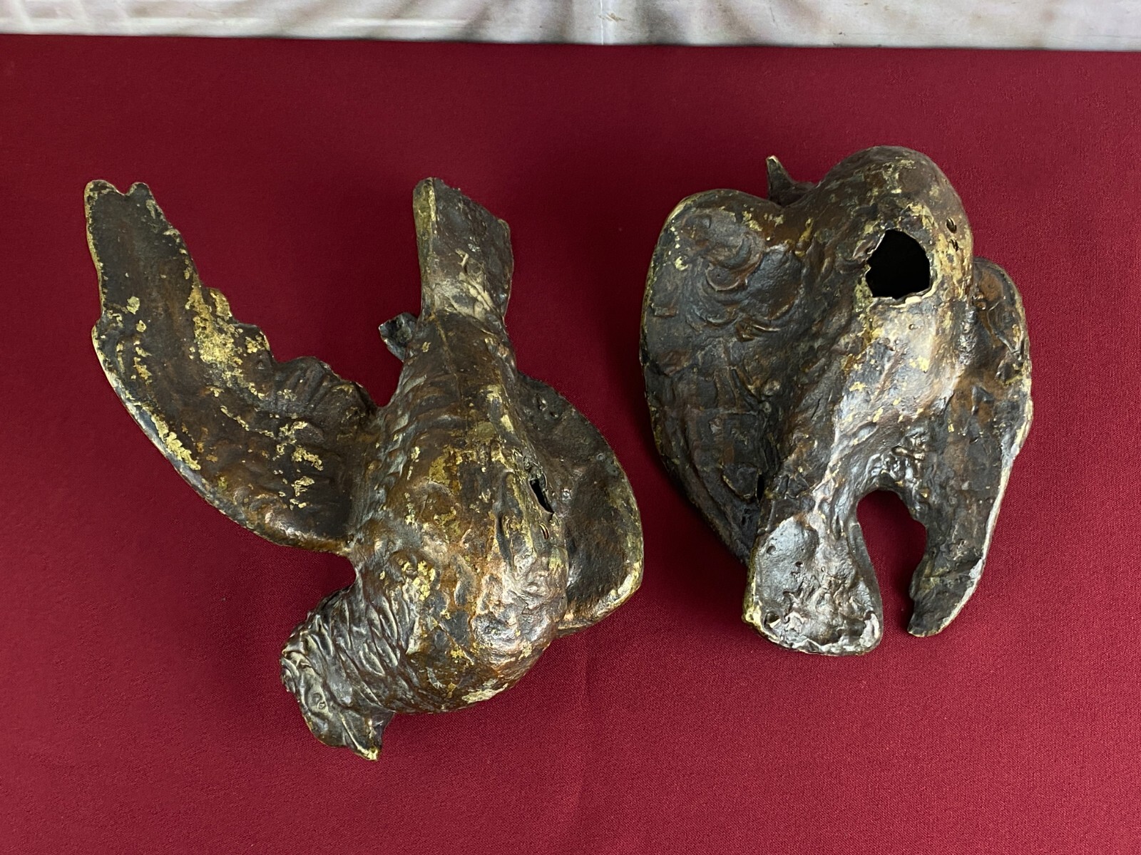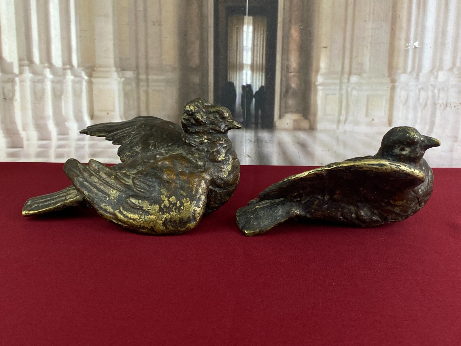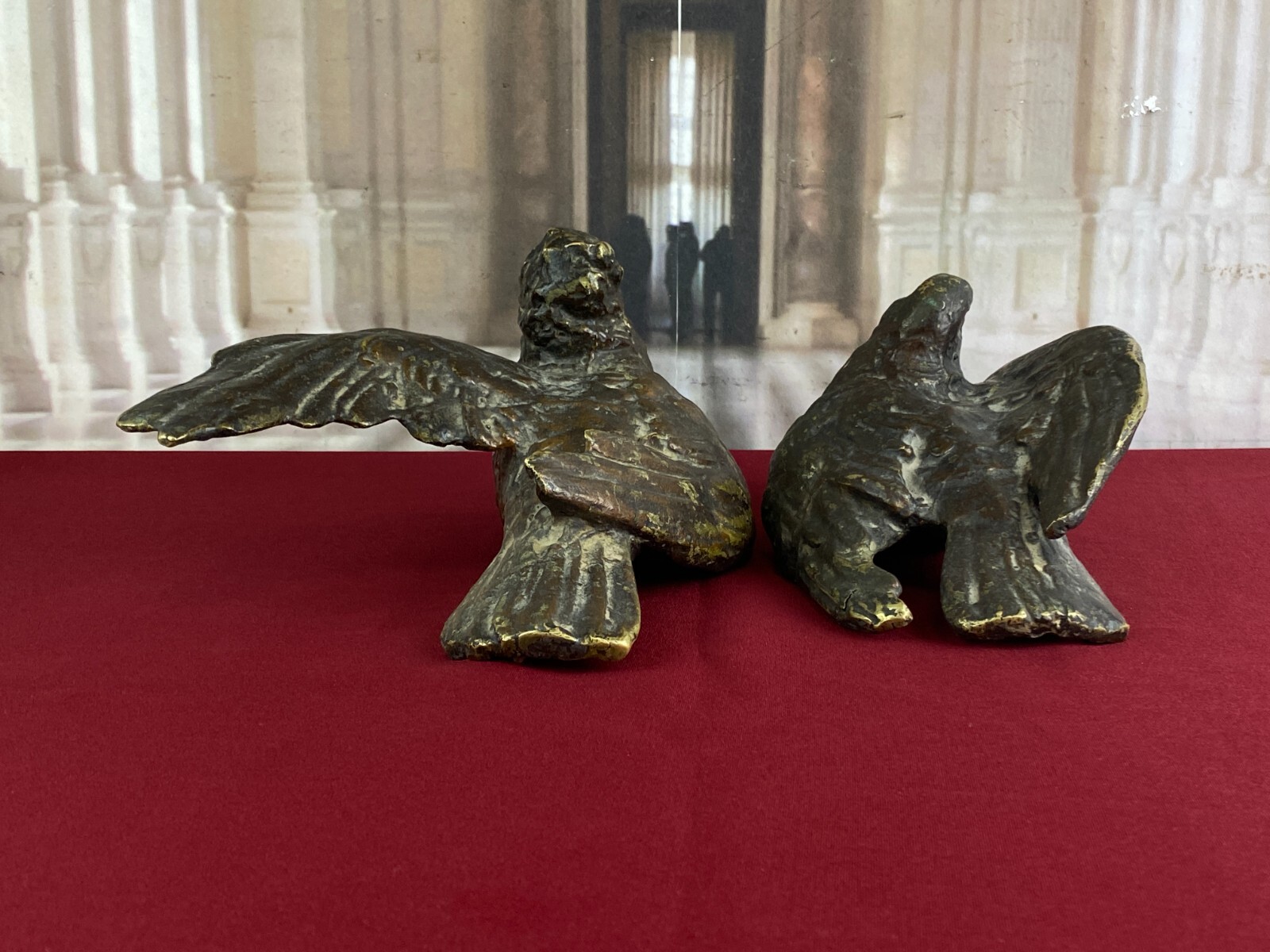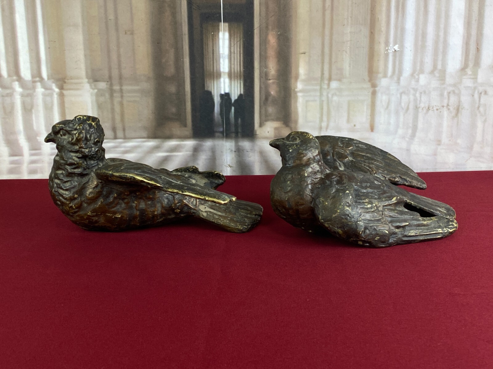 Zwei sehr seltene antiken Figuren aus Bronze, Neapel um 1890. Massiv gearbeitet und braun gefärbt, Oberfläche zum Teil berieben. Die Figuren wurden am Kopfteil eines Ehebettes als friedenbringende Symbole angebracht, die großen Löcher am Boden sind original, die Figuren wurden auf die Holzbeine des Bettes aufgesetzt. An der Unterseite ebenfalls kleine Bohrung/Aufnahme vorhanden, wohl ehemals auf kleine Podeste montiert. Minimal bestoßen, Abmessungen BTH: 14x20x10cm, 22x25x13cm.