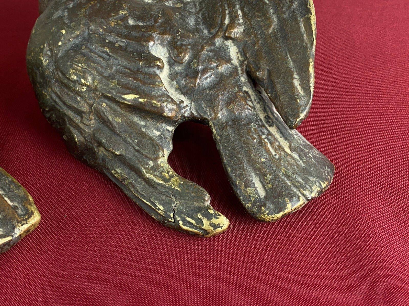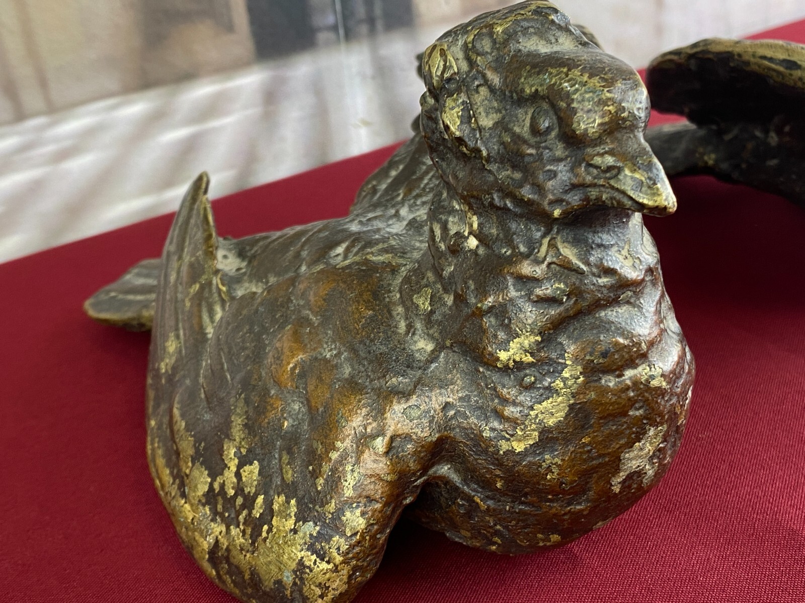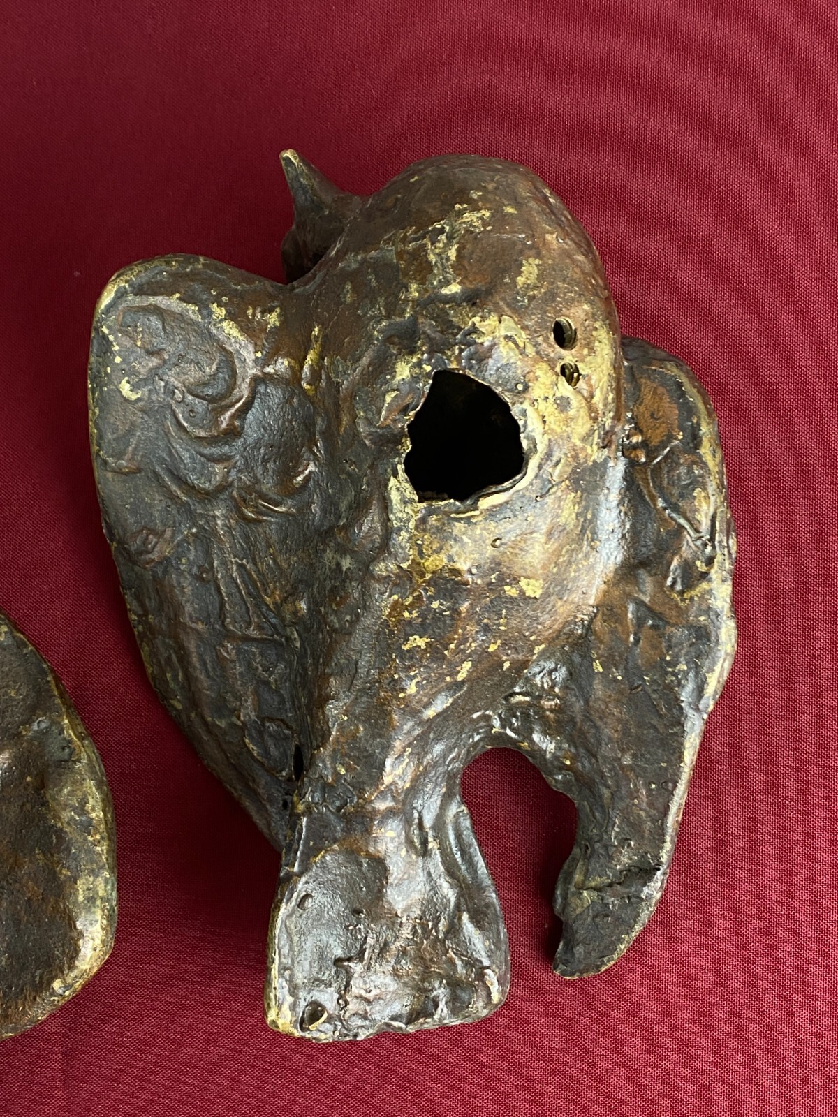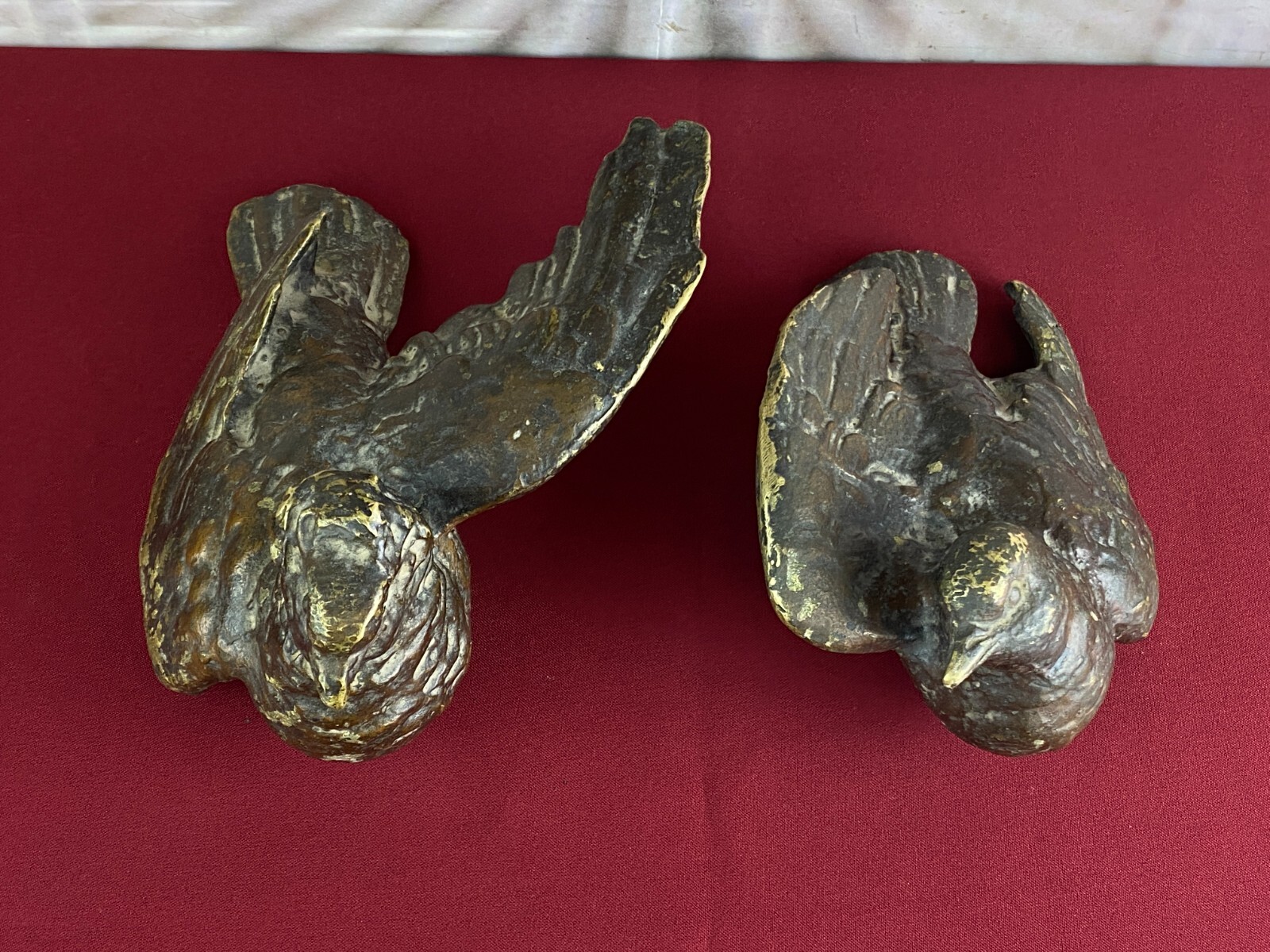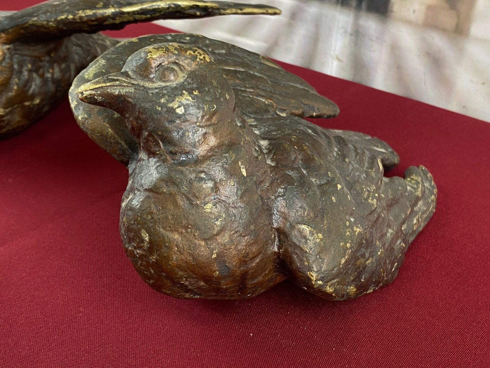 Zwei sehr seltene antiken Figuren aus Bronze, Neapel um 1890. Massiv gearbeitet und braun gefärbt, Oberfläche zum Teil berieben. Die Figuren wurden am Kopfteil eines Ehebettes als friedenbringende Symbole angebracht, die großen Löcher am Boden sind original, die Figuren wurden auf die Holzbeine des Bettes aufgesetzt. An der Unterseite ebenfalls kleine Bohrung/Aufnahme vorhanden, wohl ehemals auf kleine Podeste montiert. Minimal bestoßen, Abmessungen BTH: 14x20x10cm, 22x25x13cm.