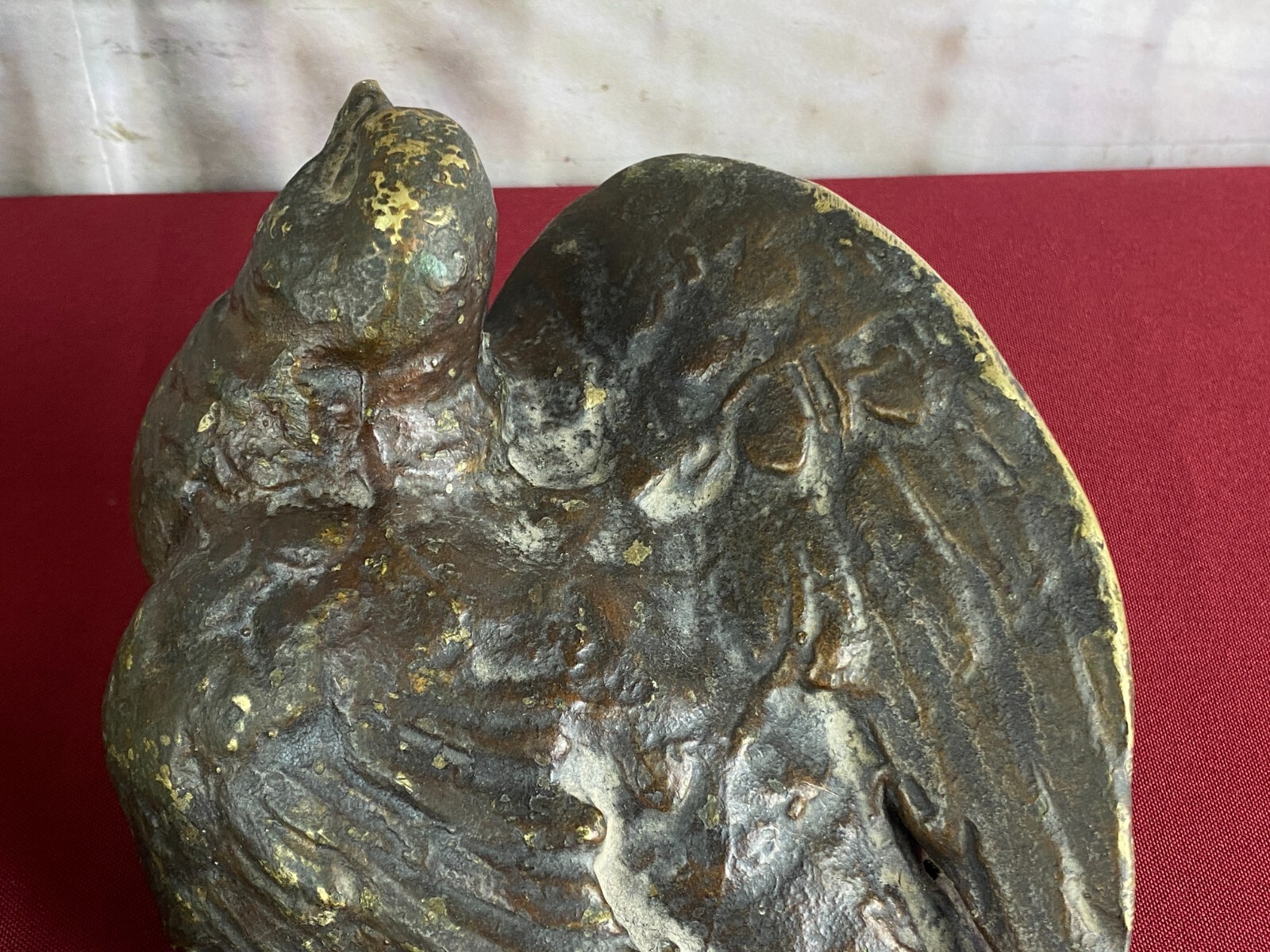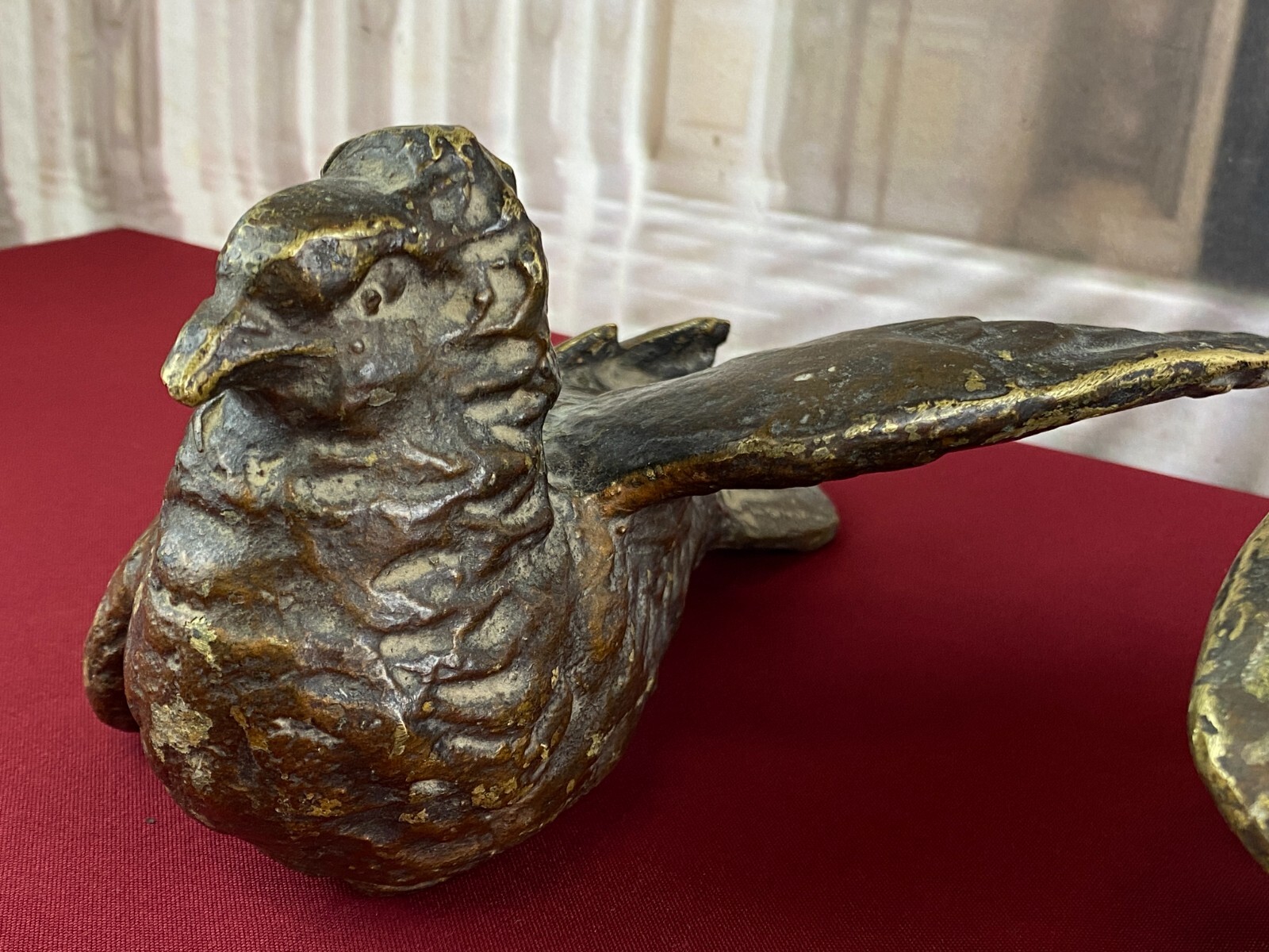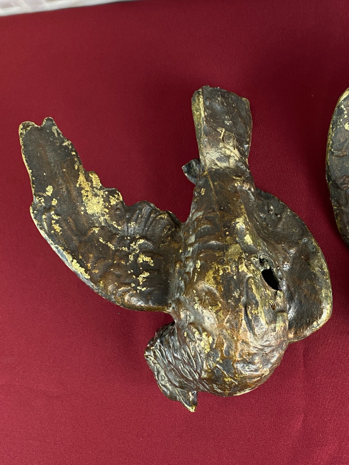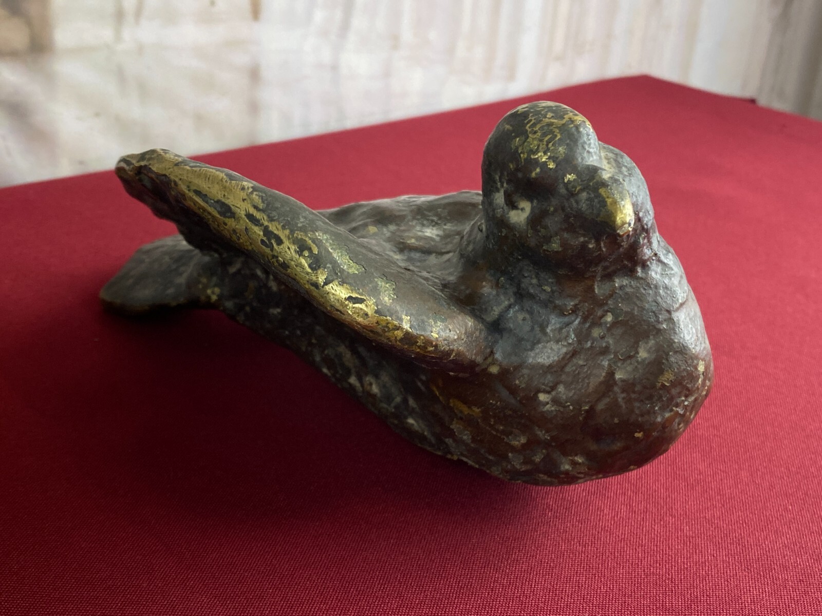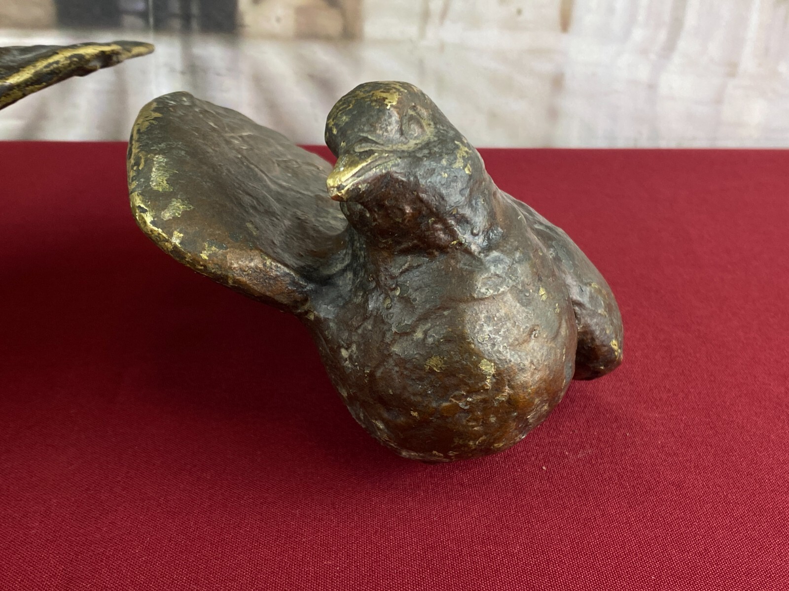 Zwei sehr seltene antiken Figuren aus Bronze, Neapel um 1890. Massiv gearbeitet und braun gefärbt, Oberfläche zum Teil berieben. Die Figuren wurden am Kopfteil eines Ehebettes als friedenbringende Symbole angebracht, die großen Löcher am Boden sind original, die Figuren wurden auf die Holzbeine des Bettes aufgesetzt. An der Unterseite ebenfalls kleine Bohrung/Aufnahme vorhanden, wohl ehemals auf kleine Podeste montiert. Minimal bestoßen, Abmessungen BTH: 14x20x10cm, 22x25x13cm.