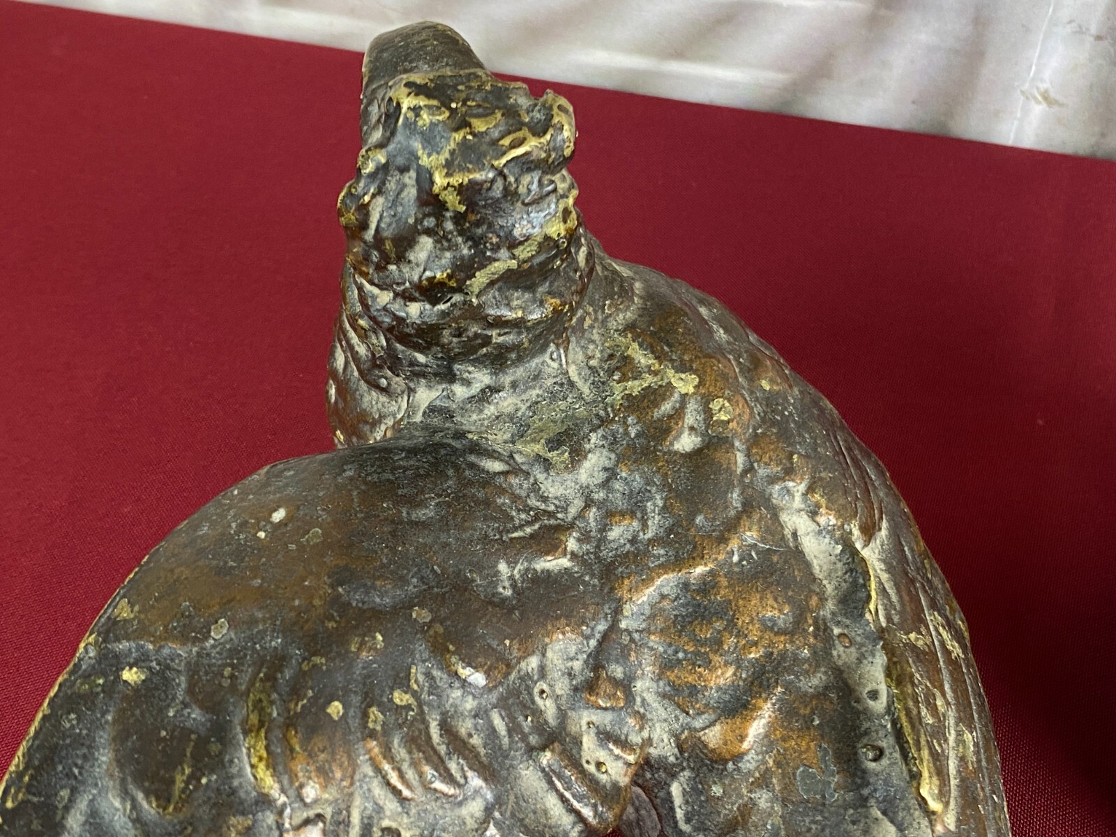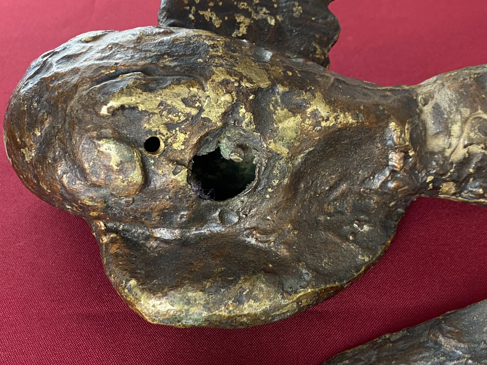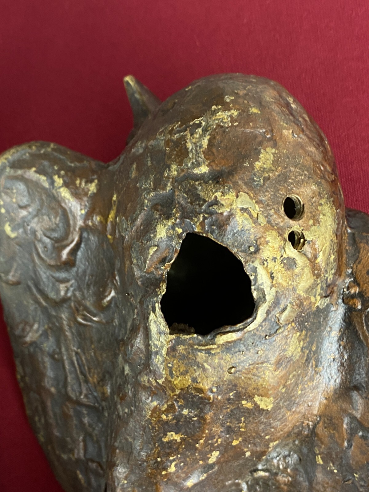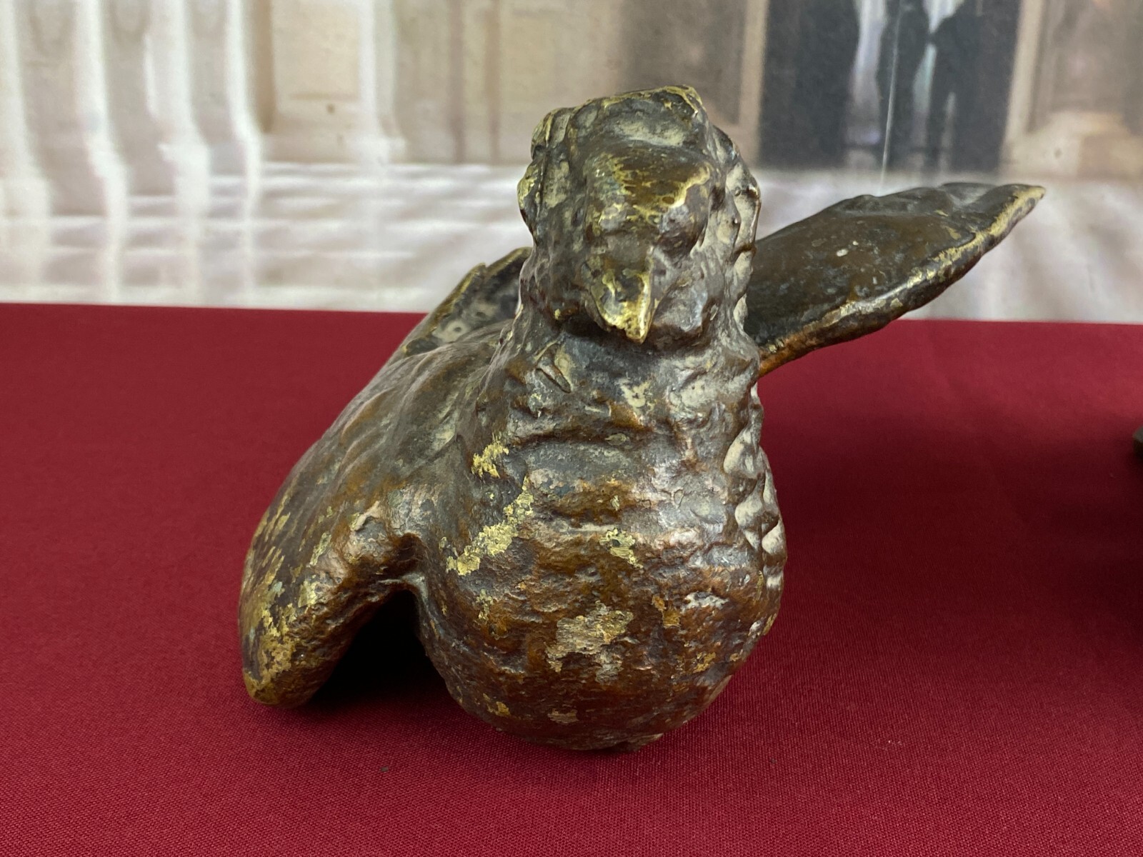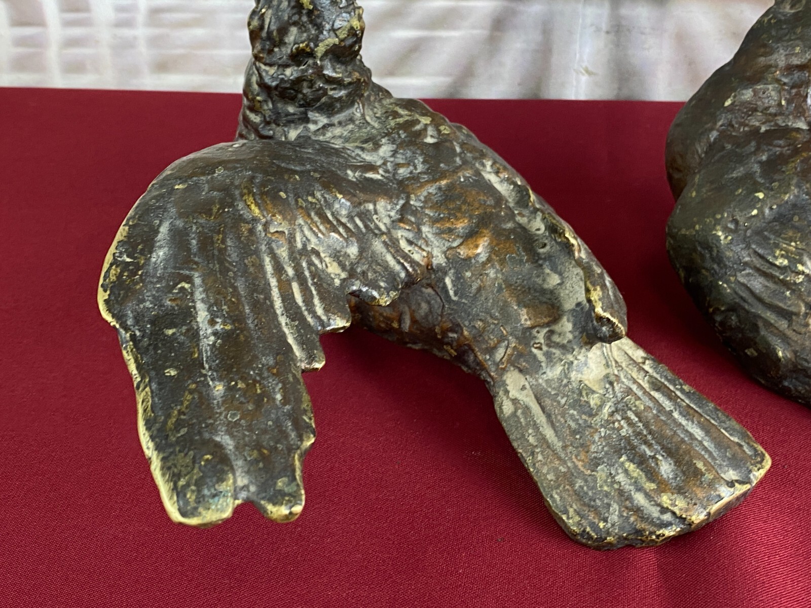 Zwei sehr seltene antiken Figuren aus Bronze, Neapel um 1890. Massiv gearbeitet und braun gefärbt, Oberfläche zum Teil berieben. Die Figuren wurden am Kopfteil eines Ehebettes als friedenbringende Symbole angebracht, die großen Löcher am Boden sind original, die Figuren wurden auf die Holzbeine des Bettes aufgesetzt. An der Unterseite ebenfalls kleine Bohrung/Aufnahme vorhanden, wohl ehemals auf kleine Podeste montiert. Minimal bestoßen, Abmessungen BTH: 14x20x10cm, 22x25x13cm.