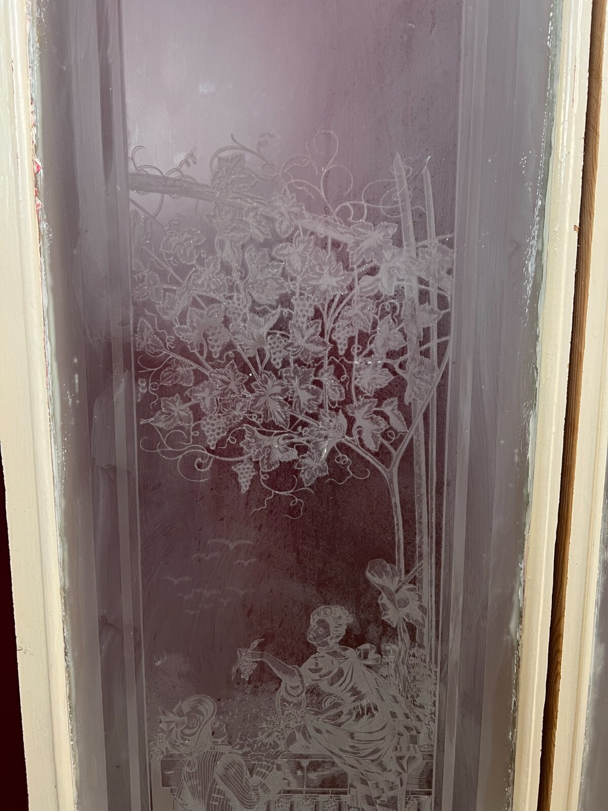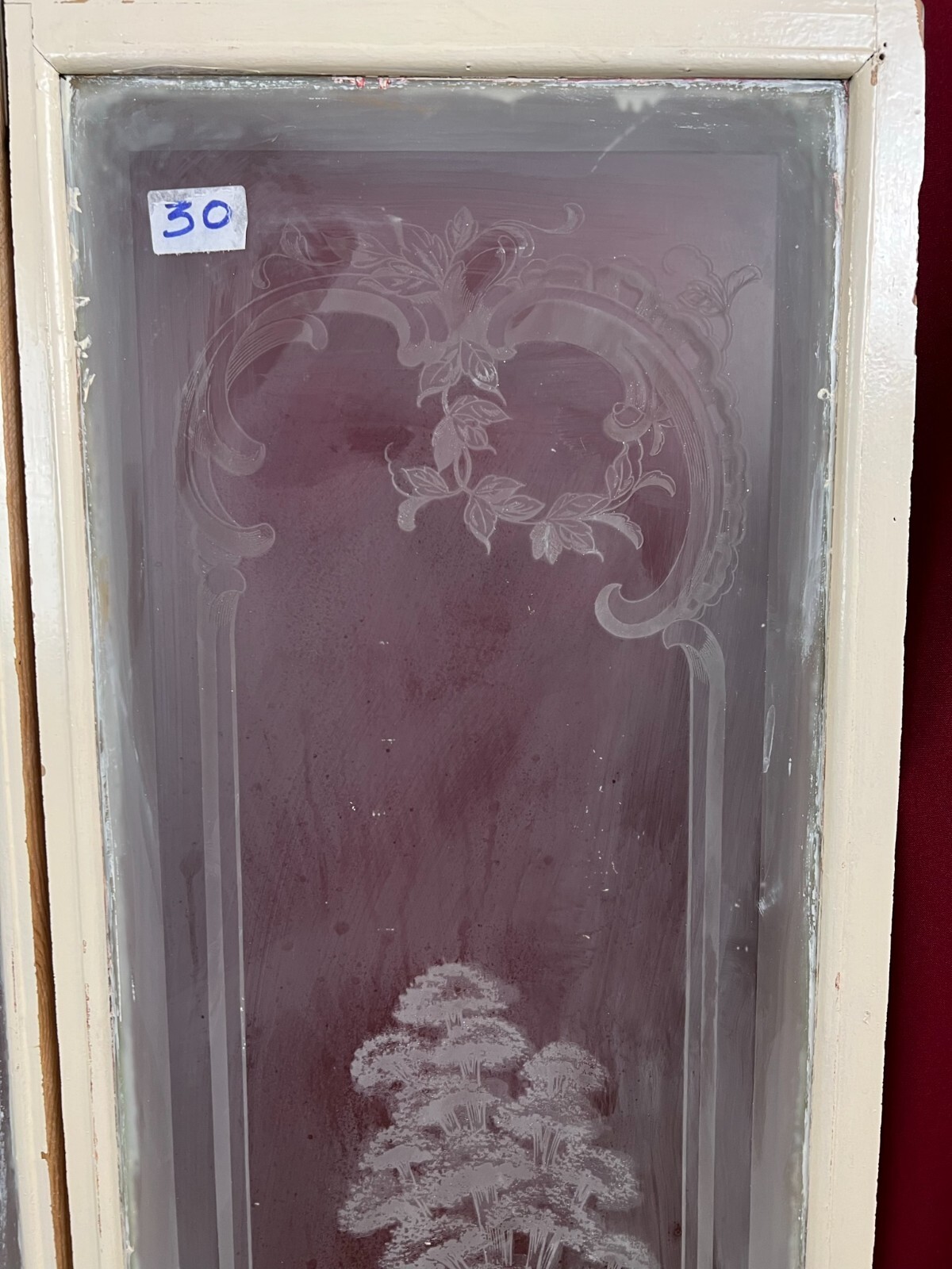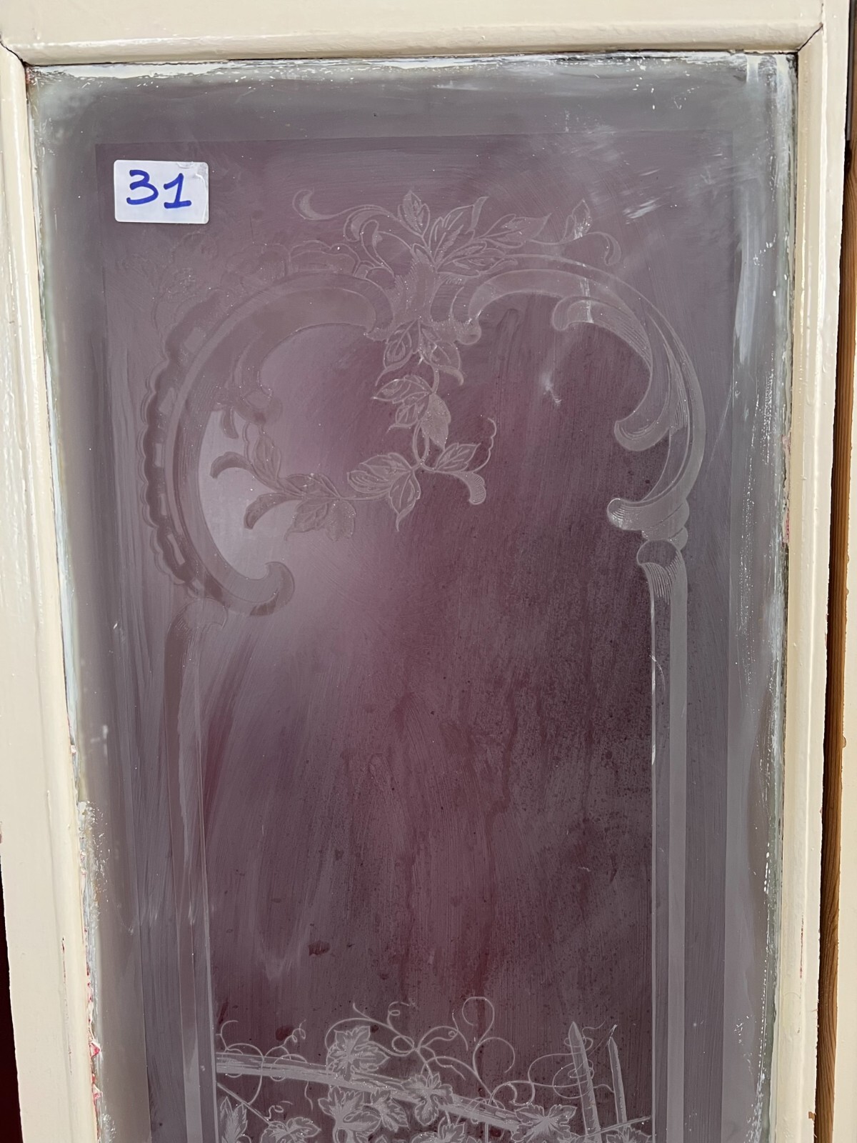 Antike Glasscheibe mit Holzrahmen. Es handelt sich um eine Scheibe aus einer Tür für den Innenbereich mit ausgeschnittenem Holzrahmen. Im Randbereich Farb- und Verkittungsreste, an der Oberfläche Farbspritzer und Flecken möglich. Die Scheibe ist Original aus der Zeit 1880-1920, wie im Titel angegeben. Gesamtabmessungen ca. 37x137cm, Ausschnitt ca. 33x131cm JEWEILS. Beachten Sie bitte die Bilder zum genauen Artikelzustand, Oberfläche mit weissem Film. Der Holzrahmen ist meist ein Ausschnitt des alten Fensters, dieser kann nicht mehr als Baubestandteil genutzt werden und dienst nur zur Transportsicherung des Glases.