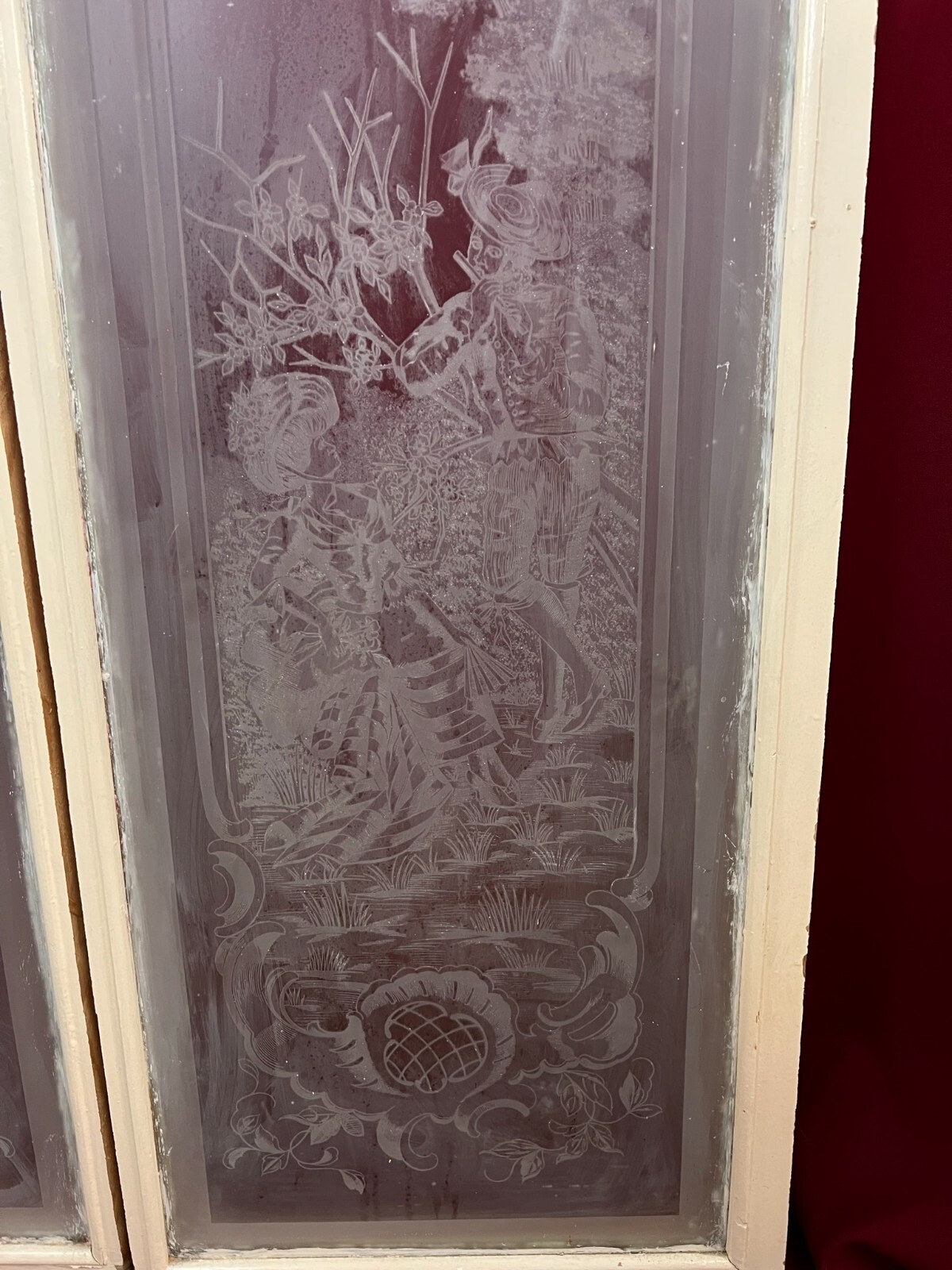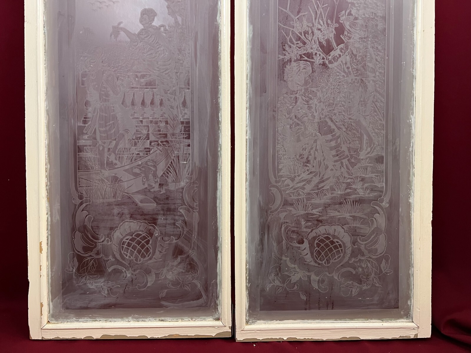 PAAR ANTIKE GLASSCHEIBEN JUGENDSTIL ORIGINAL UM 1900 PERSONEN BLUMEN