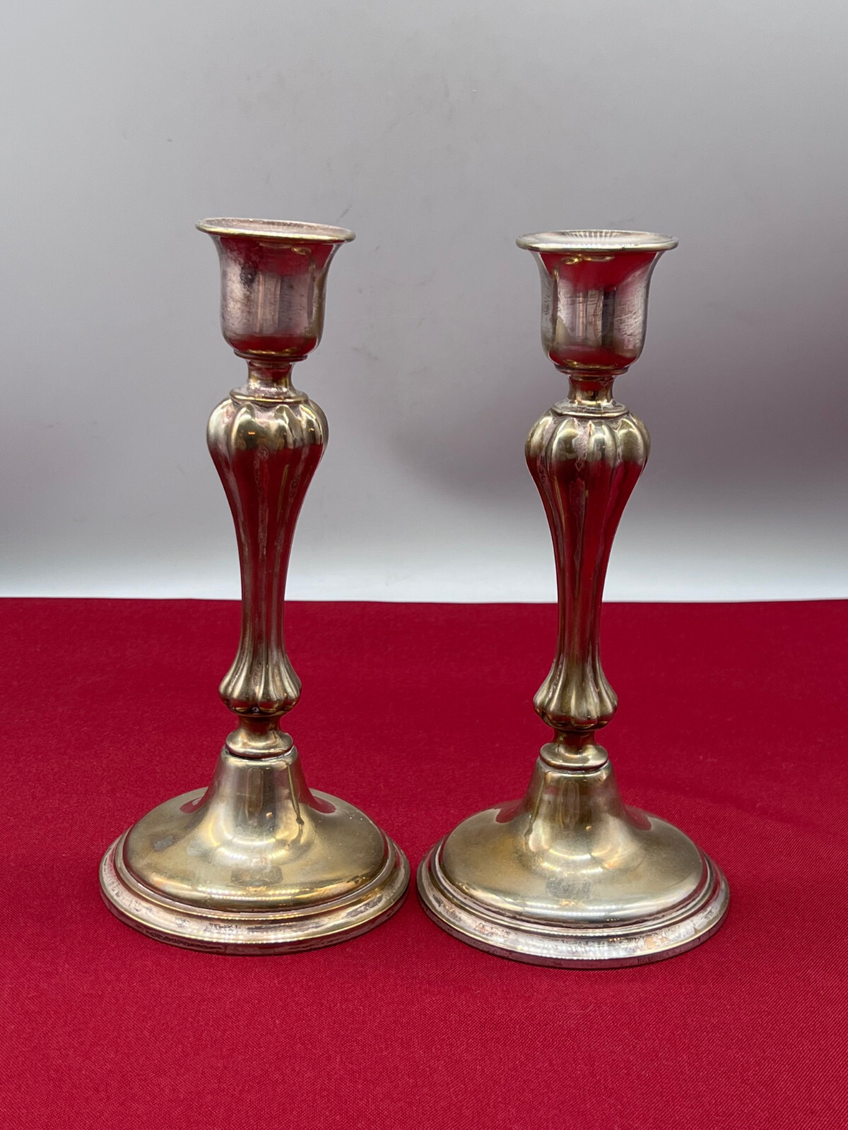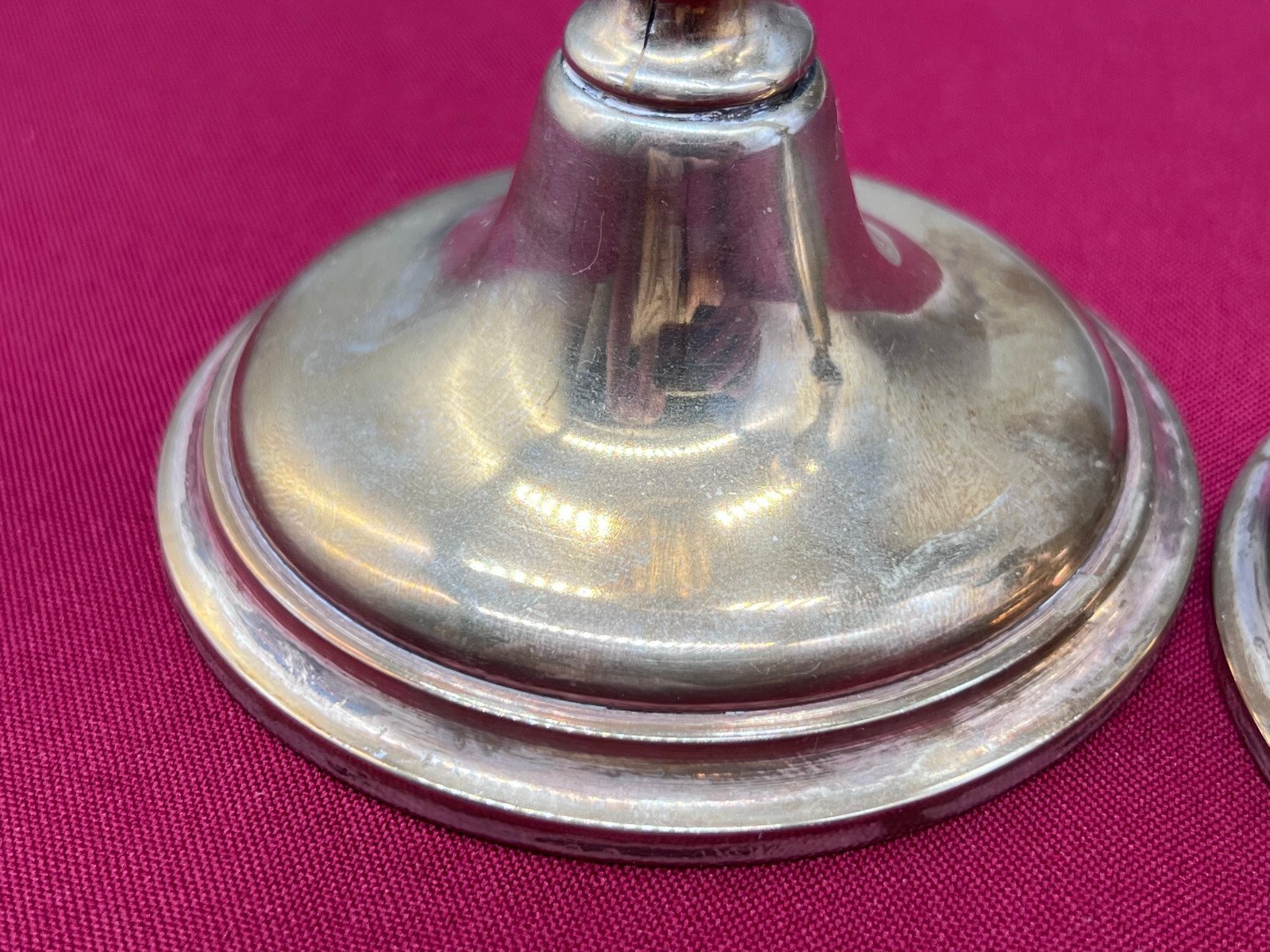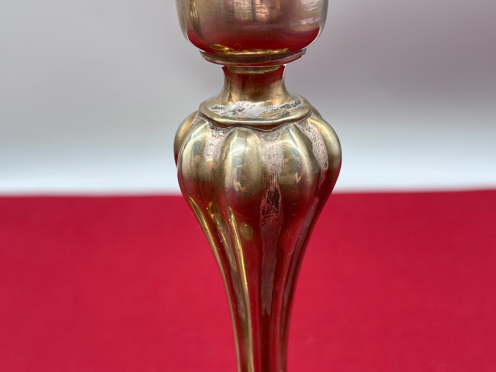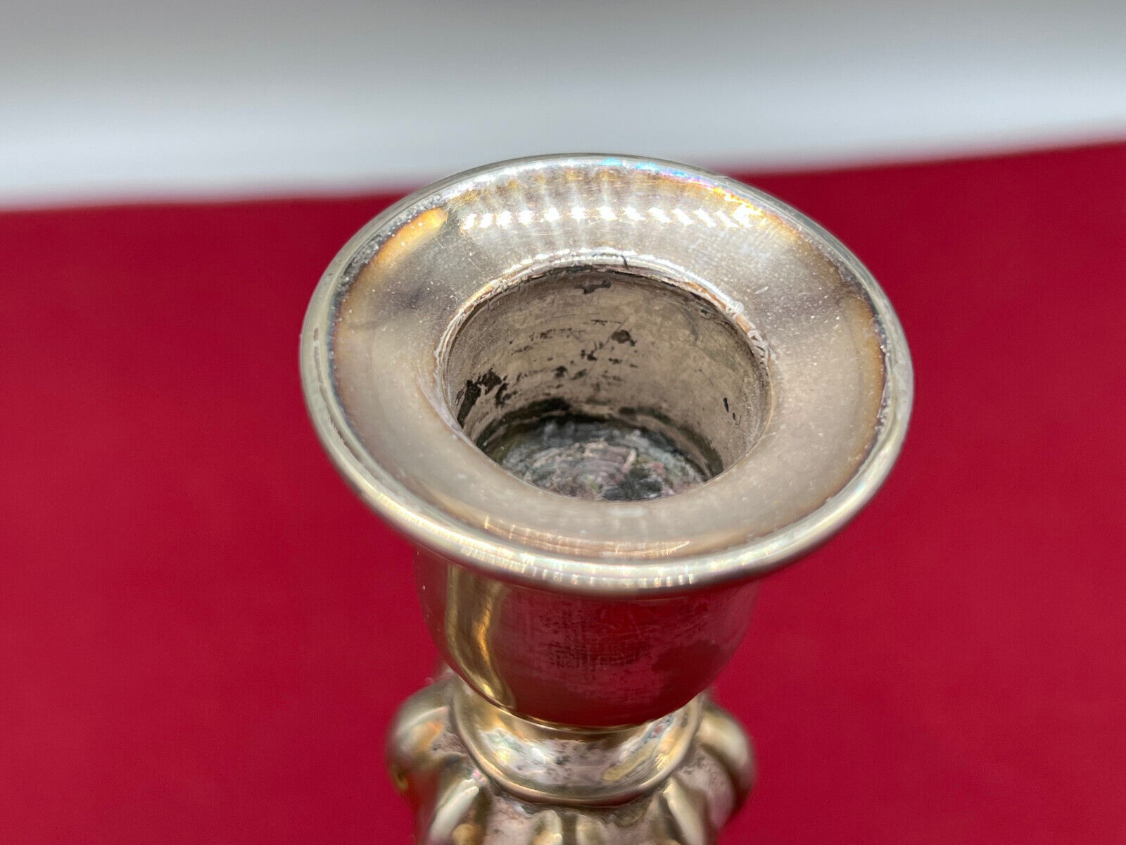 Paar antike Kerzenleuchter, versilbert, erste Hälfte 20-tes Jhdt. Oberflächenabrieb, kleinste Kratzer und minimalste Dellen. Höhe/Durchmesser 20,5/10cm.
