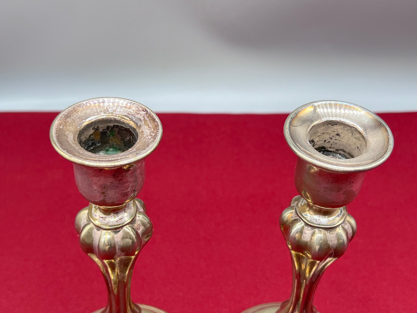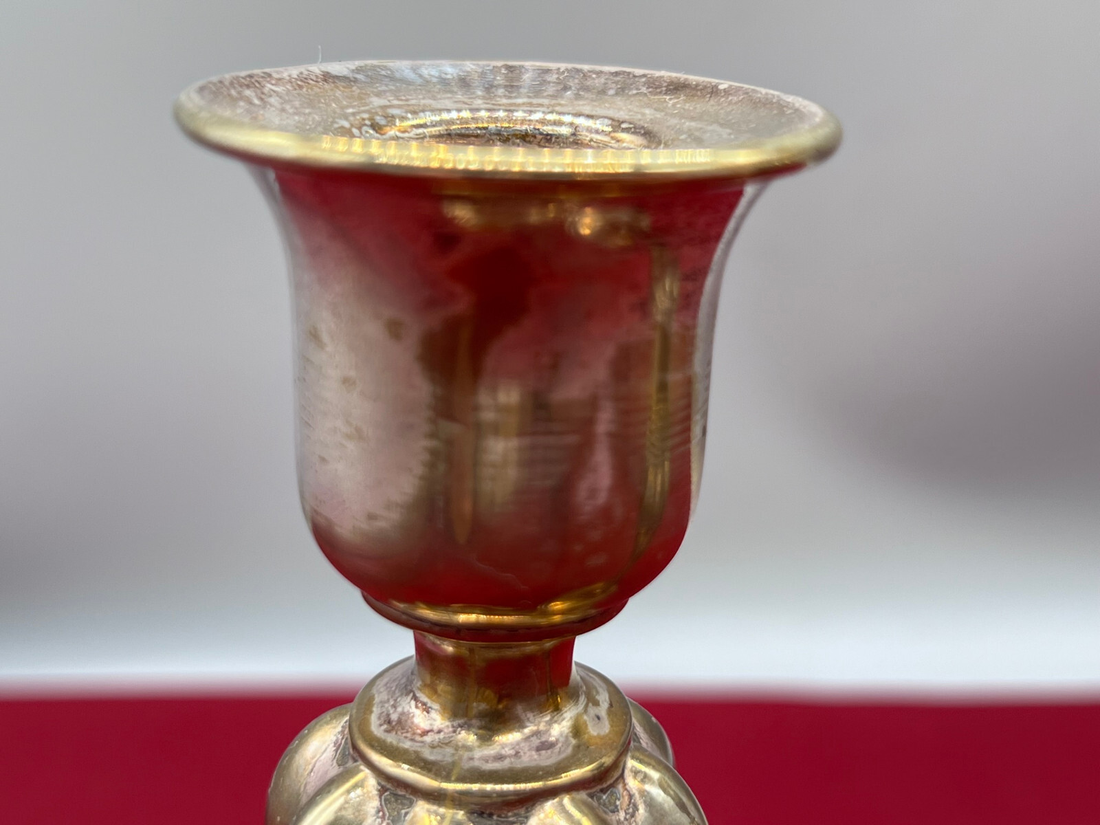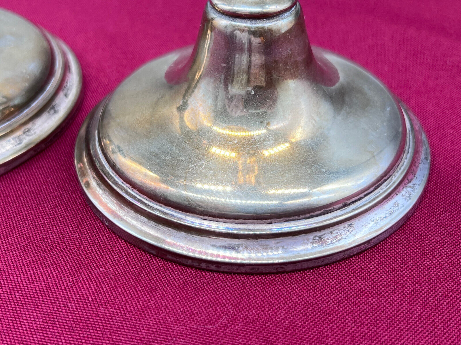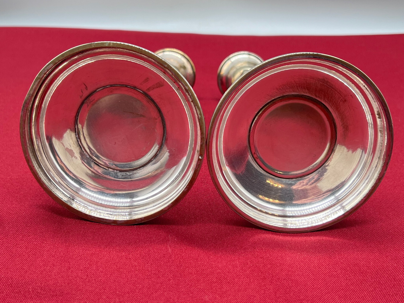 Paar antike Kerzenleuchter, versilbert, erste Hälfte 20-tes Jhdt. Oberflächenabrieb, kleinste Kratzer und minimalste Dellen. Höhe/Durchmesser 20,5/10cm.