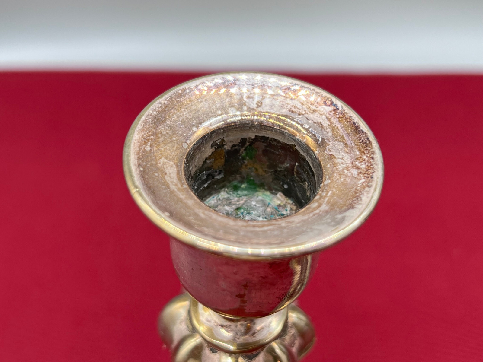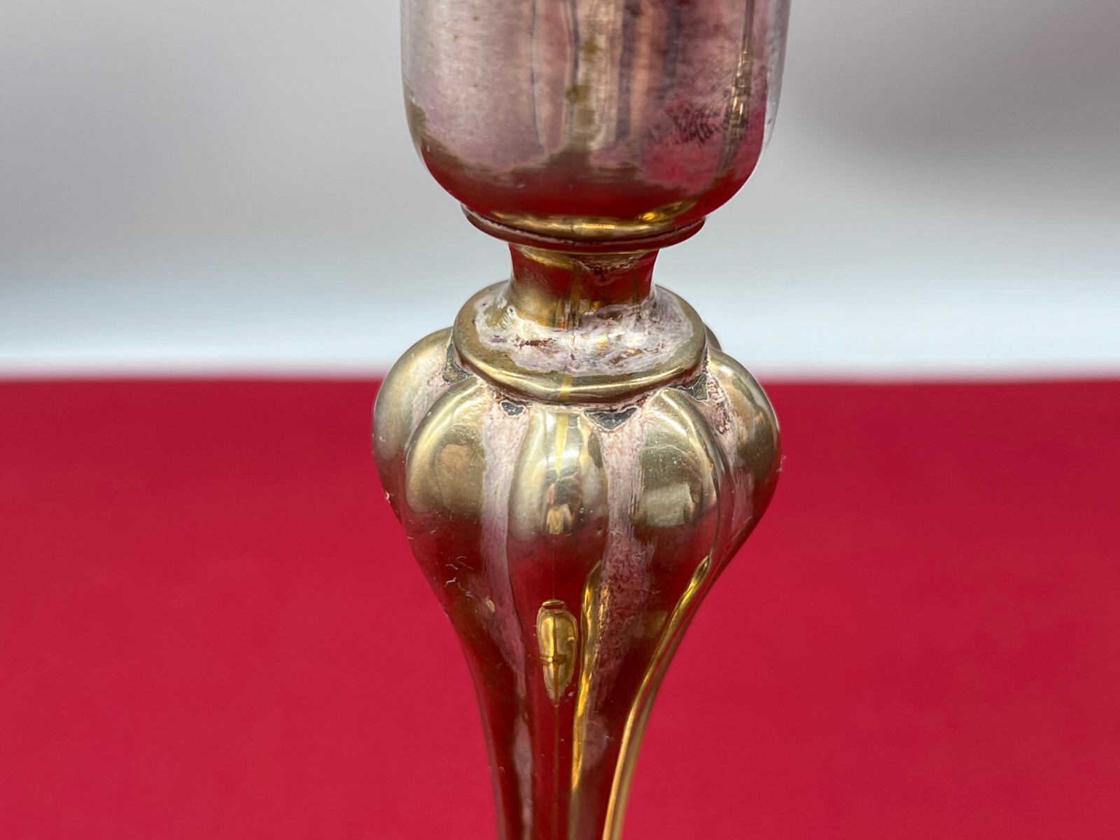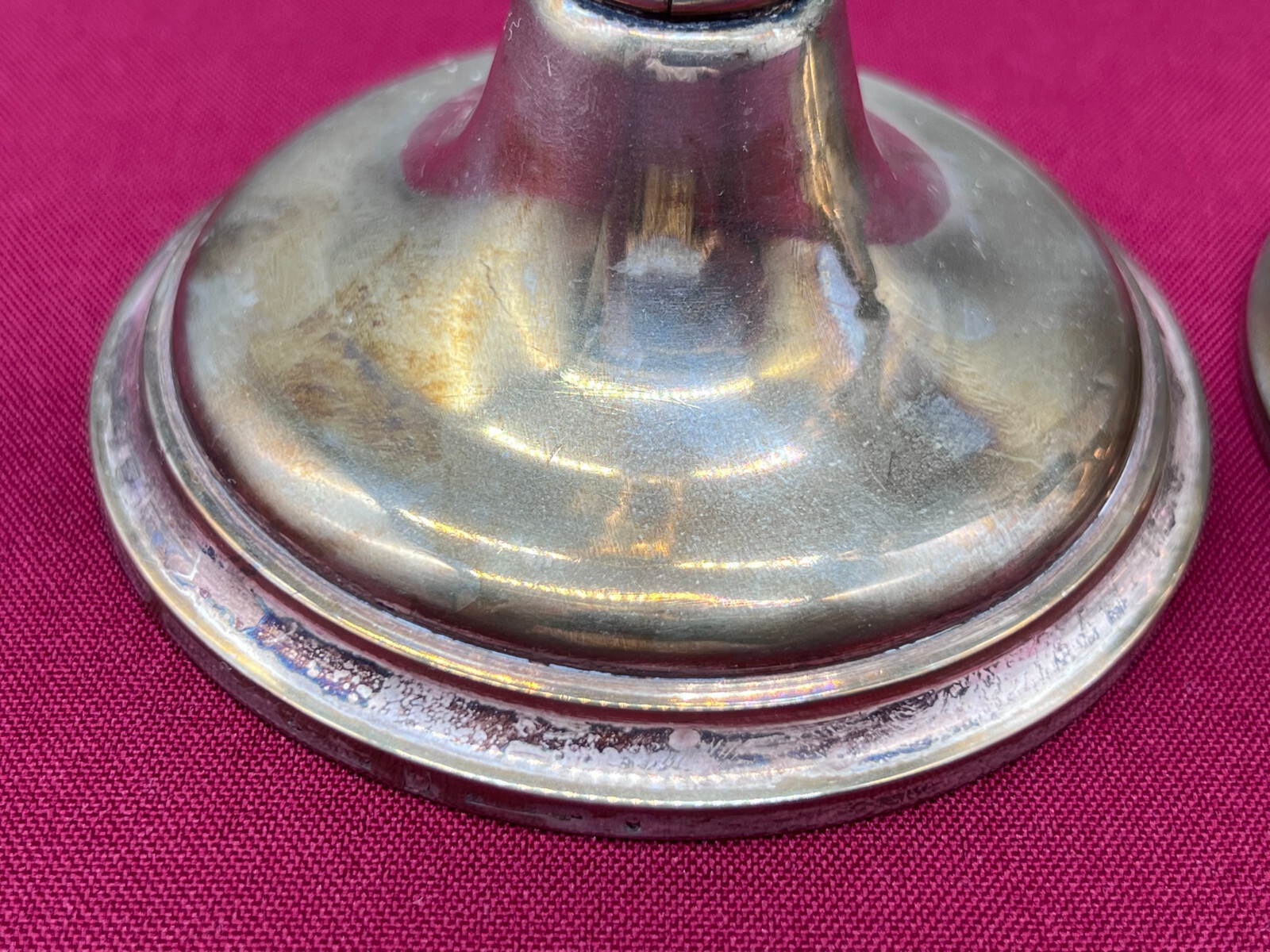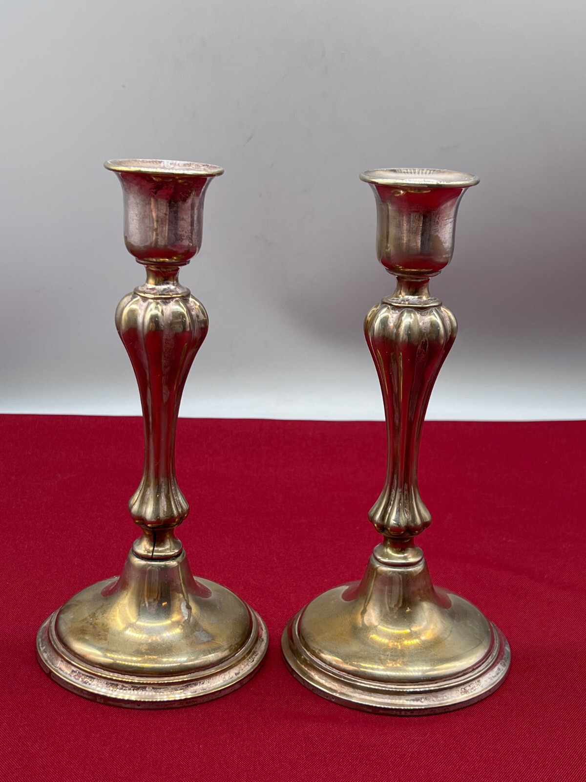 Paar antike Kerzenleuchter, versilbert, erste Hälfte 20-tes Jhdt. Oberflächenabrieb, kleinste Kratzer und minimalste Dellen. Höhe/Durchmesser 20,5/10cm.