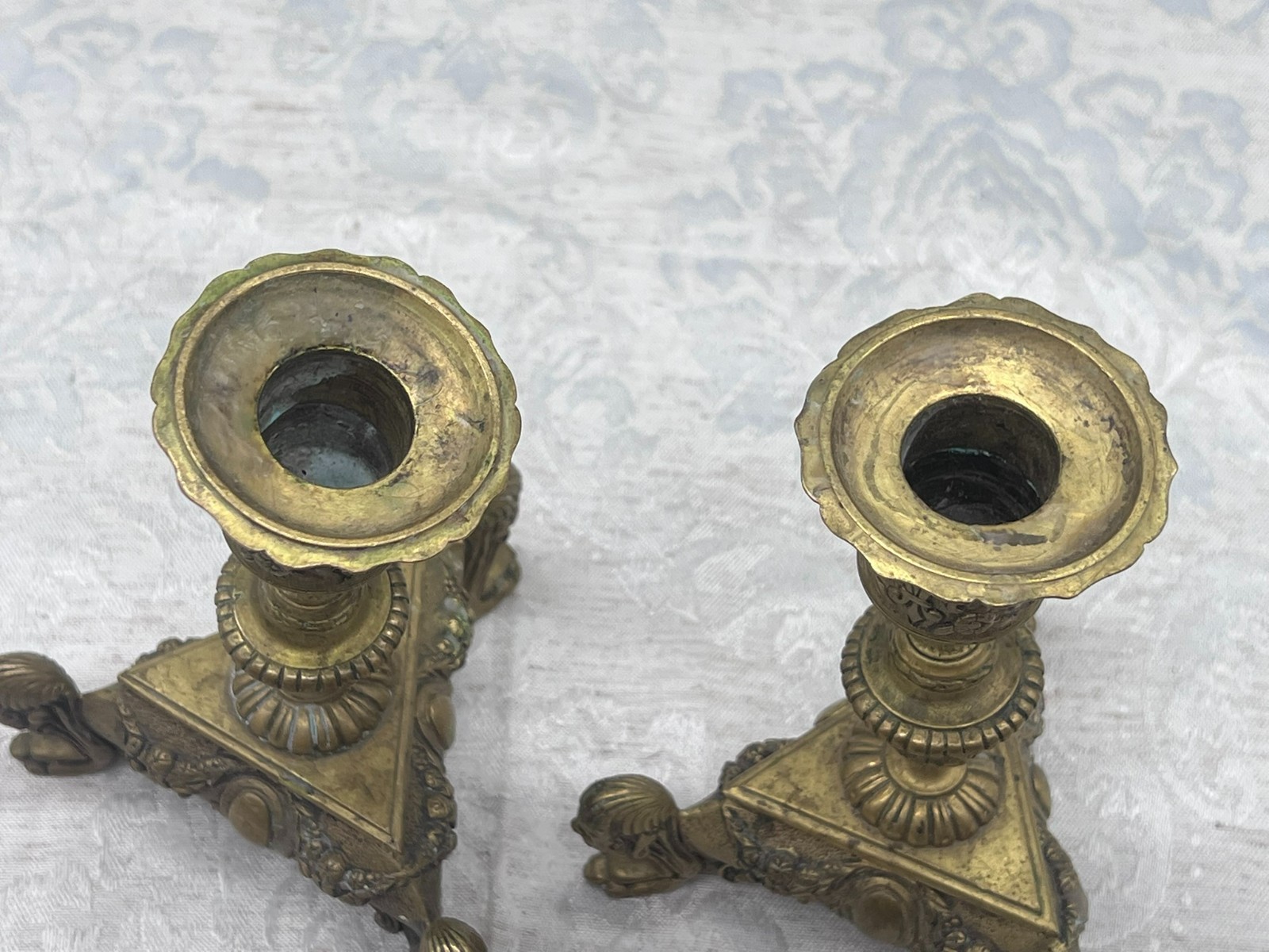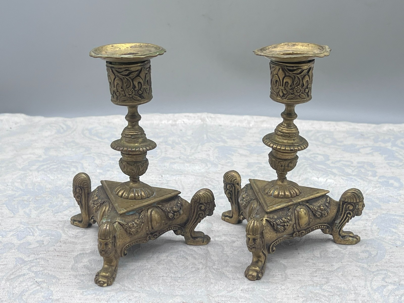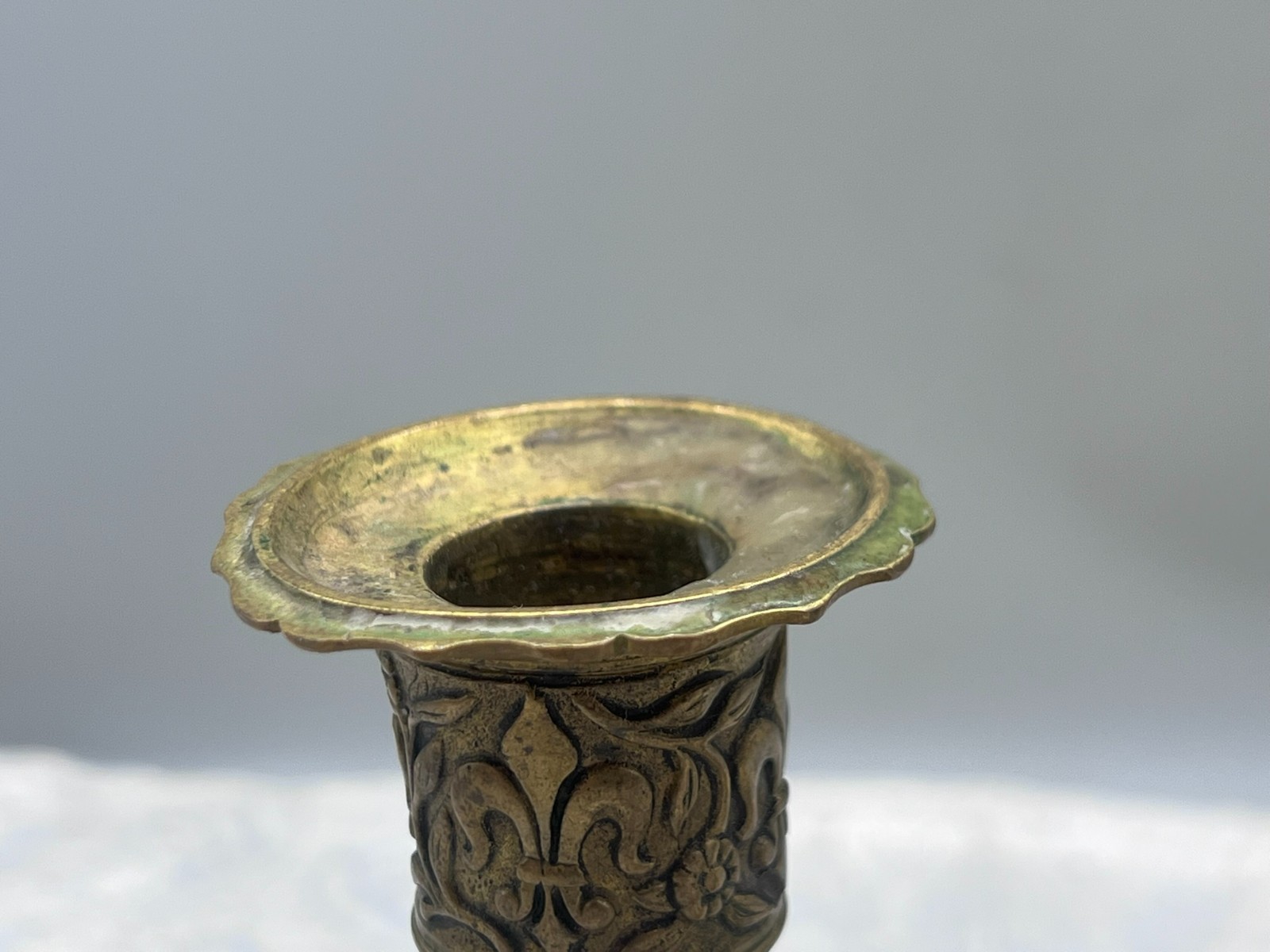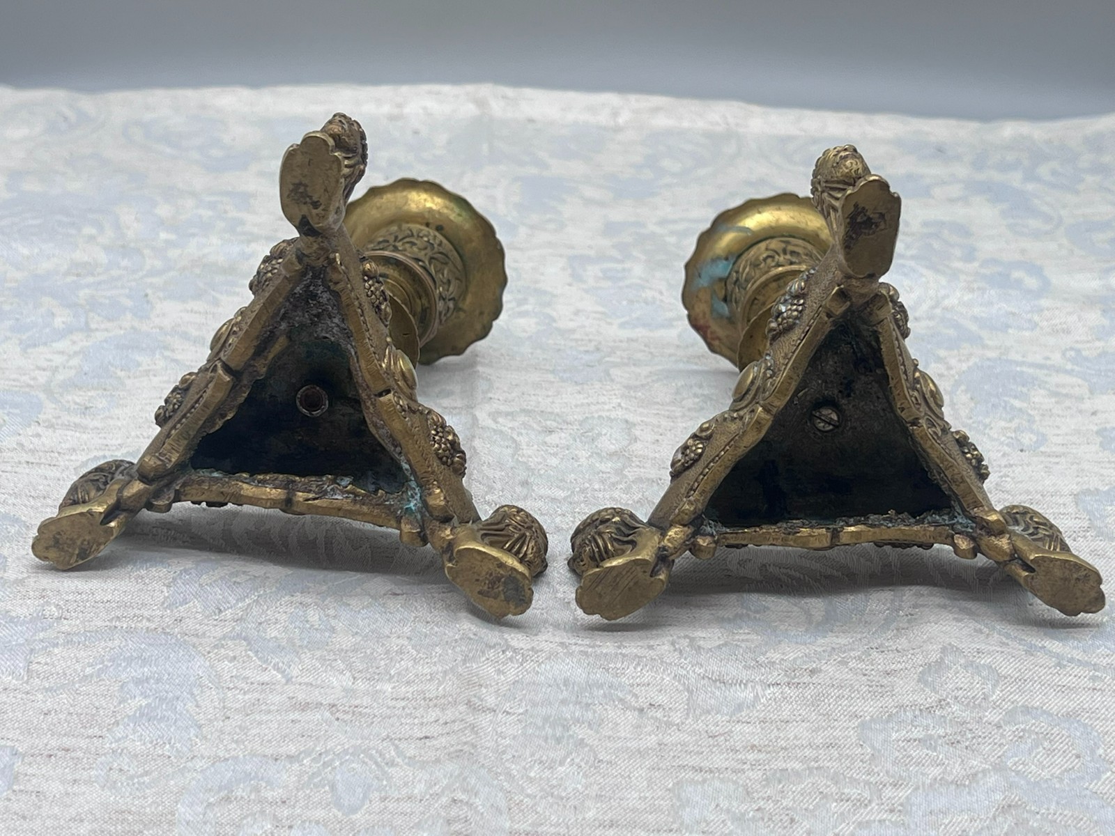 Paar antike Kerzenleuchter aus Messing beide zum Teil verbogen, Oberfläche angelaufen und berieben, Spuren von Wachs. Gesamtgewicht 1,2kg, Abmessungen BTH 11/11/15,5cm.