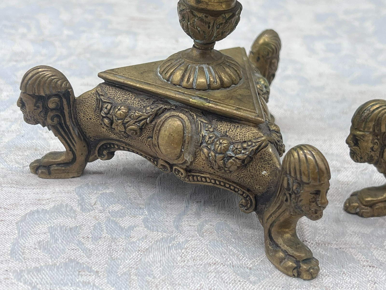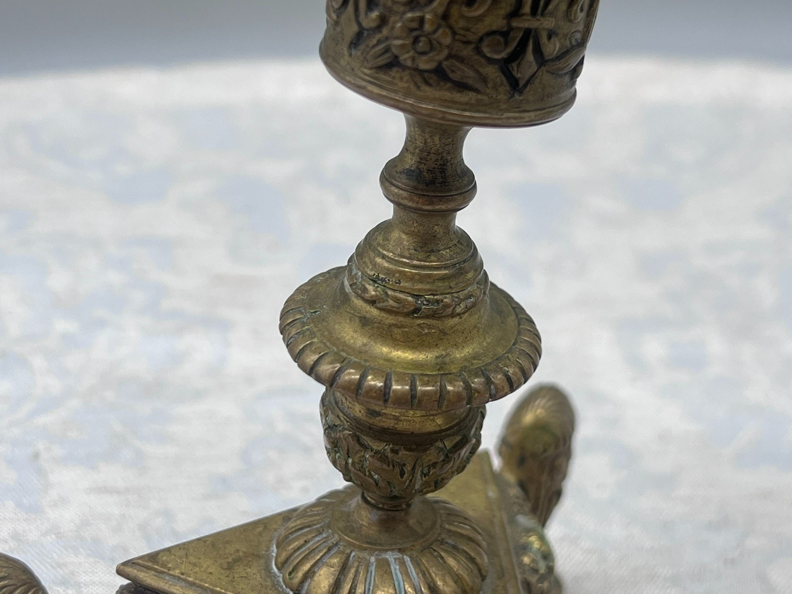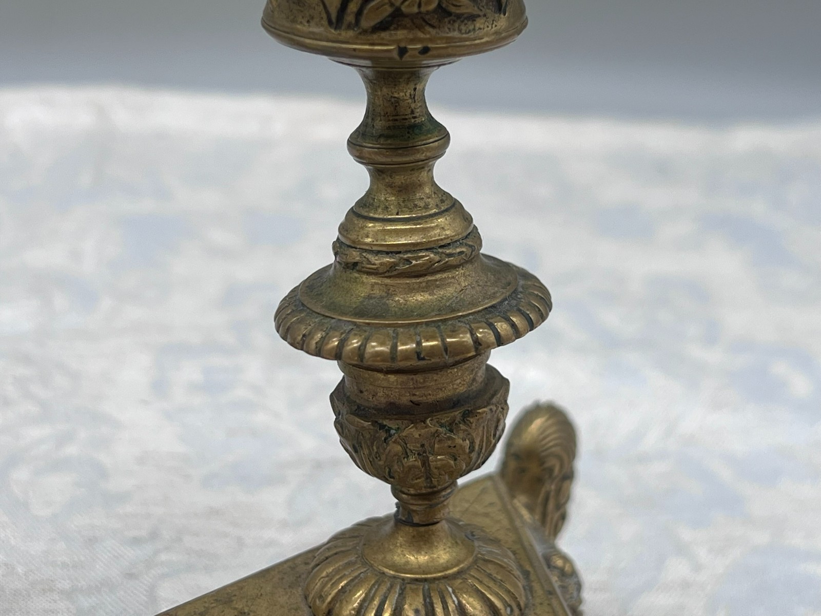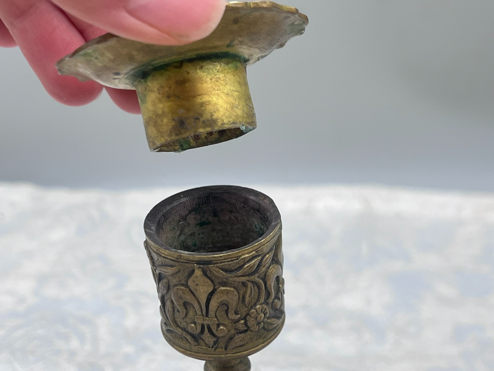 Paar antike Kerzenleuchter aus Messing beide zum Teil verbogen, Oberfläche angelaufen und berieben, Spuren von Wachs. Gesamtgewicht 1,2kg, Abmessungen BTH 11/11/15,5cm.