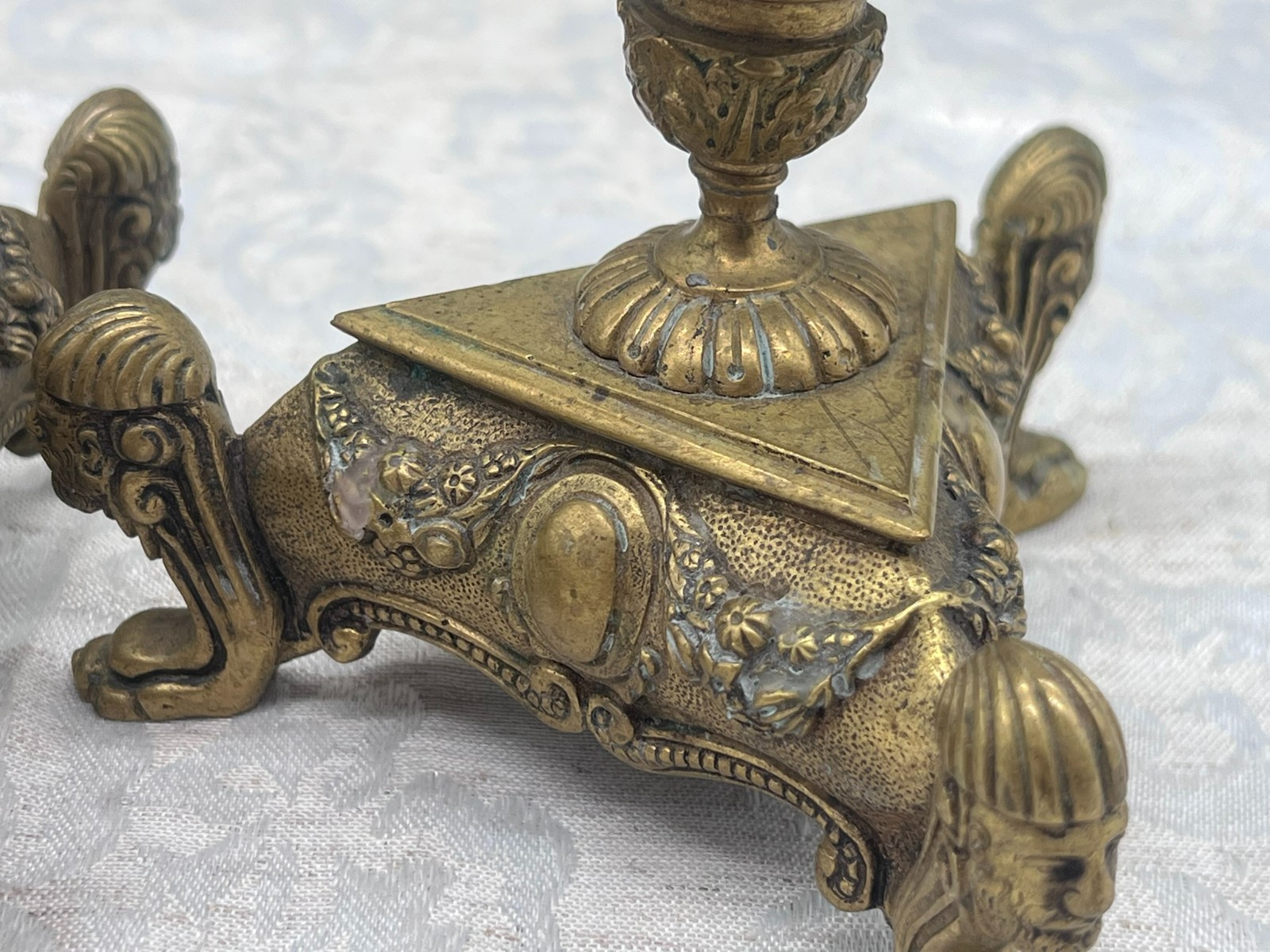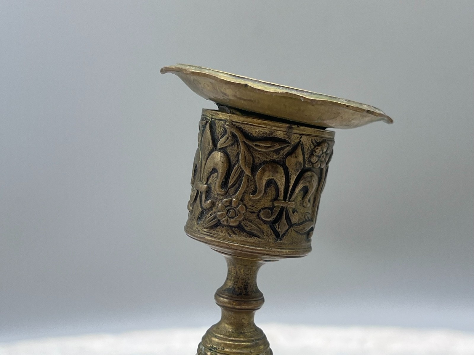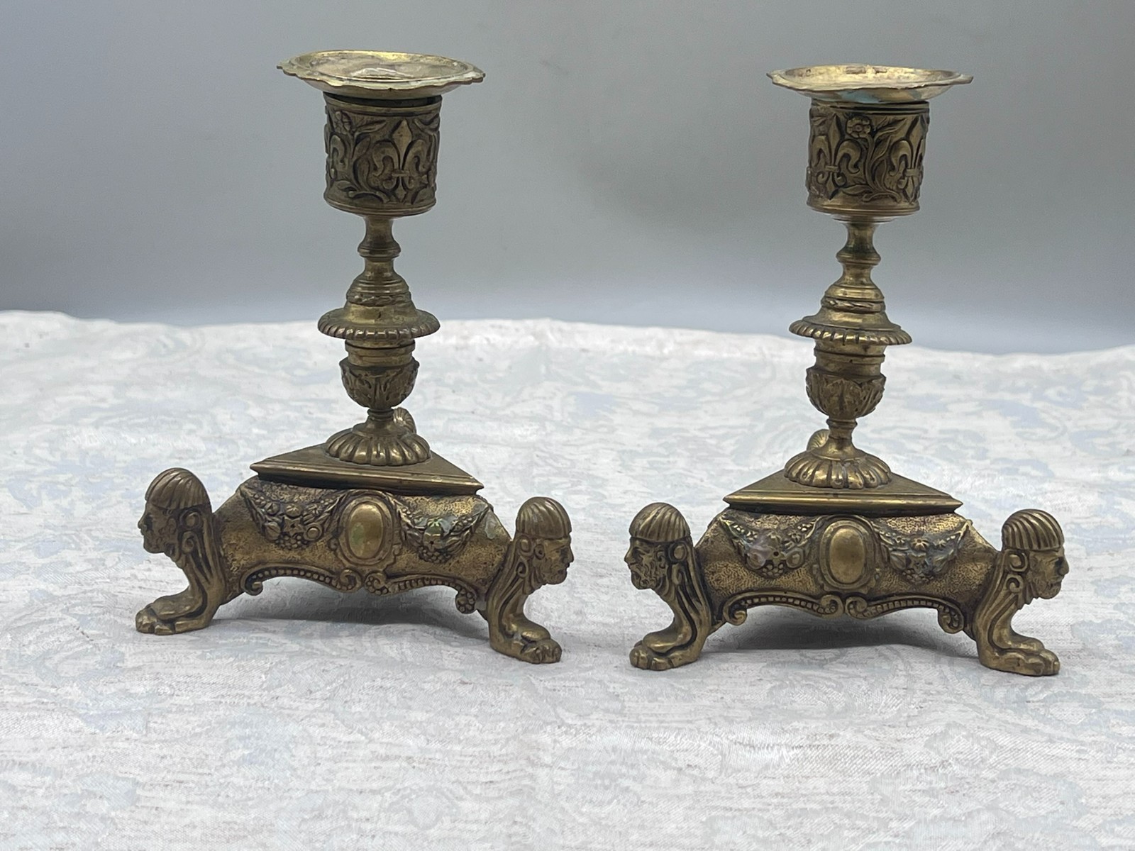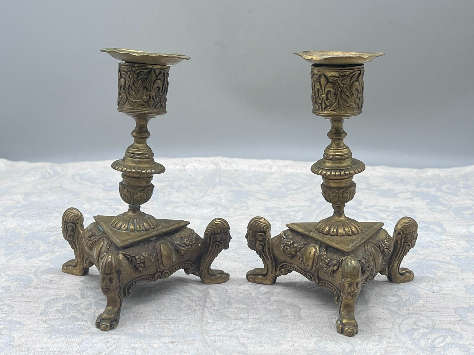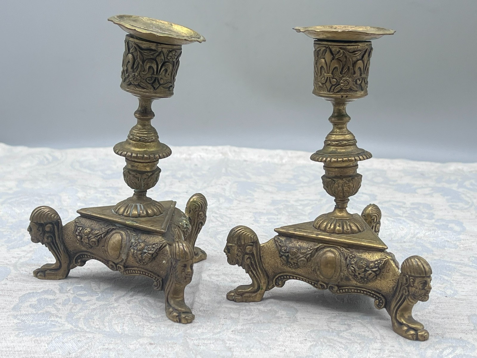 Paar antike Kerzenleuchter aus Messing beide zum Teil verbogen, Oberfläche angelaufen und berieben, Spuren von Wachs. Gesamtgewicht 1,2kg, Abmessungen BTH 11/11/15,5cm.
