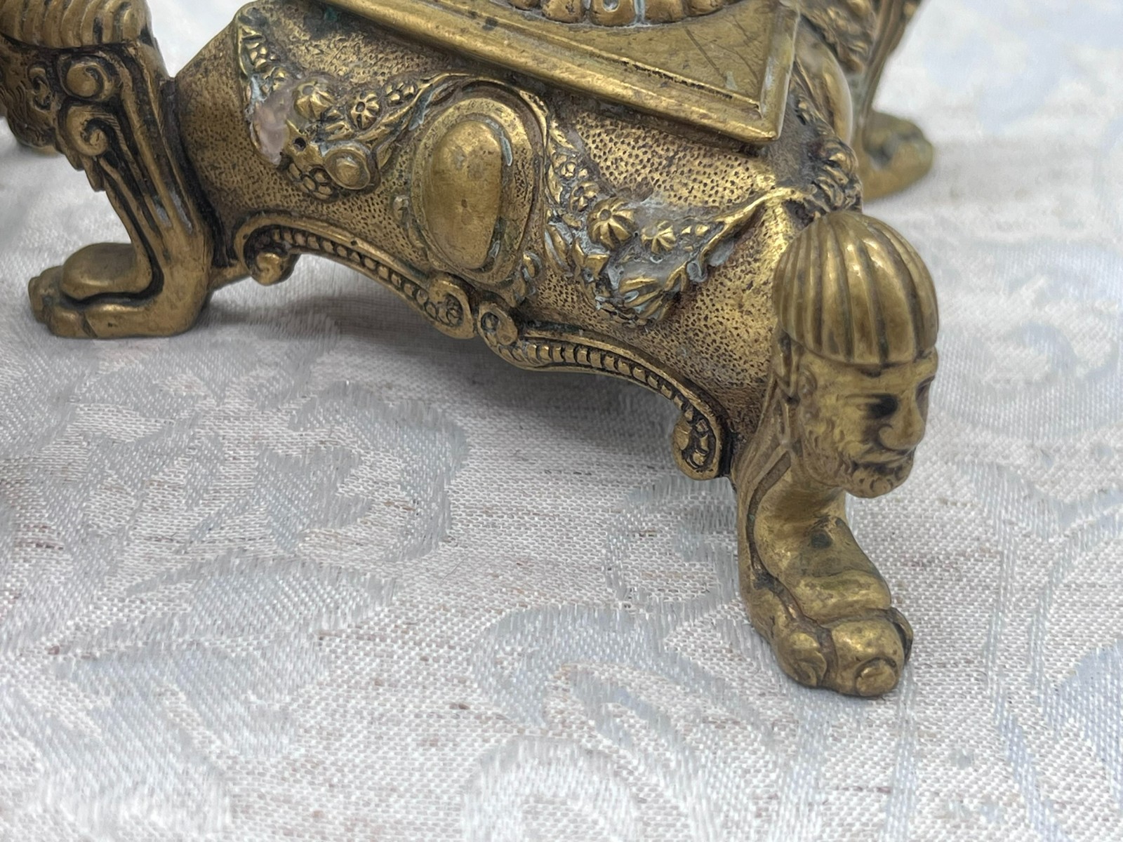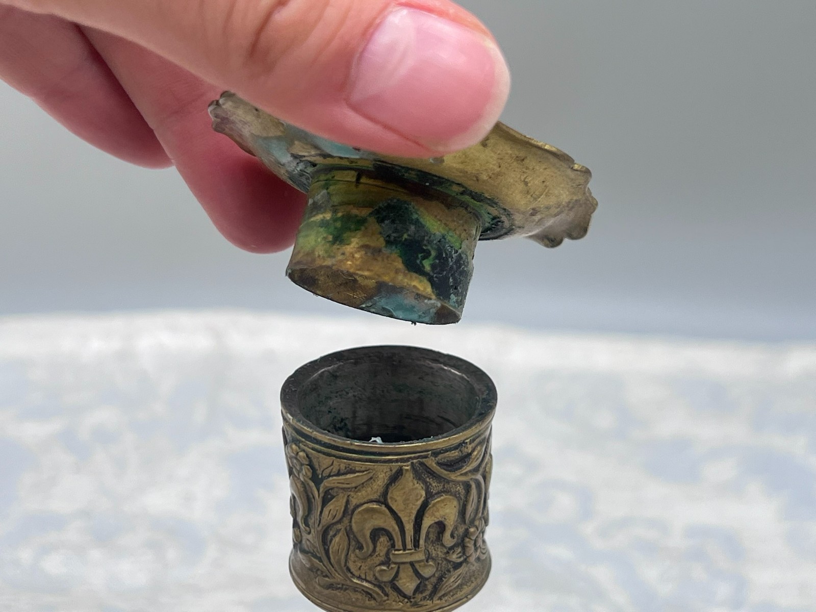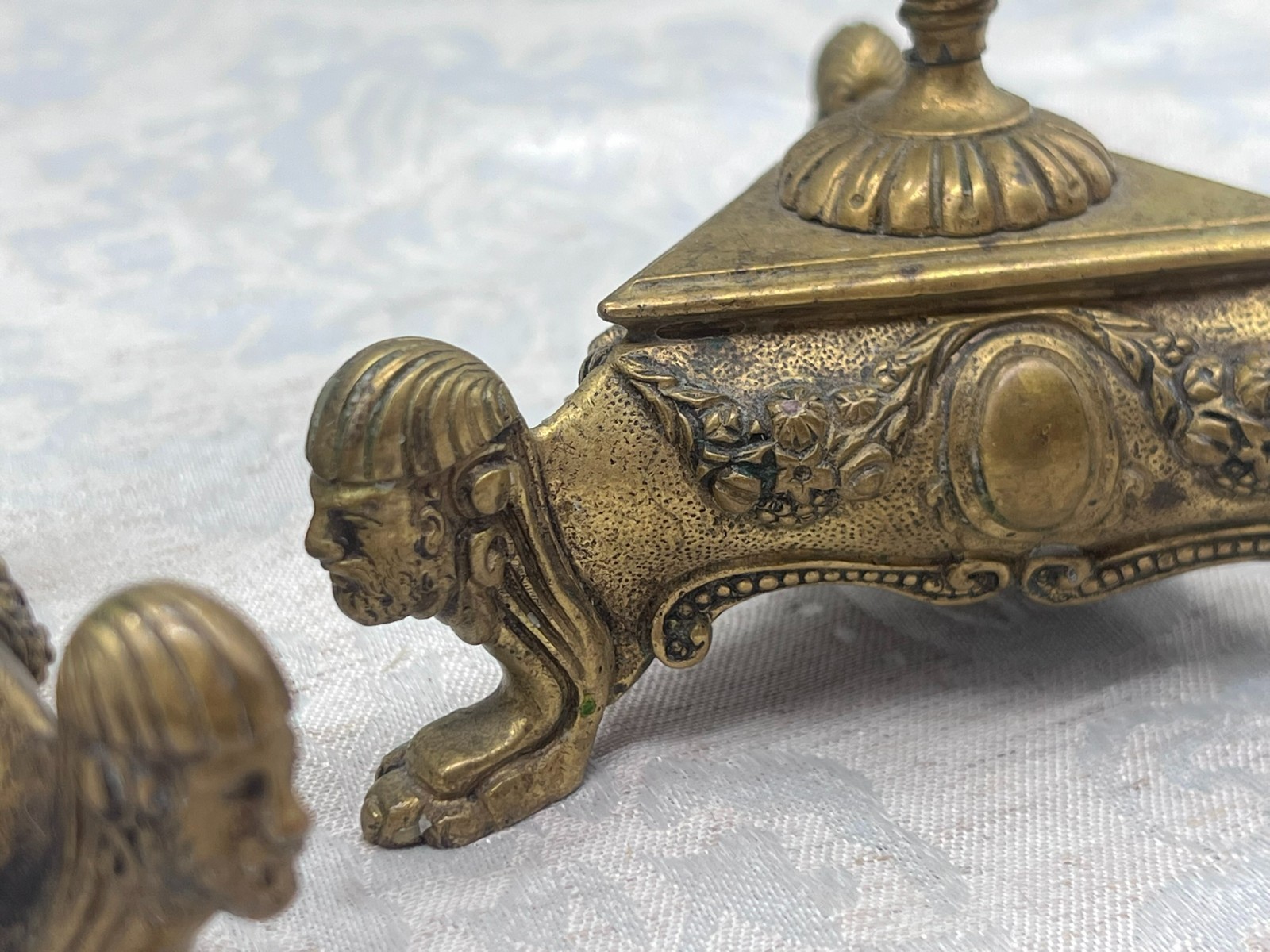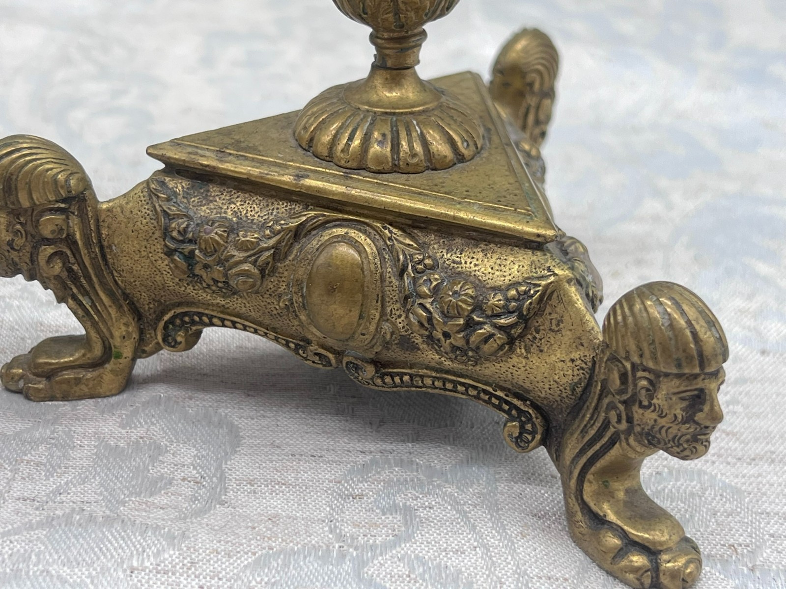 Paar antike Kerzenleuchter aus Messing beide zum Teil verbogen, Oberfläche angelaufen und berieben, Spuren von Wachs. Gesamtgewicht 1,2kg, Abmessungen BTH 11/11/15,5cm.